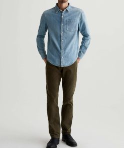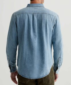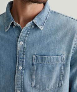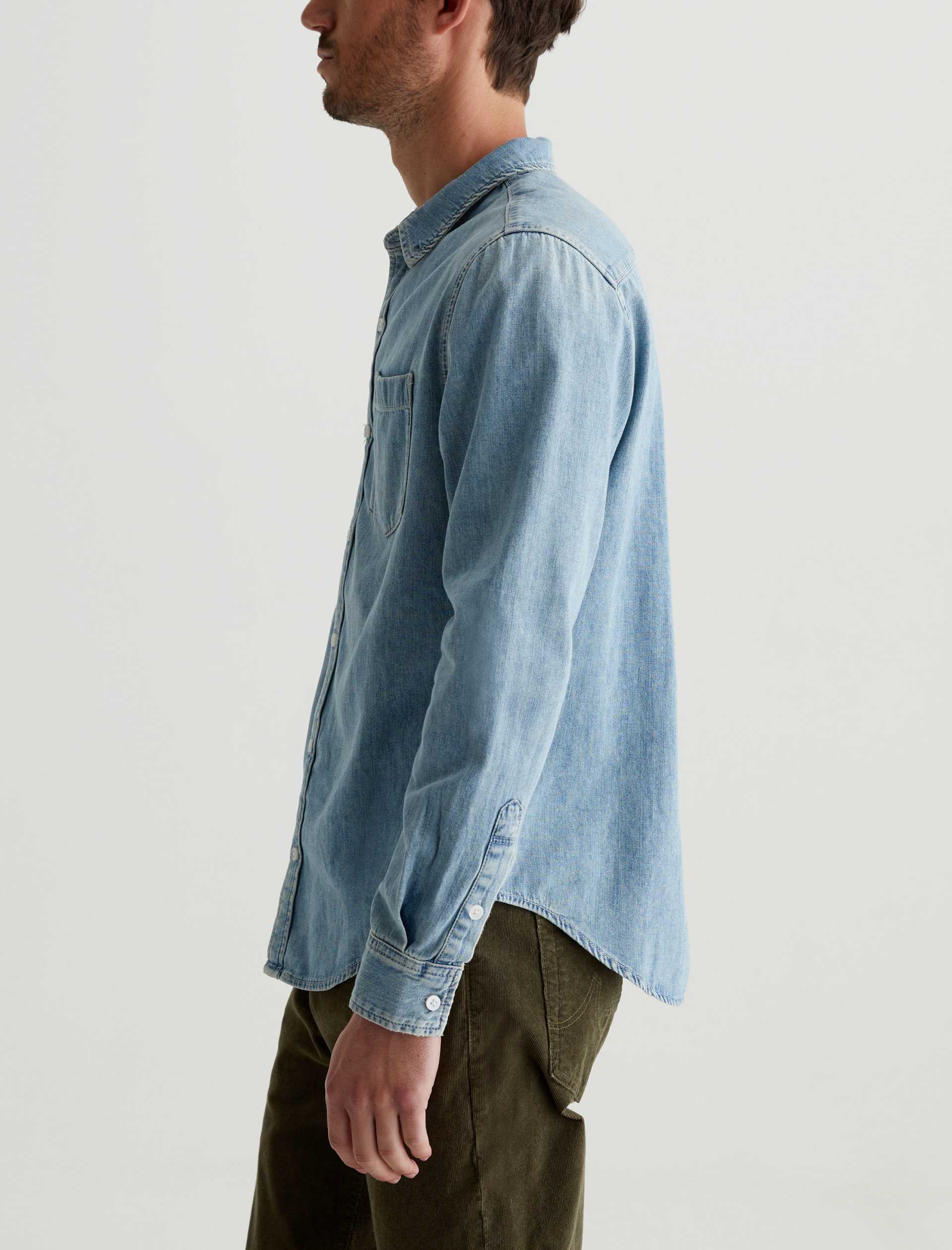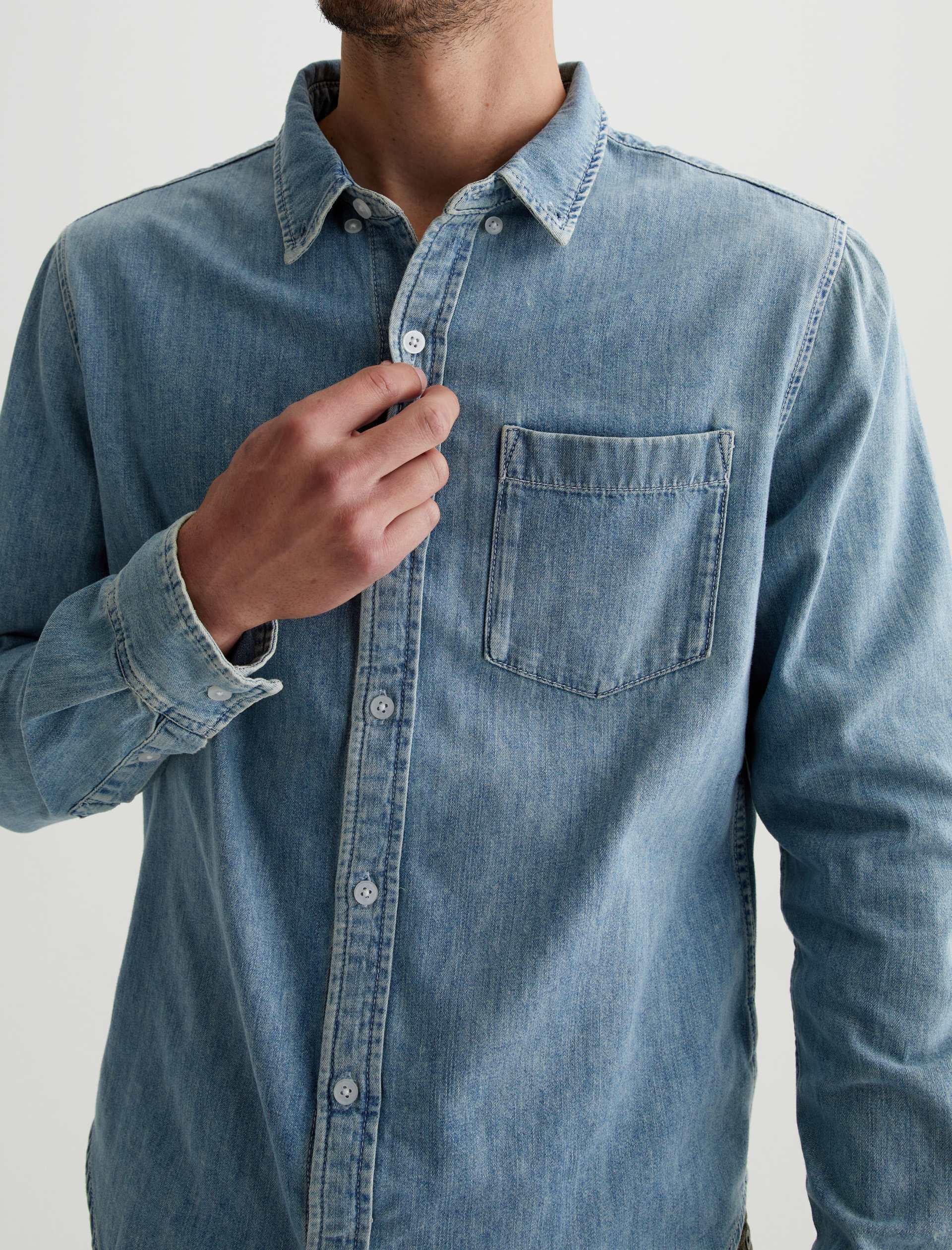 The Aiden Classic Shirt for men features a light denim wash. The Aiden Classic Shirt features a single front chest pocket, gentle fading, and white buttons, designed in a comfortable and lightweight Cove Denim.