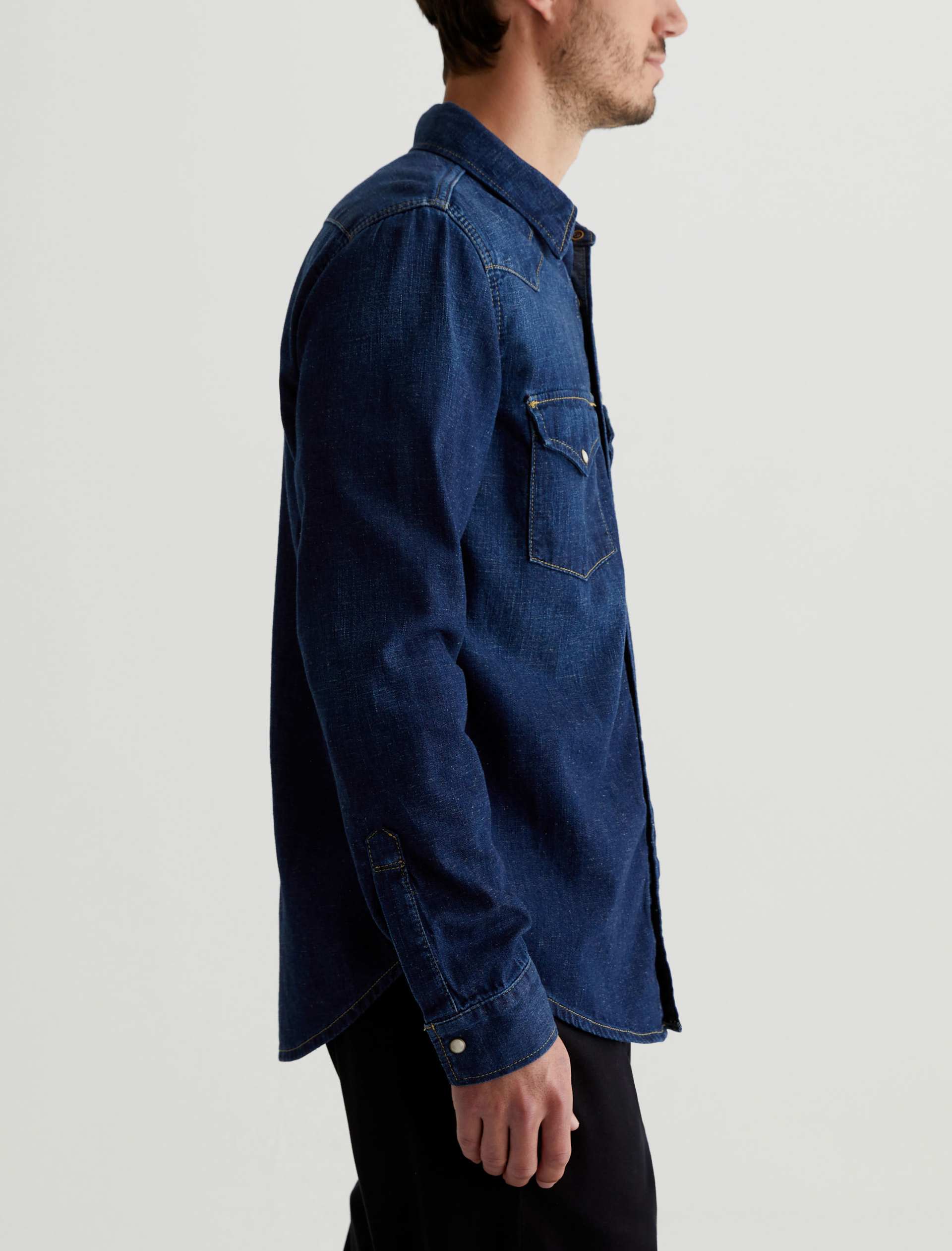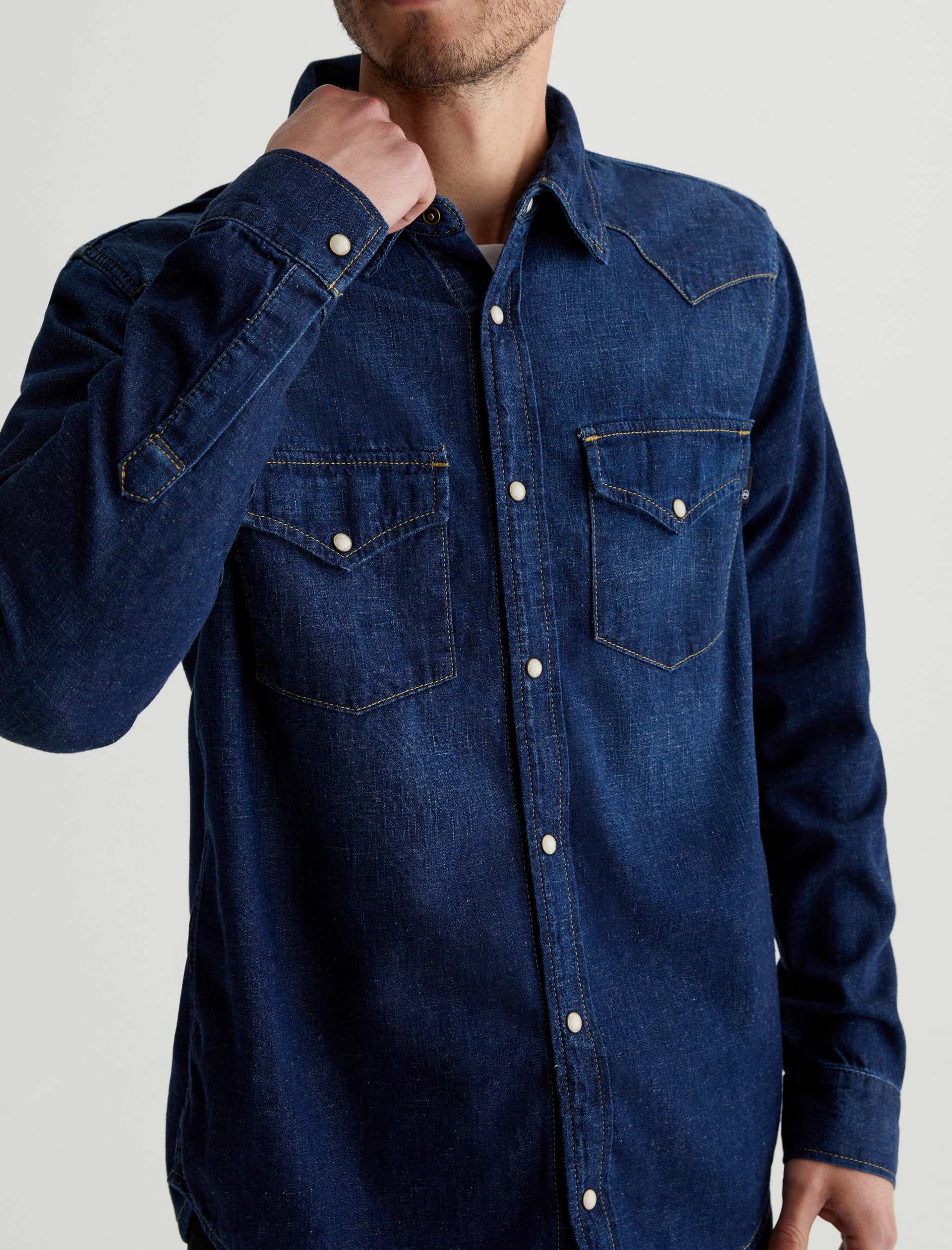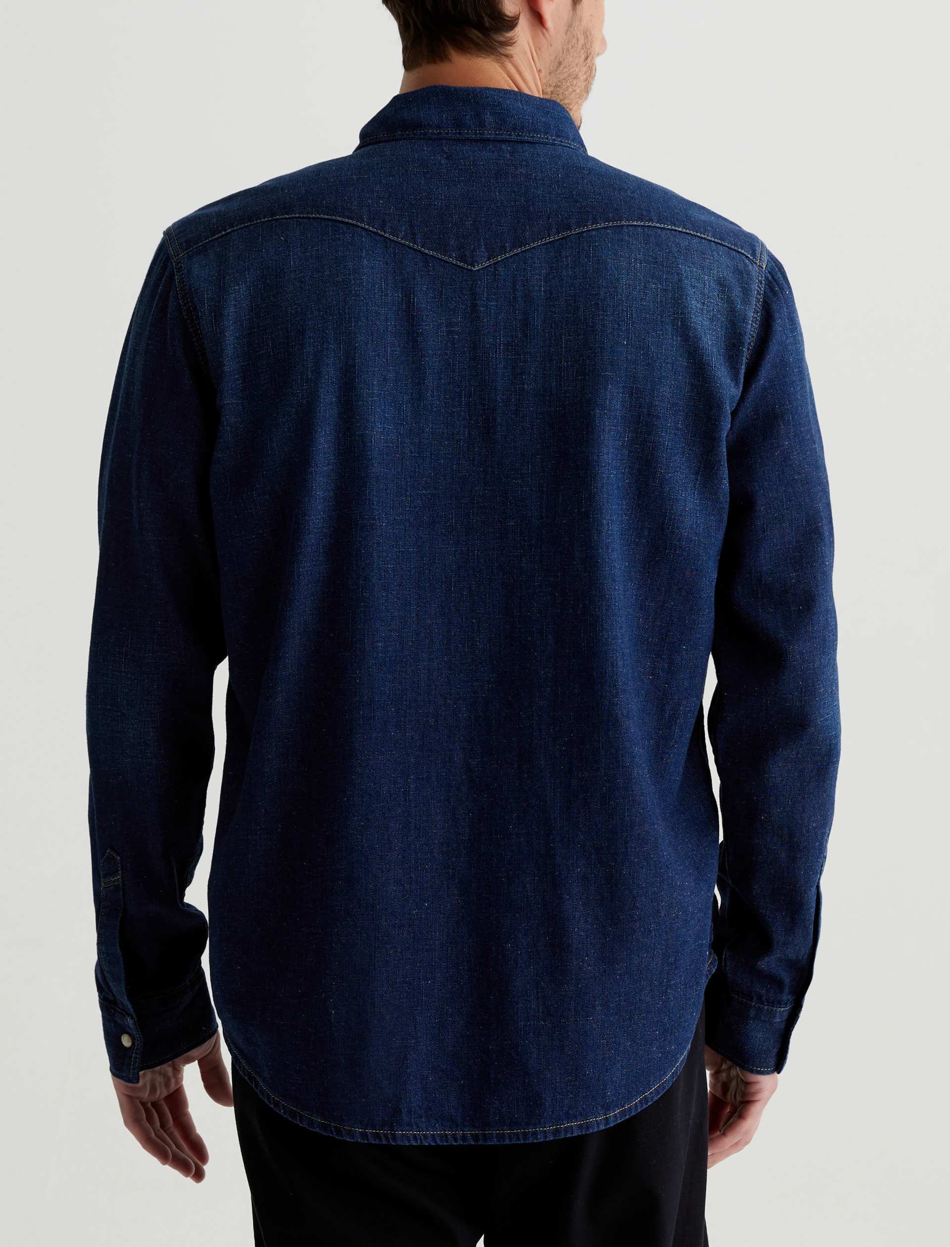 The Aiden Western Shirt for men features a clean, bright medium indigo wash in a timeless long-sleeve silhouette. True to its name, this classic denim shirt has vintage western-style details—angled shoulder panels, flap pockets at the front, and snap buttons throughout. It’s crafted from lightweight Heritage 2×1 Denim