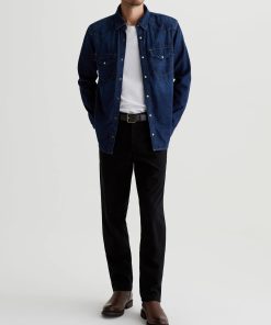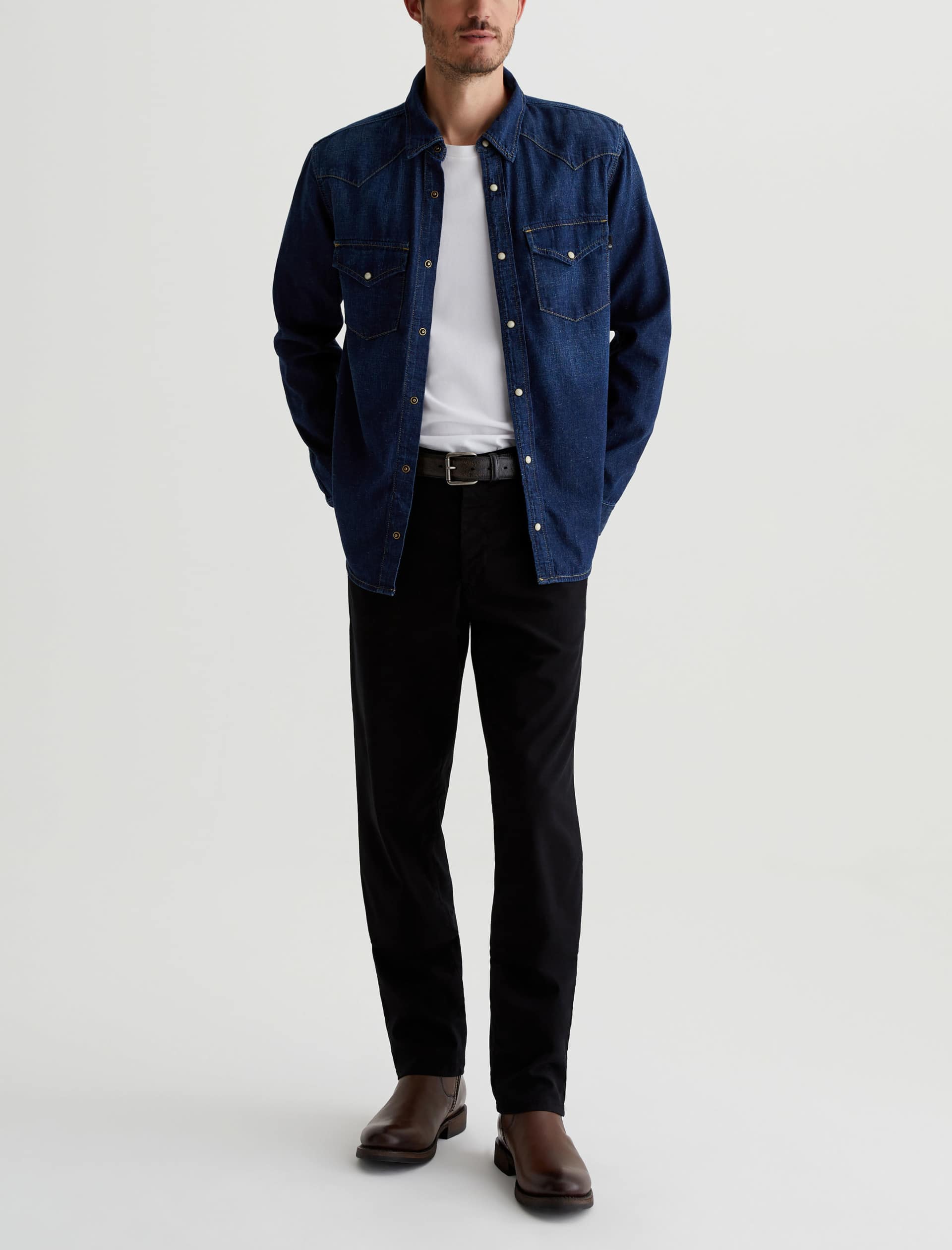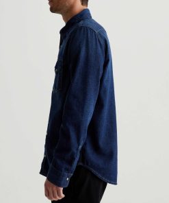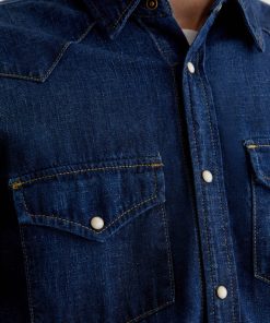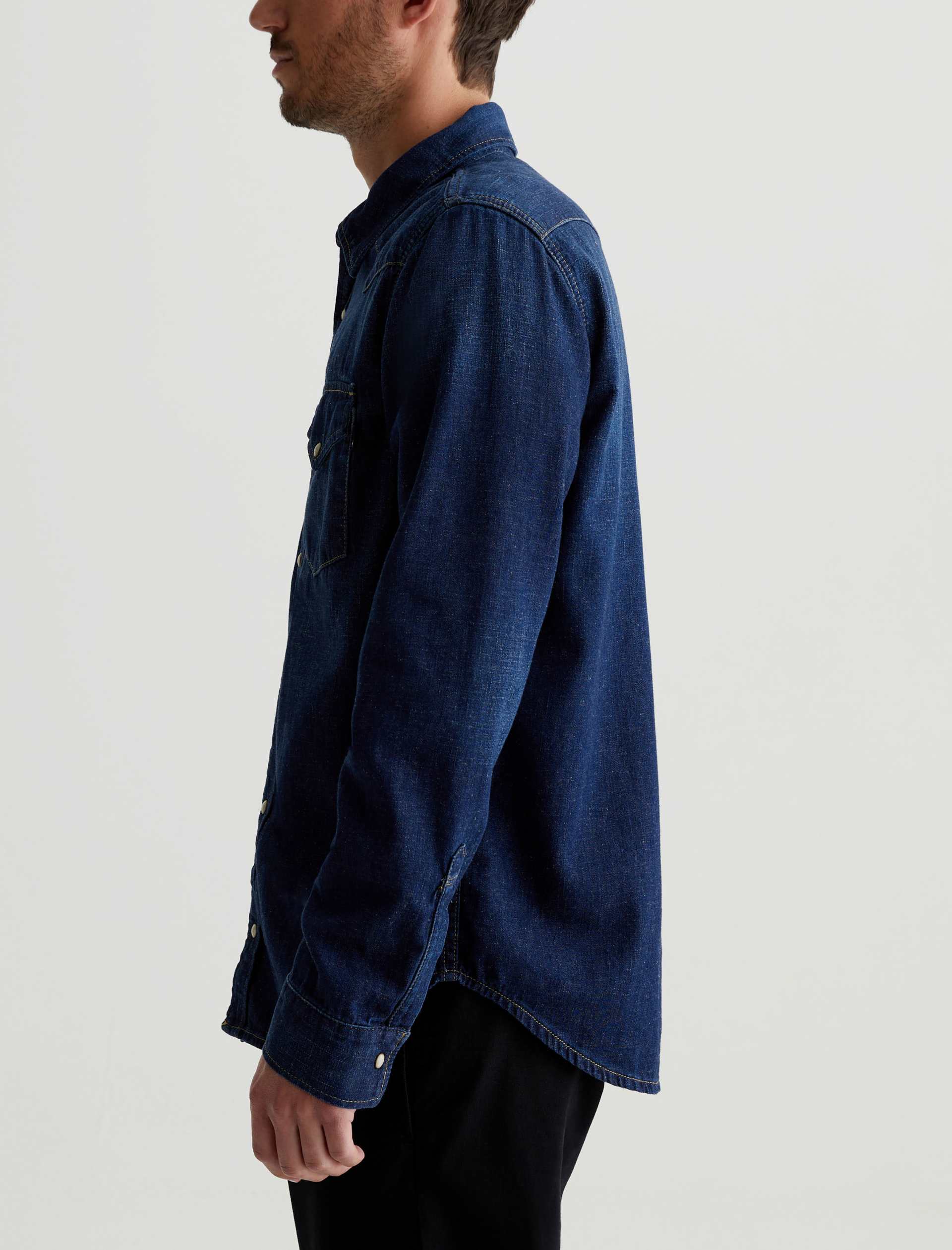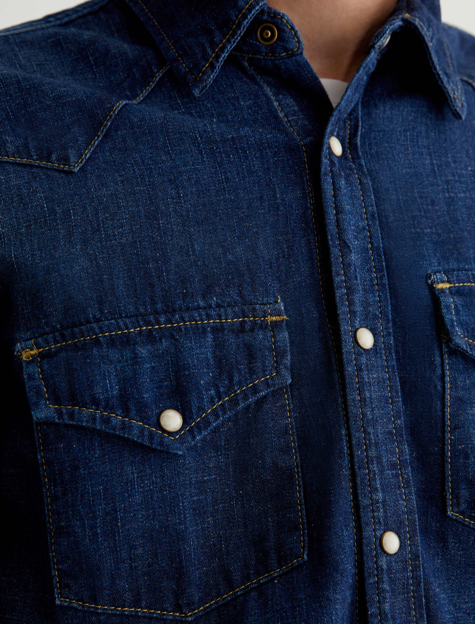 The Aiden Western Shirt for men features a clean, bright medium indigo wash in a timeless long-sleeve silhouette. True to its name, this classic denim shirt has vintage western-style details—angled shoulder panels, flap pockets at the front, and snap buttons throughout. It’s crafted from lightweight Heritage 2×1 Denim