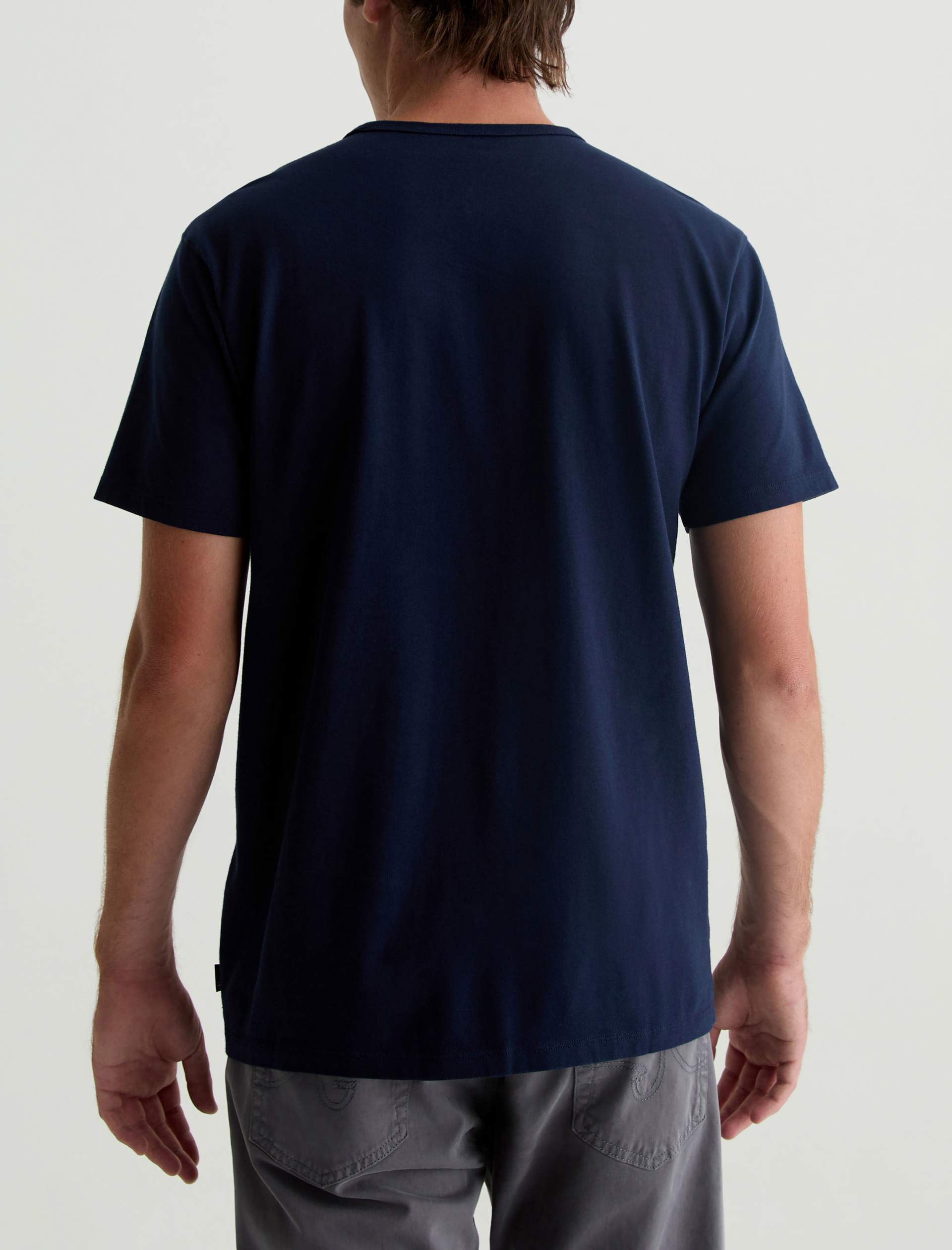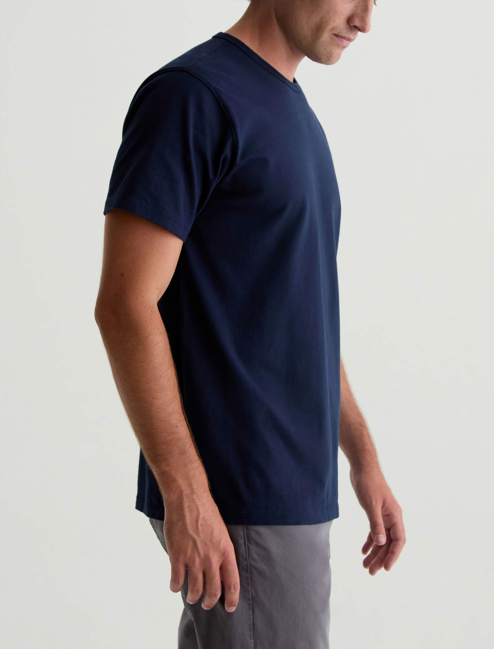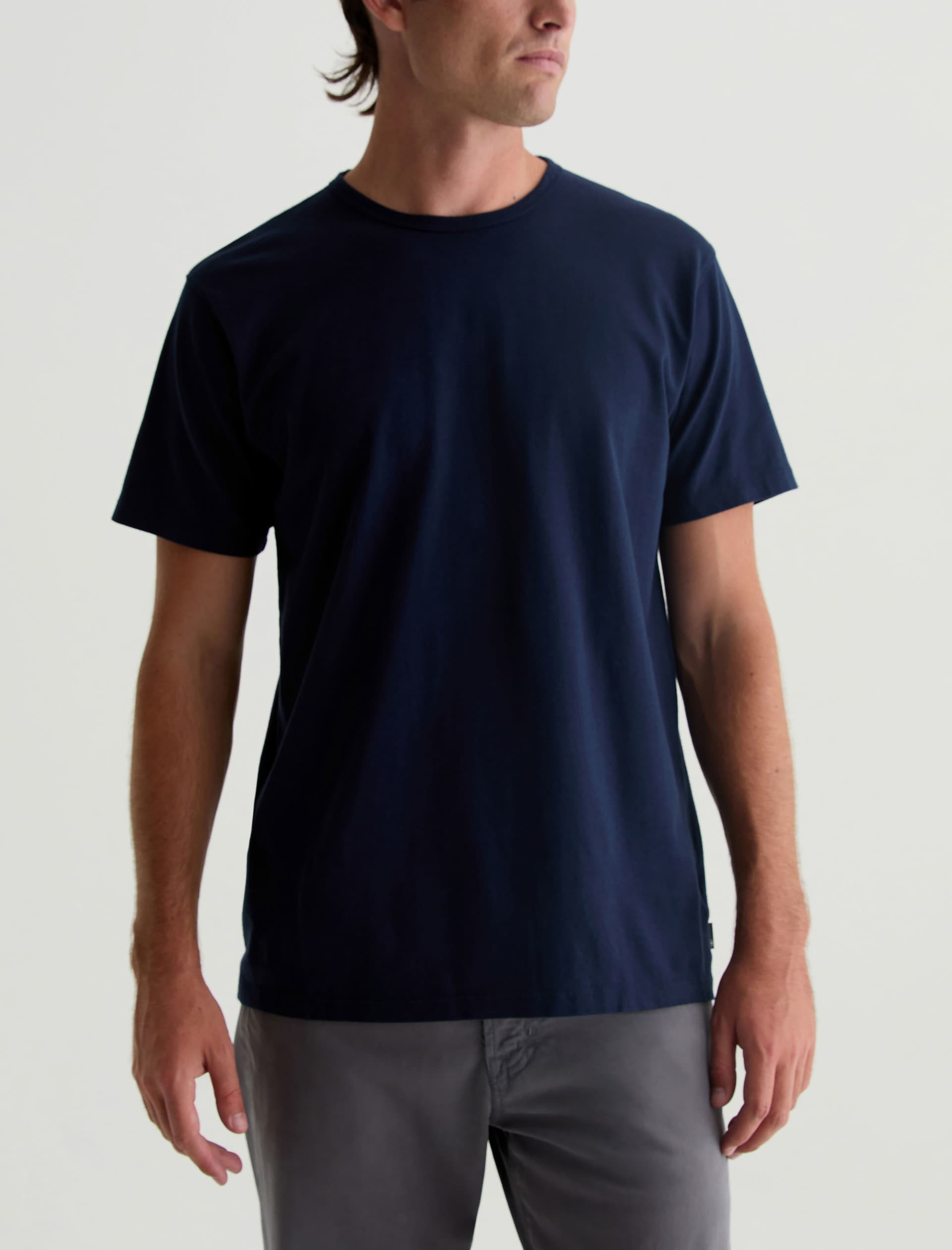 The Bryce Crew in deep navy is a classic fit crewneck, short sleeve tee. The tee offers a 1X1 baby rib at the neck to create a great crew shape and serves as the perfect base when layering all year long. Our Jersey Knit offers a luxurious comfort that is unrivaled—knitted with both S-twist and Z-twist yarn to sustain l