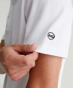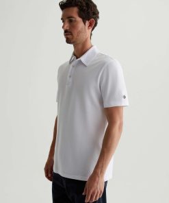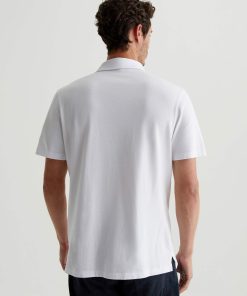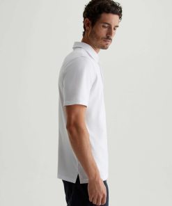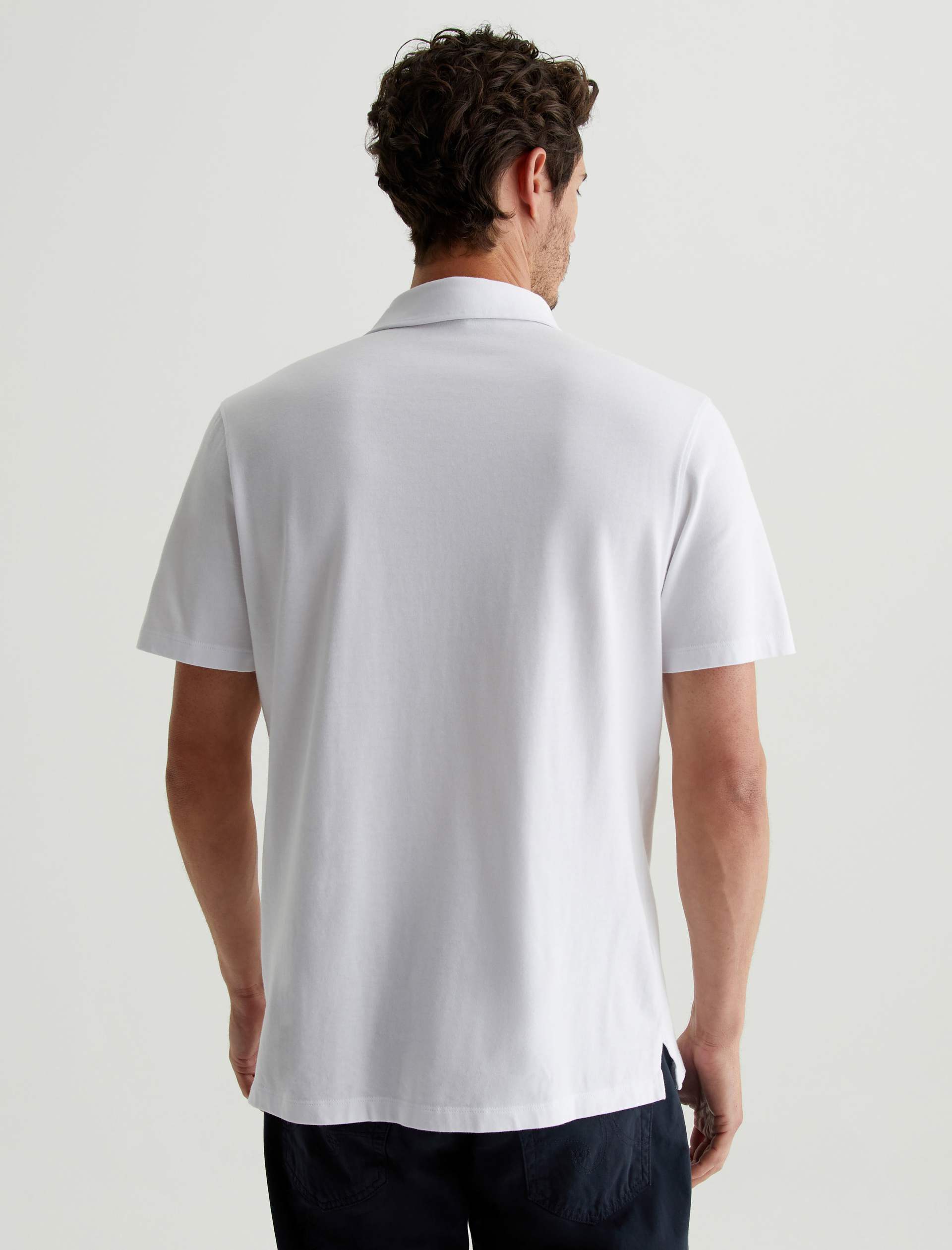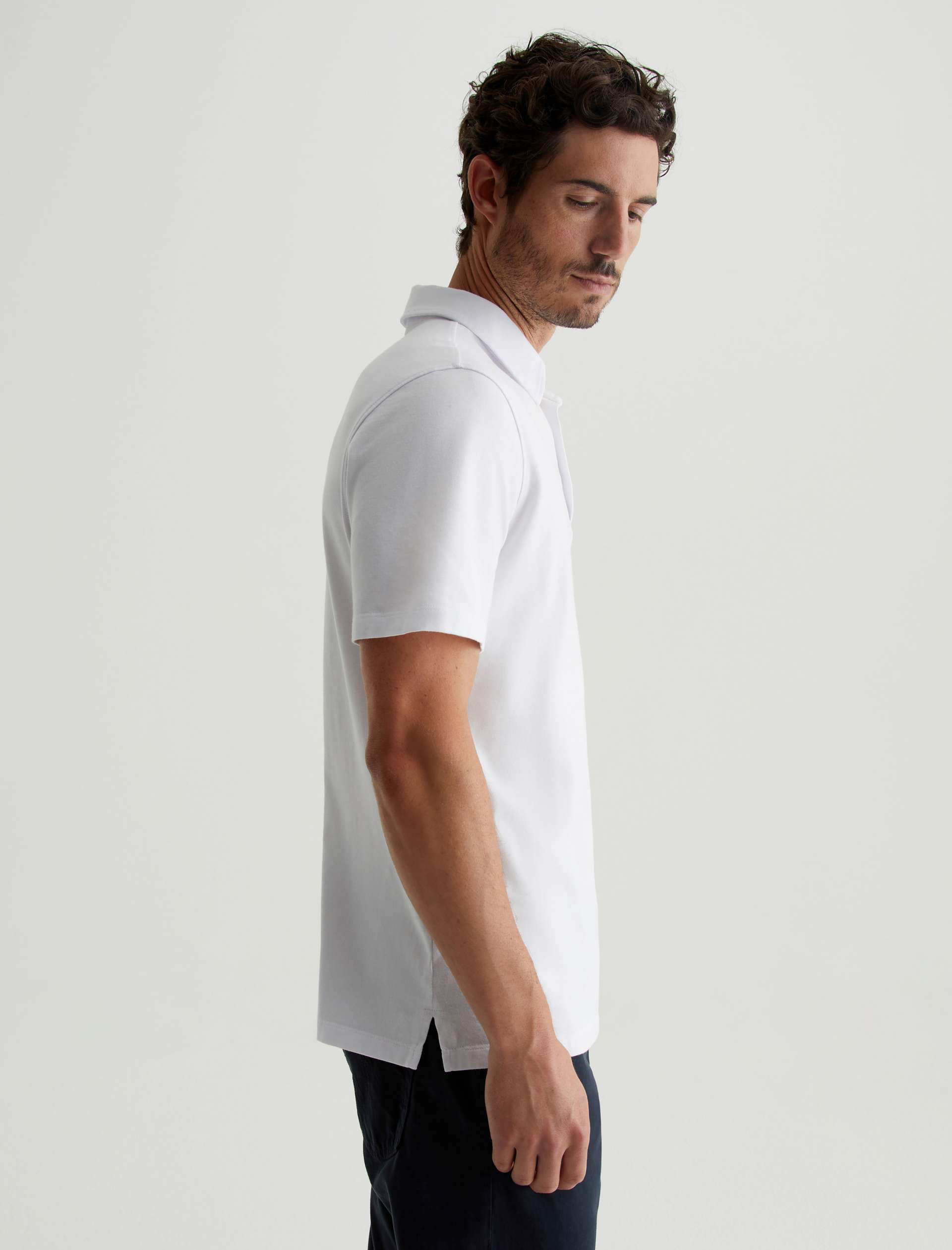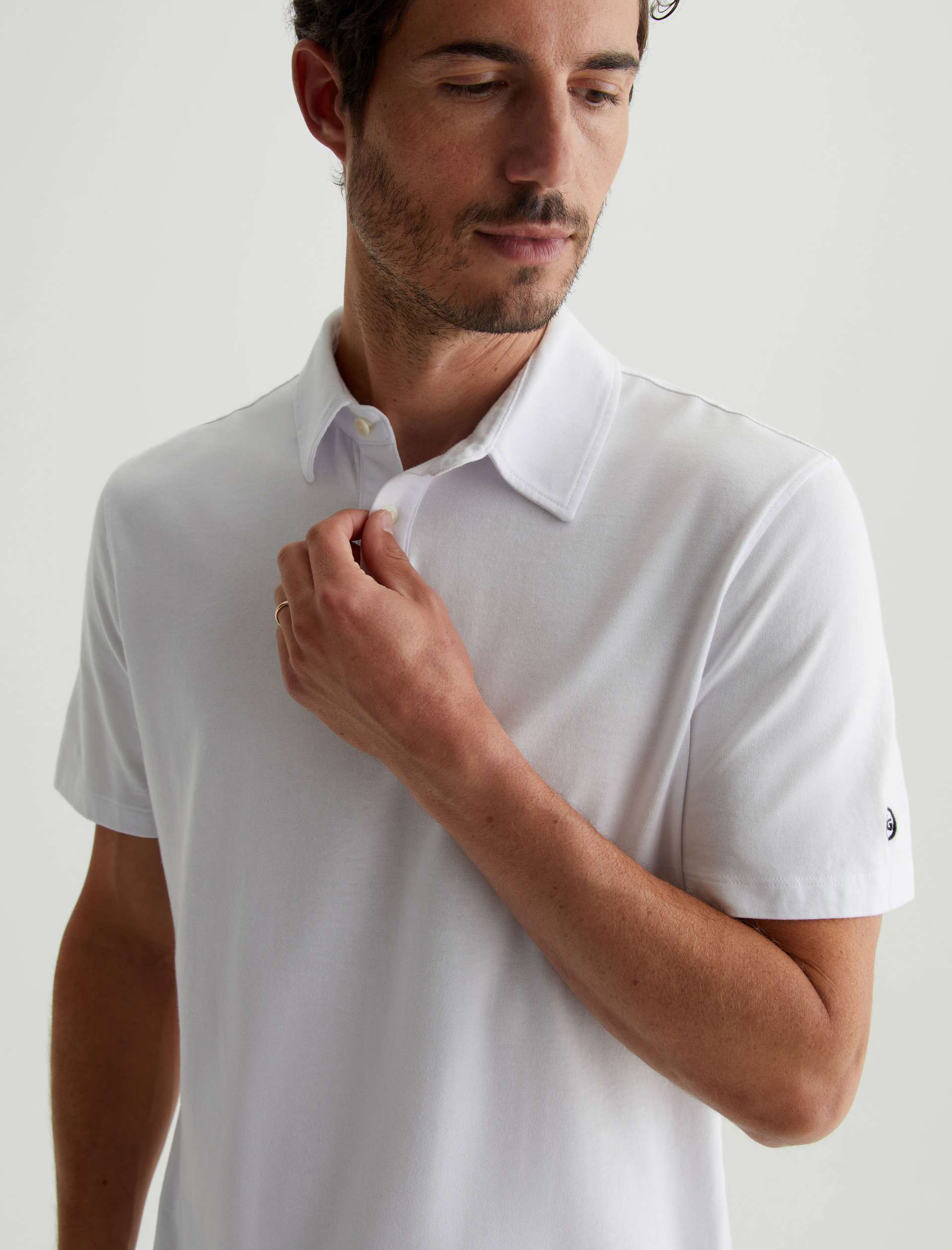 The Bryce Short Sleeve Polo in white is a unique addition to our Basic Essentials assortment, made with our ultra-luxe jersey fabrication. The self-collar adds a modern take on your classic polo shirt. Our Jersey Knit offers a luxurious comfort that is unrivaled—knitted with both S-twist and Z-twist yarn to sustain lon