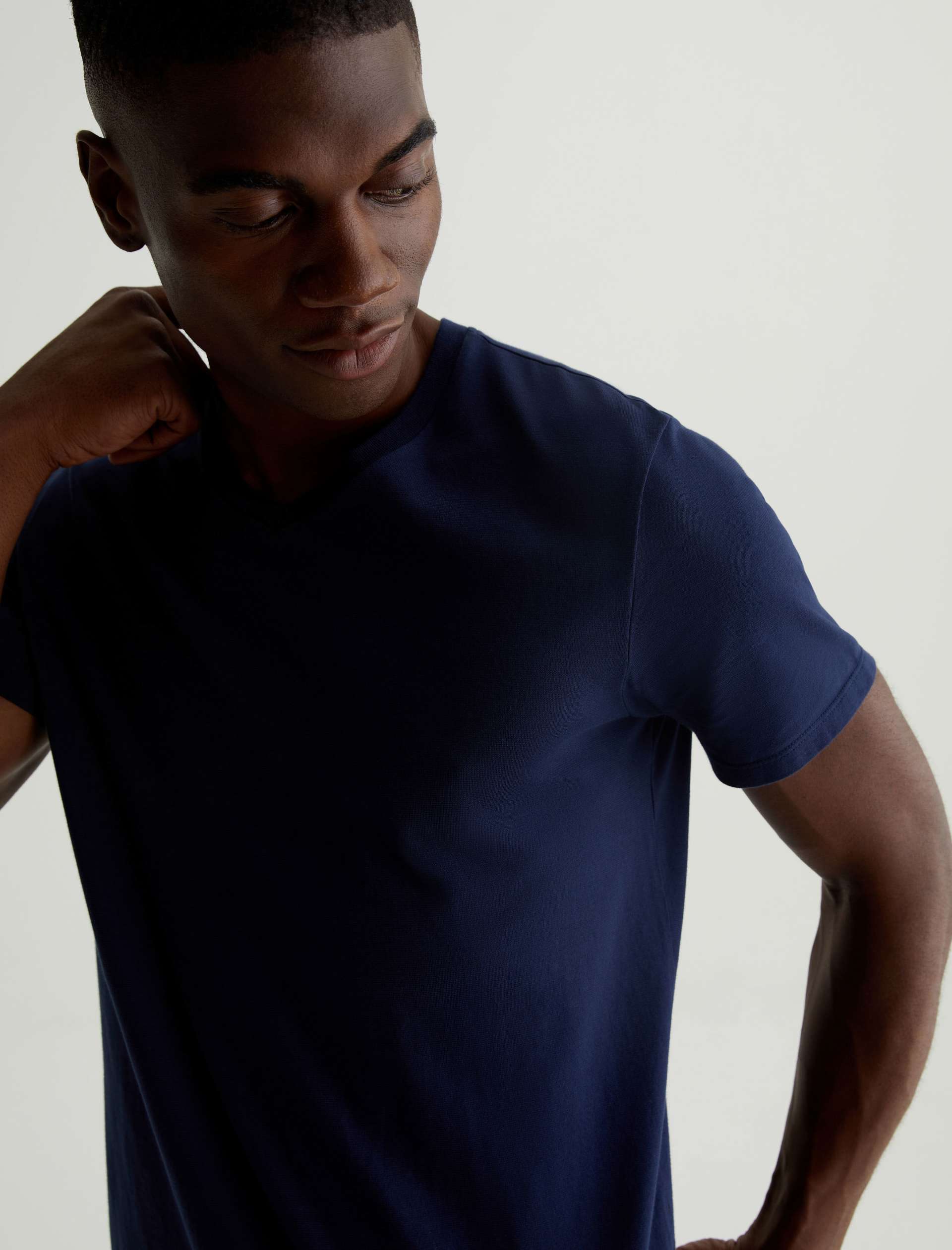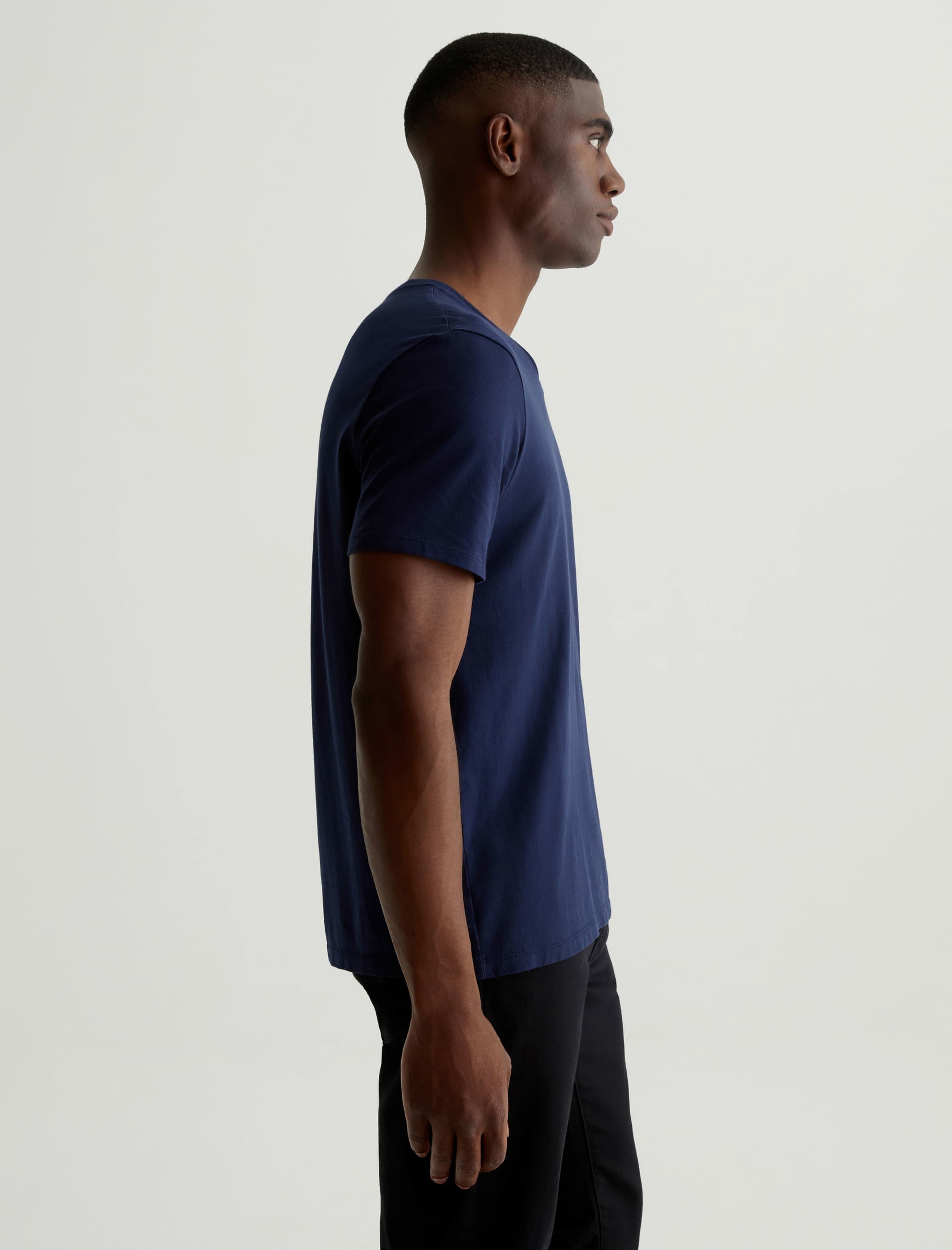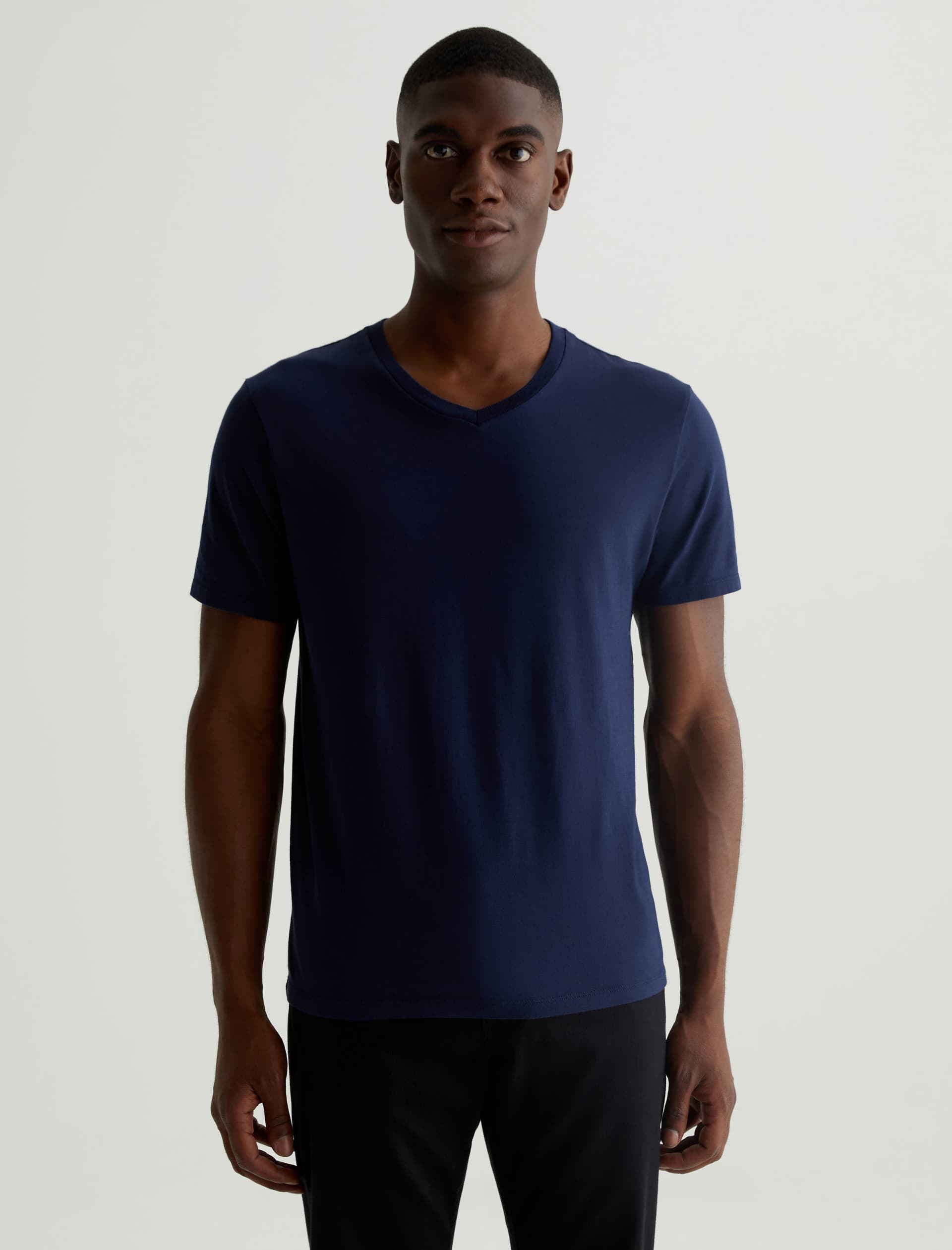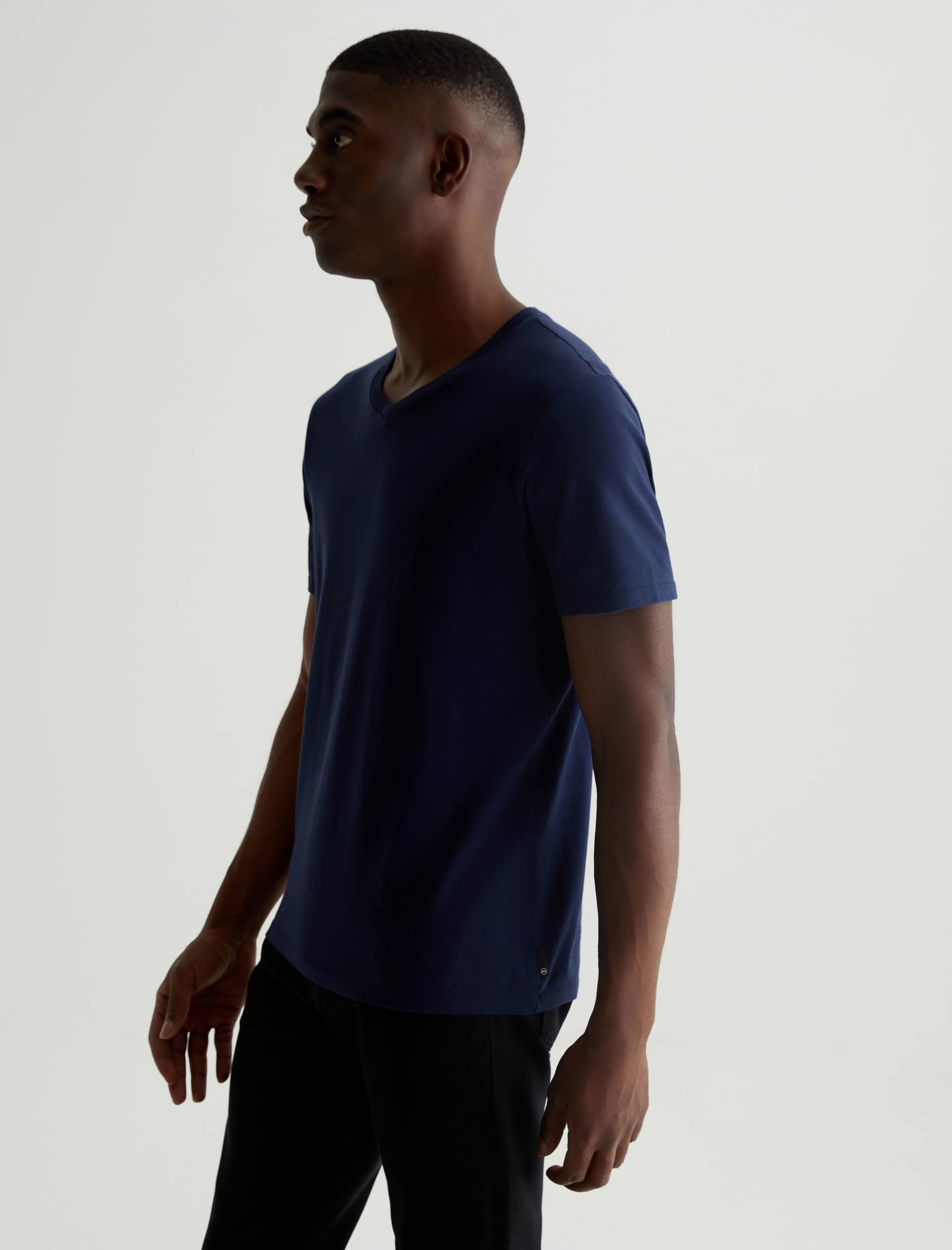 The Bryce Vee in deep navy is our classic short sleeve V-neck tee that offers a 1X1 rib neckband to create a great vee shape at the neck. Our Jersey Knit offers a luxurious comfort that is unrivaled—knitted with both S-twist and Z-twist yarn to sustain longevity and stability, preventing unnecessary twisting and torqui