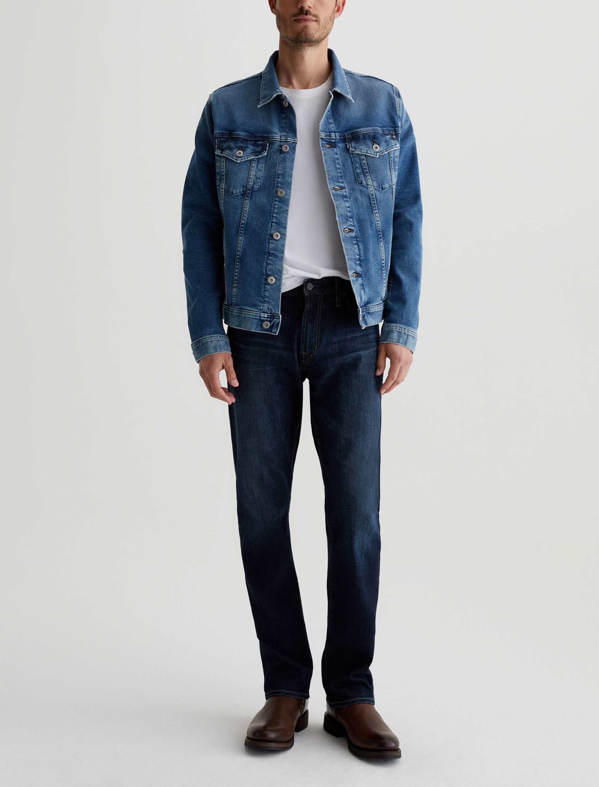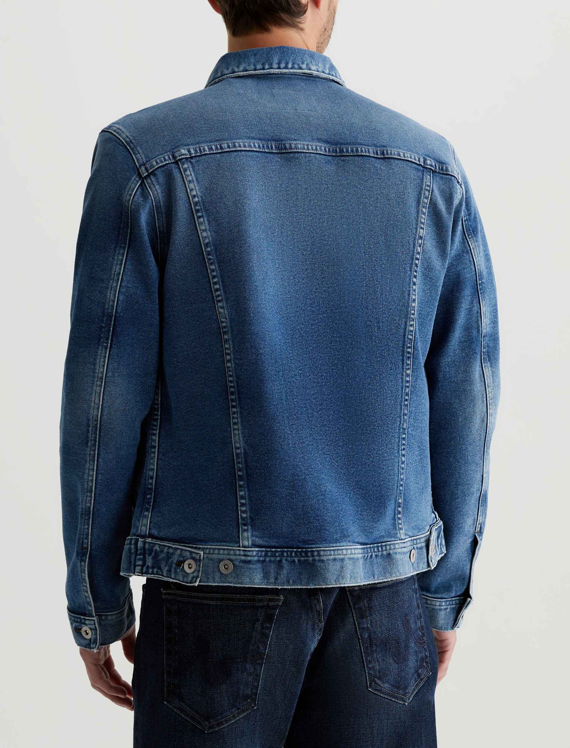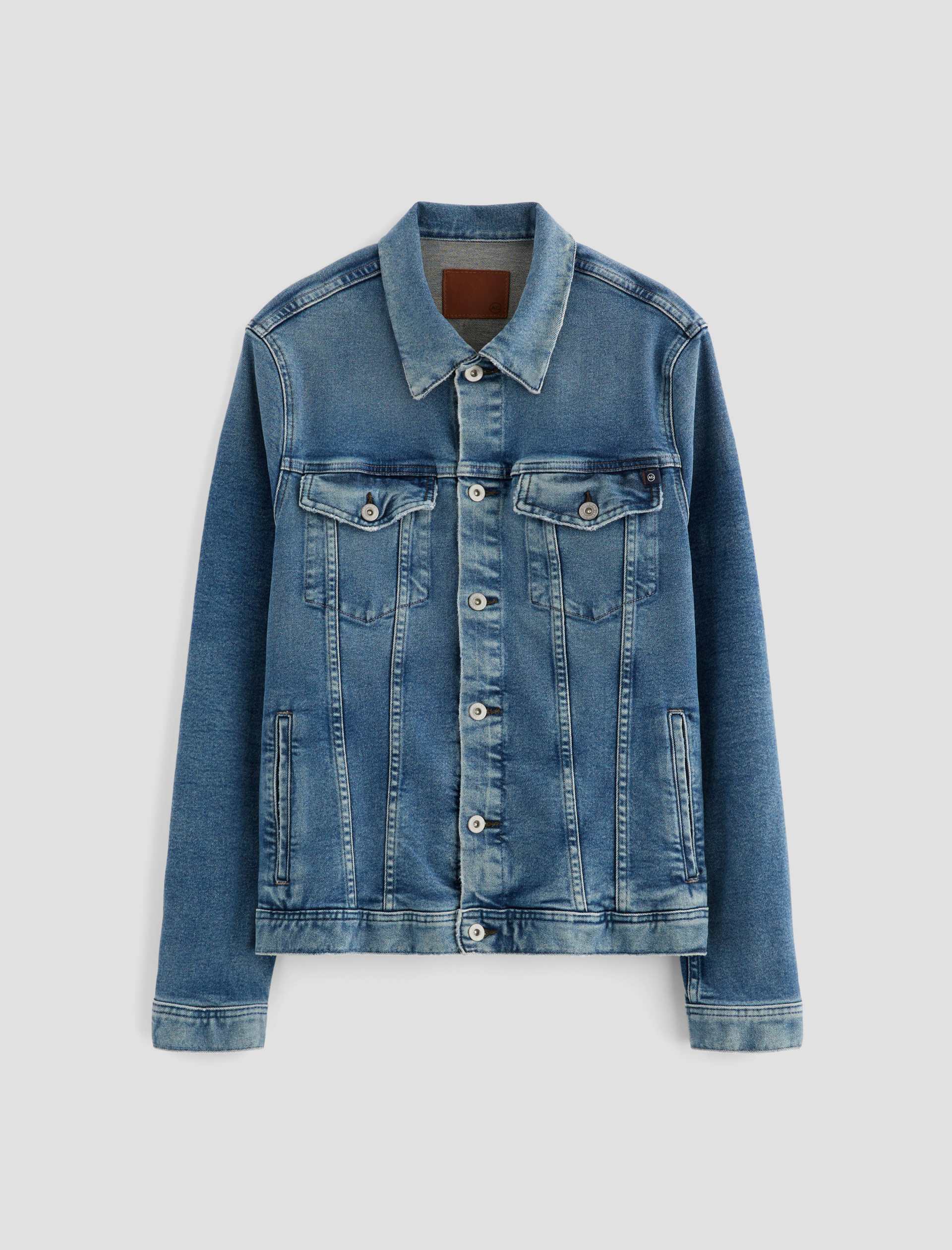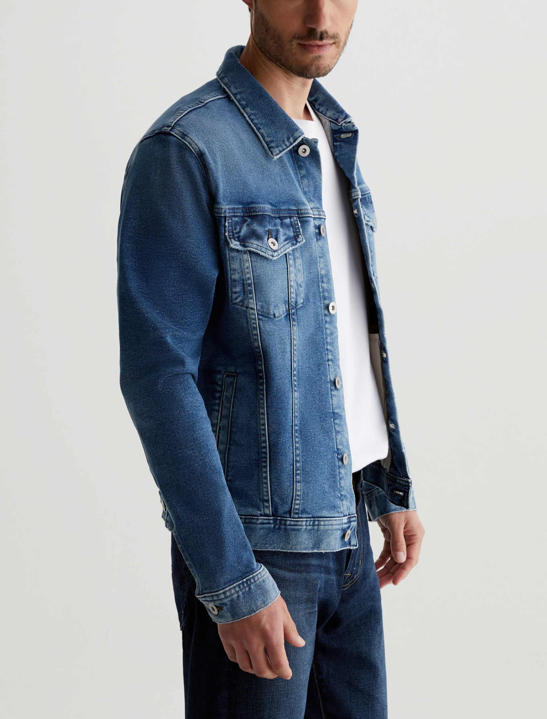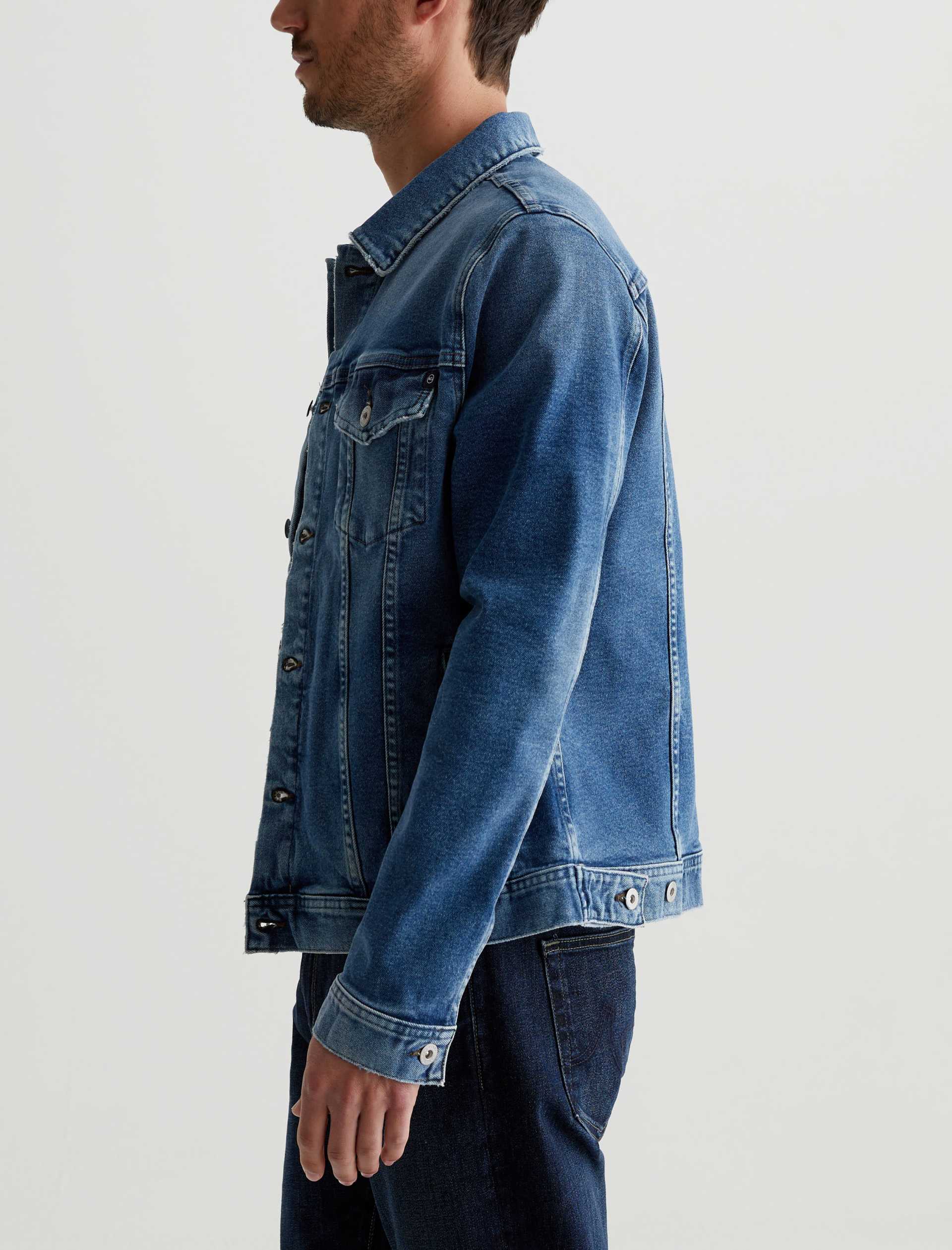 The Dart Jacket is a classic men’s trucker that you can wear in any season. It’s made from 12 oz. Classic Comfort Stretch Denim in a faded blue wash. Flap pockets at the chest, adjustable waist tabs, and concealed hip pockets are functional details that bring timeless appeal to this essential layering piece.