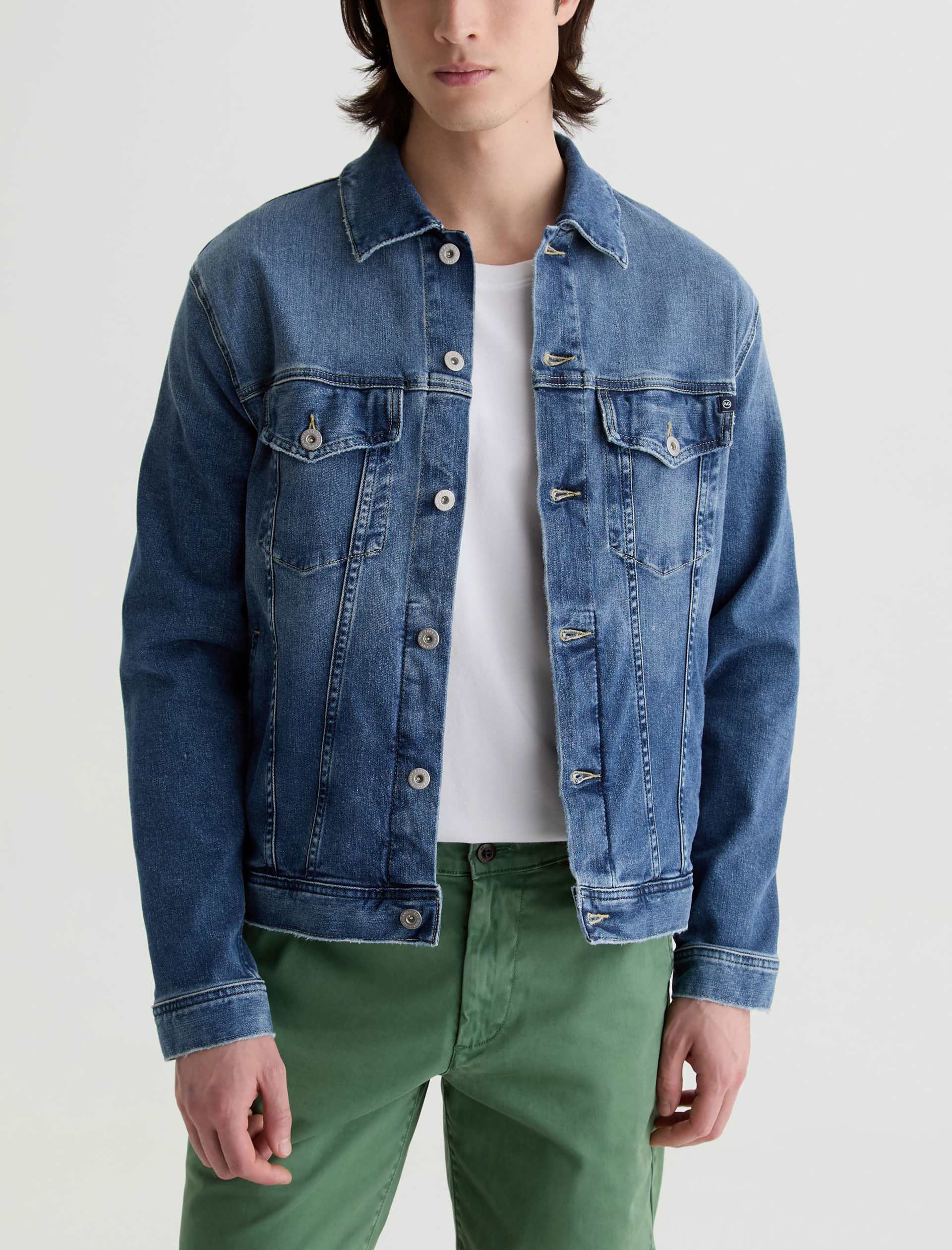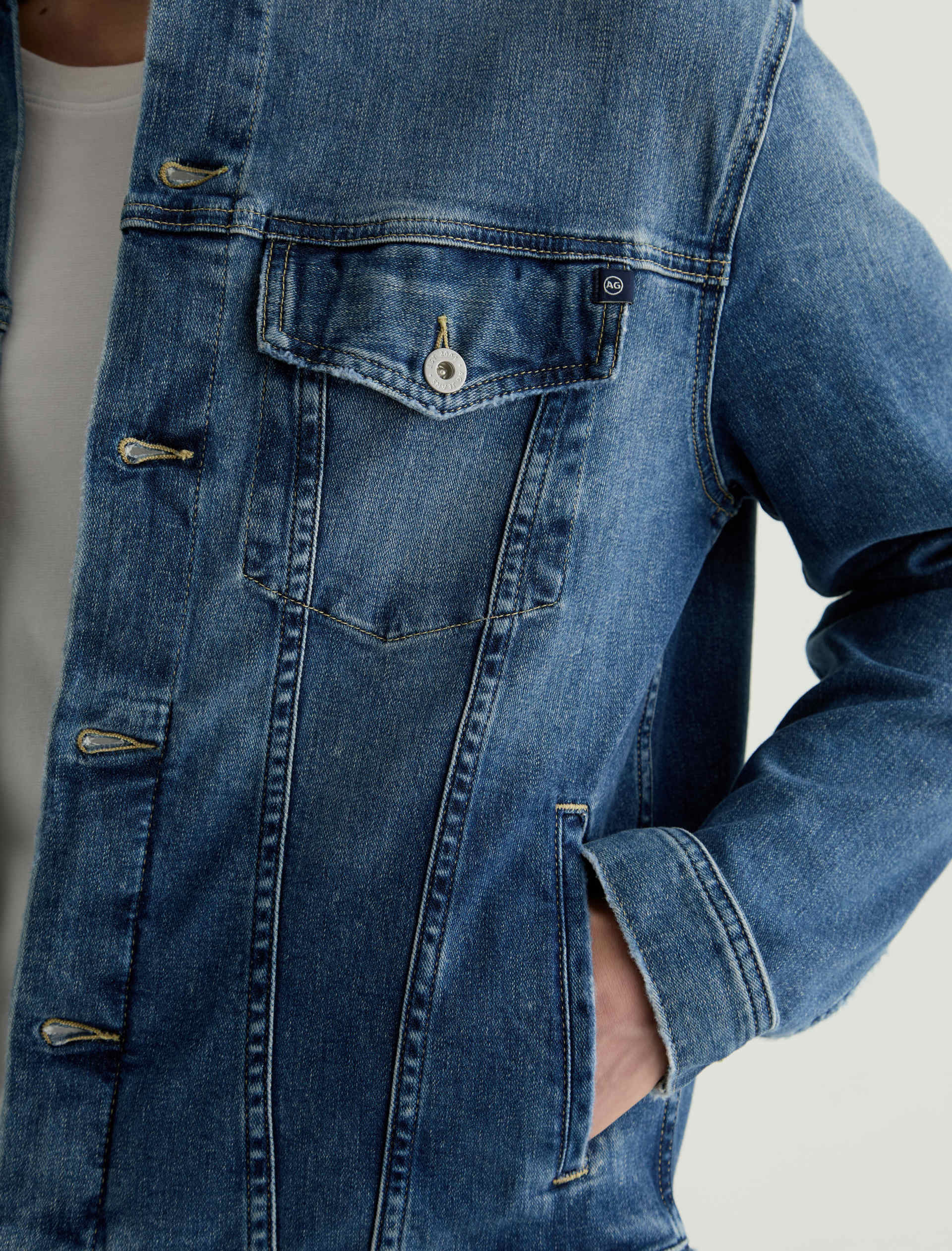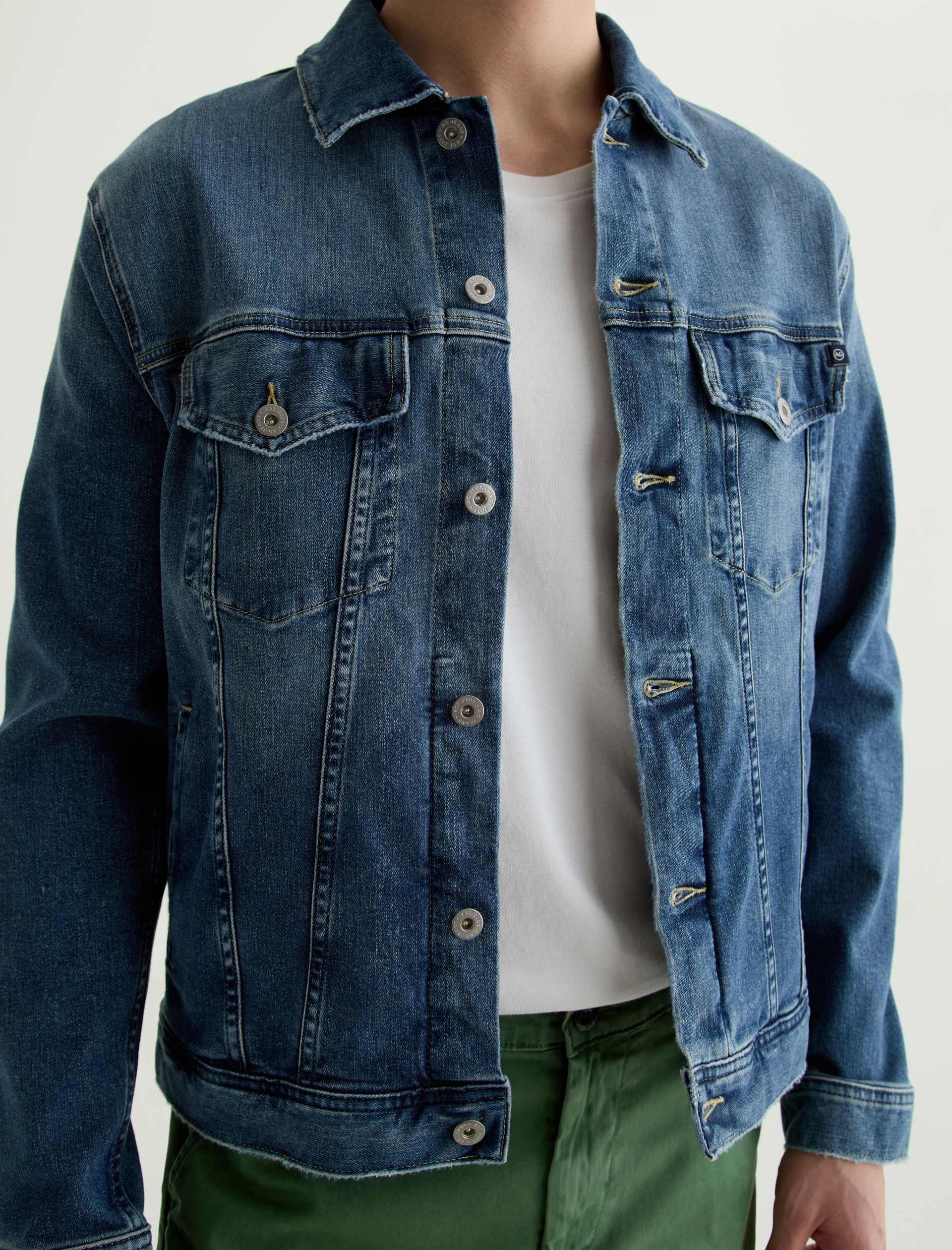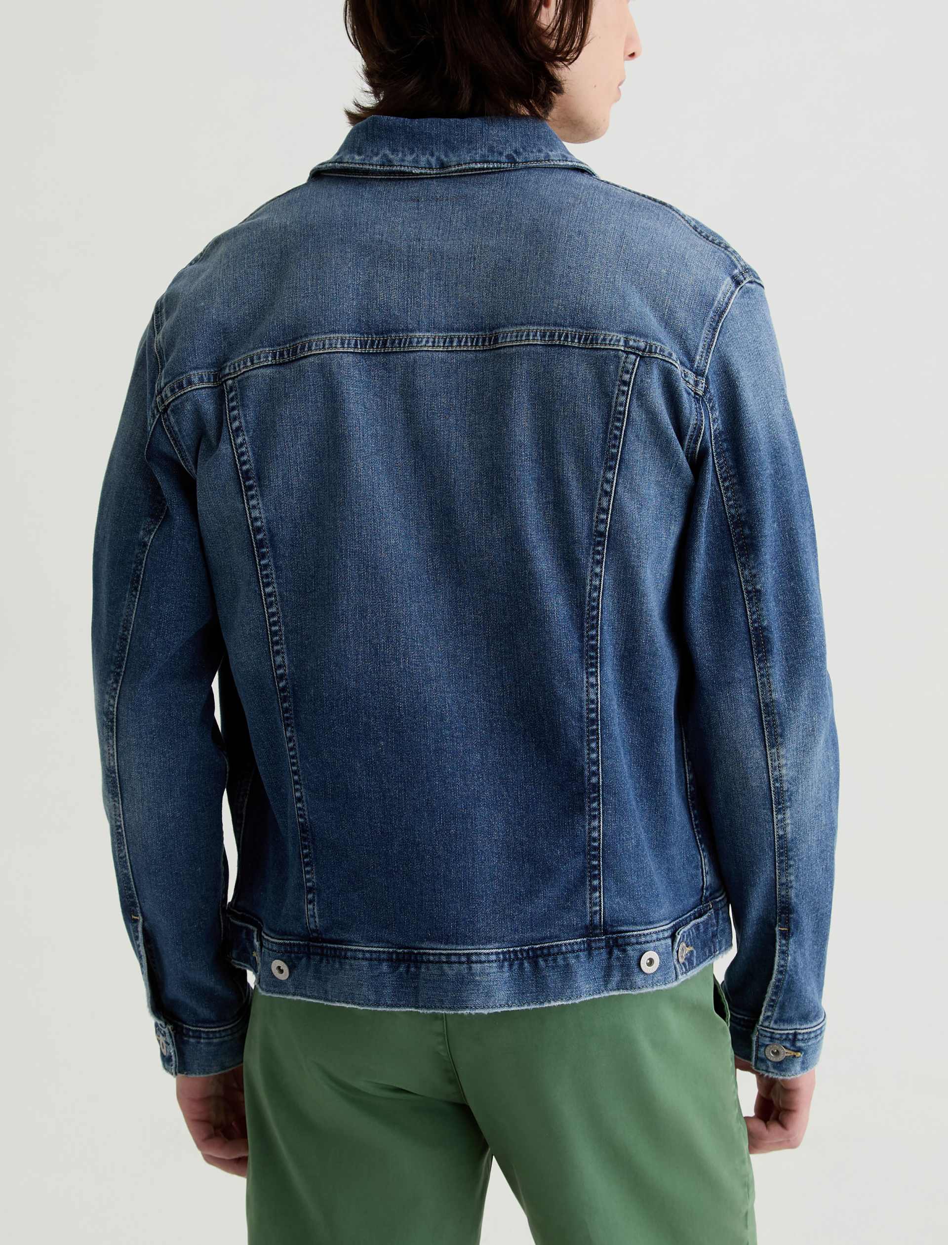 Our Dart Jacket is a classic denim trucker that stands the test of time. Washed to a faded medium blue, the style has subtle grinding along the edges of the collar, chest pockets, and hem. It’s got a comfortable feel in 9.4 oz. Hyper Soft Indigo Denim from Japan. This exclusive AG Cloud Soft Denim™ fabric has special l