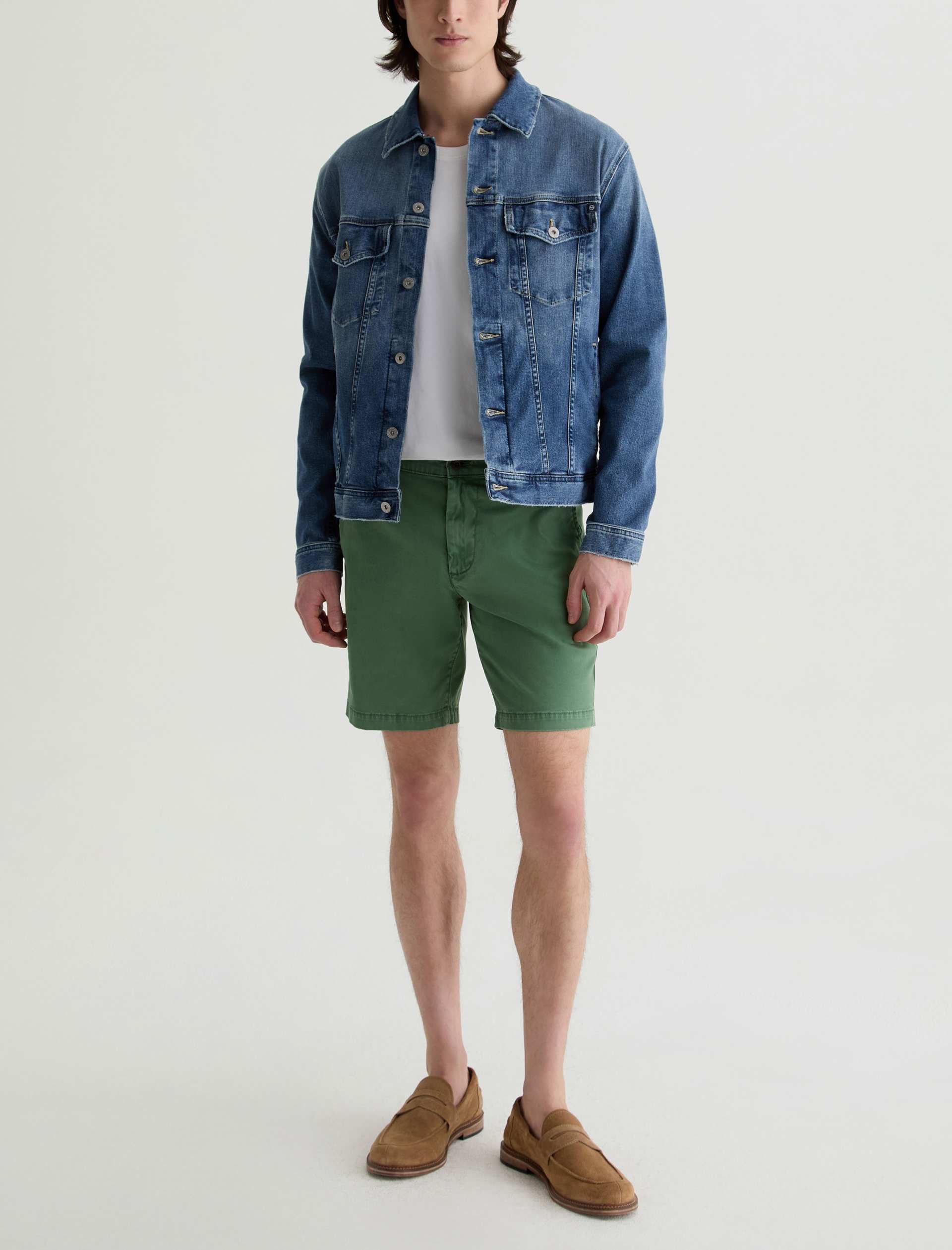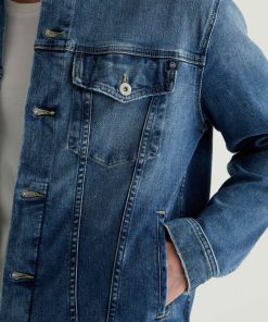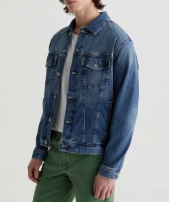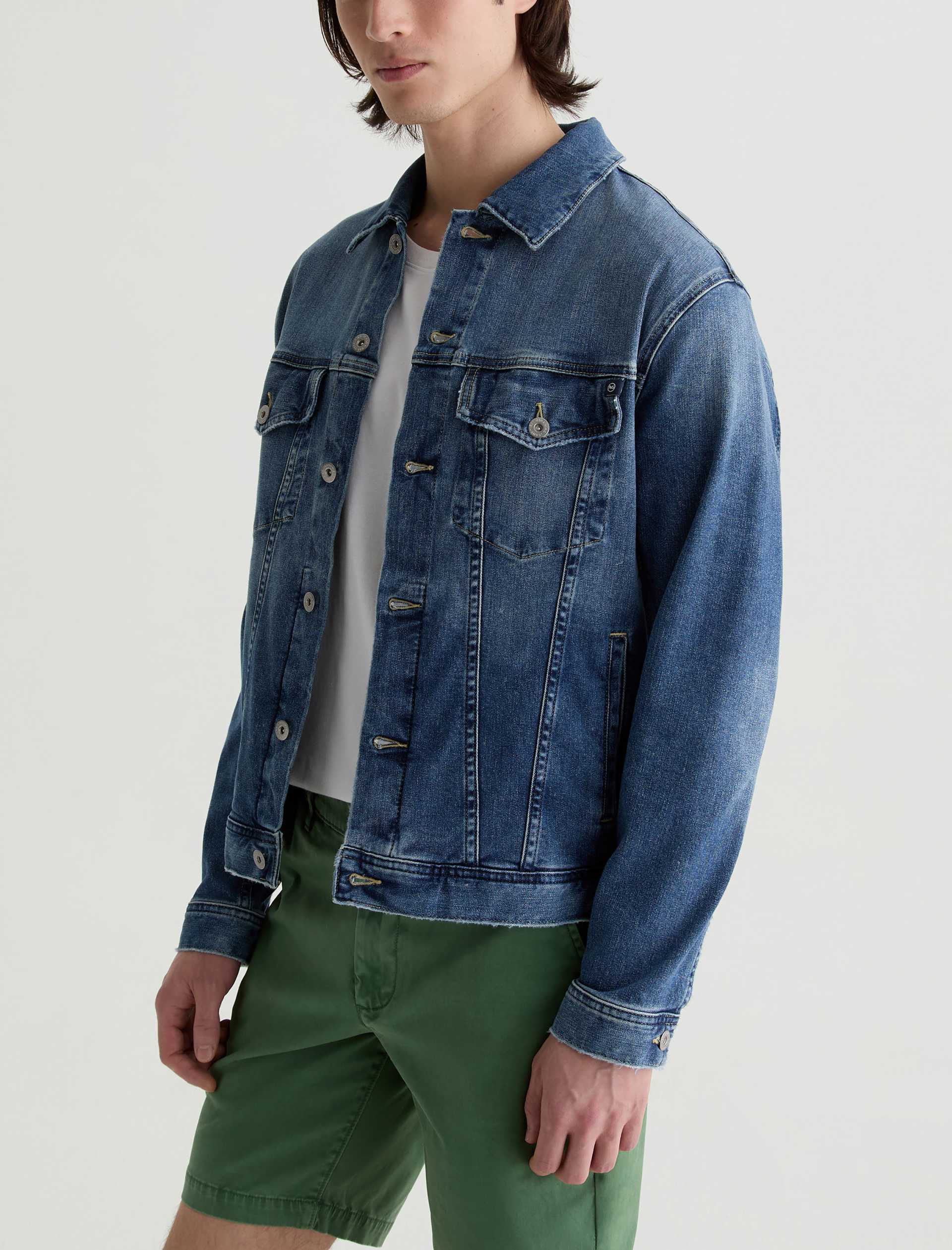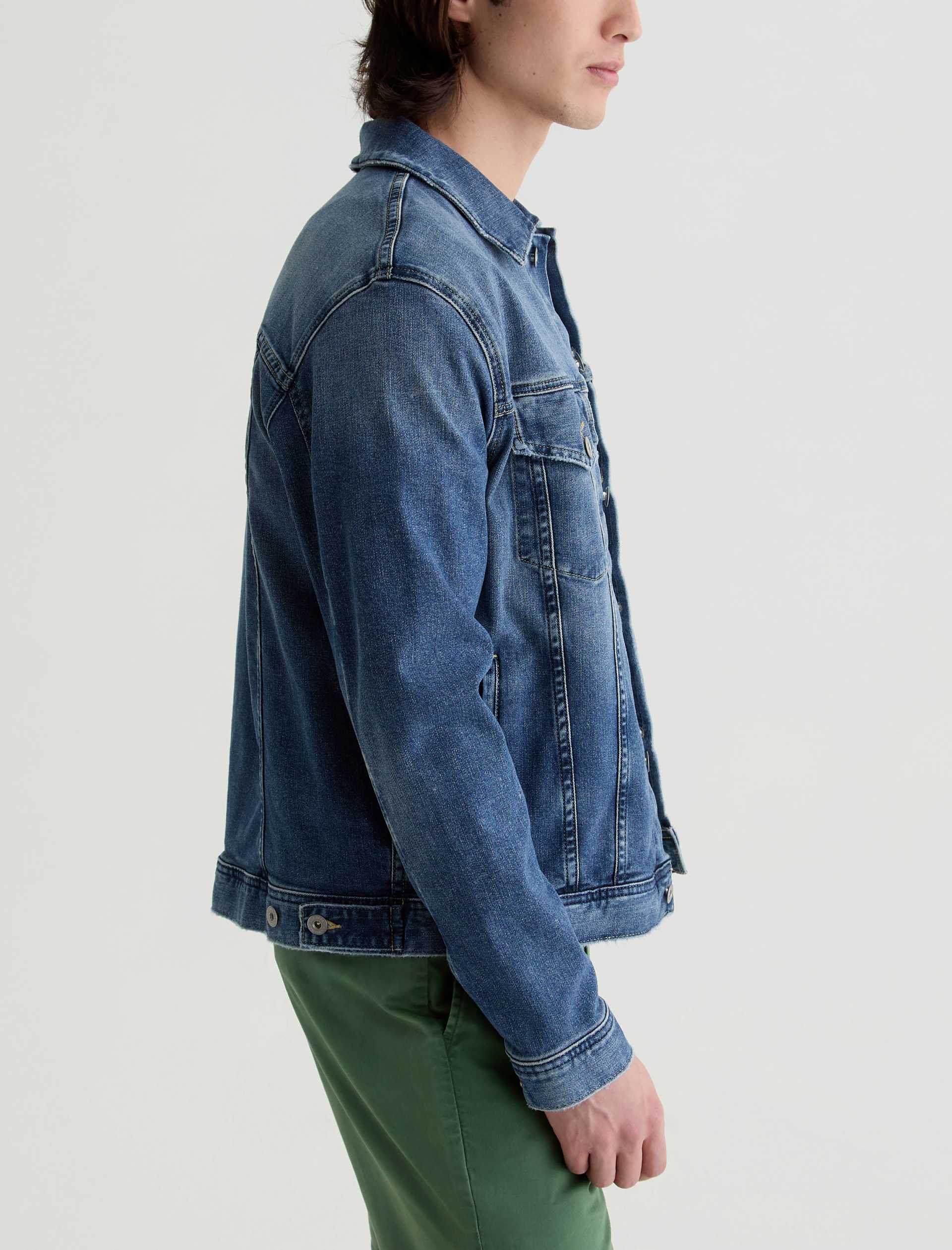 Our Dart Jacket is a classic denim trucker that stands the test of time. Washed to a faded medium blue, the style has subtle grinding along the edges of the collar, chest pockets, and hem. It’s got a comfortable feel in 9.4 oz. Hyper Soft Indigo Denim from Japan. This exclusive AG Cloud Soft Denim™ fabric has special l