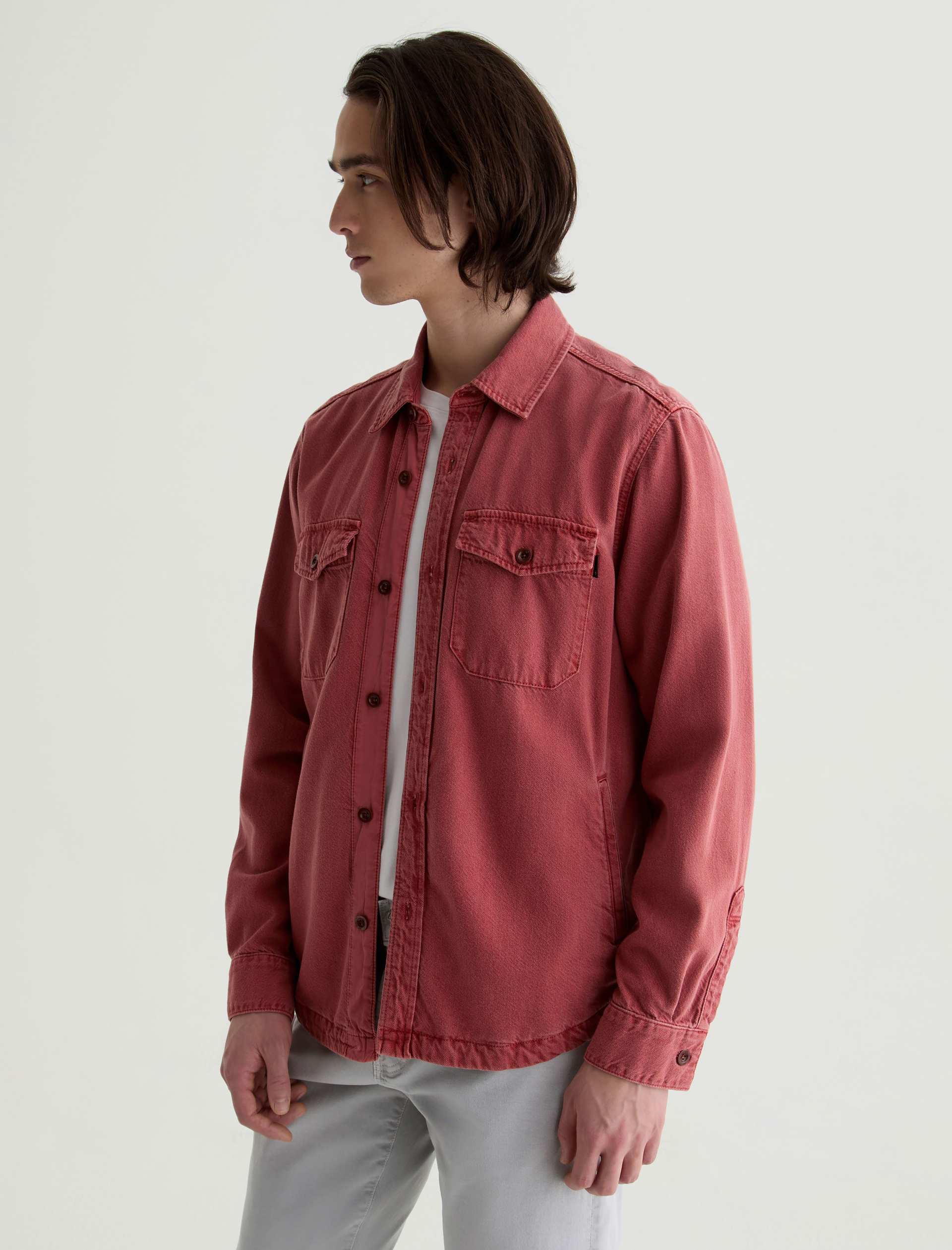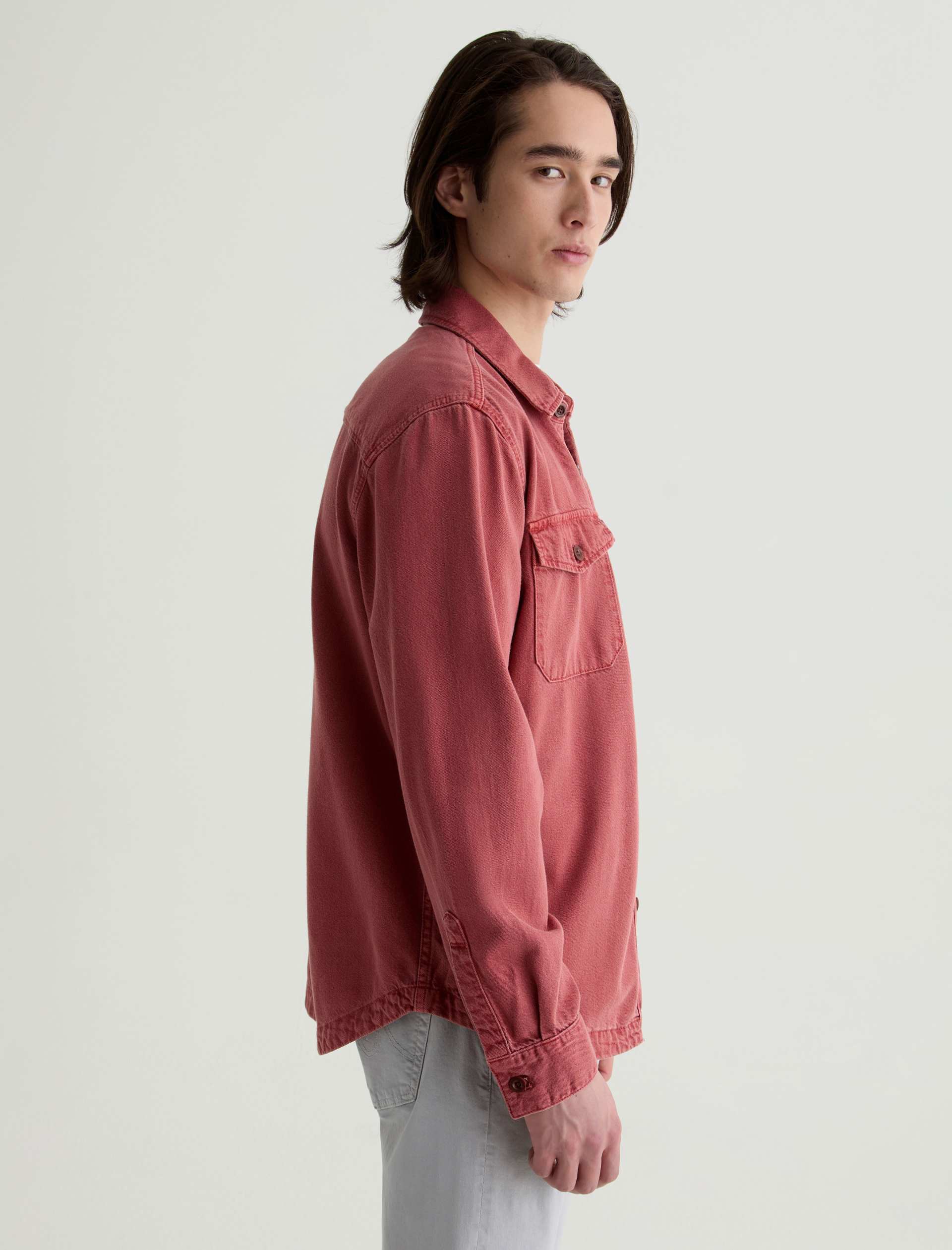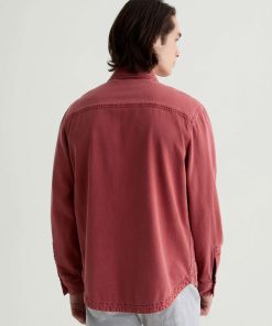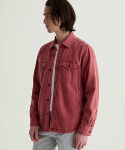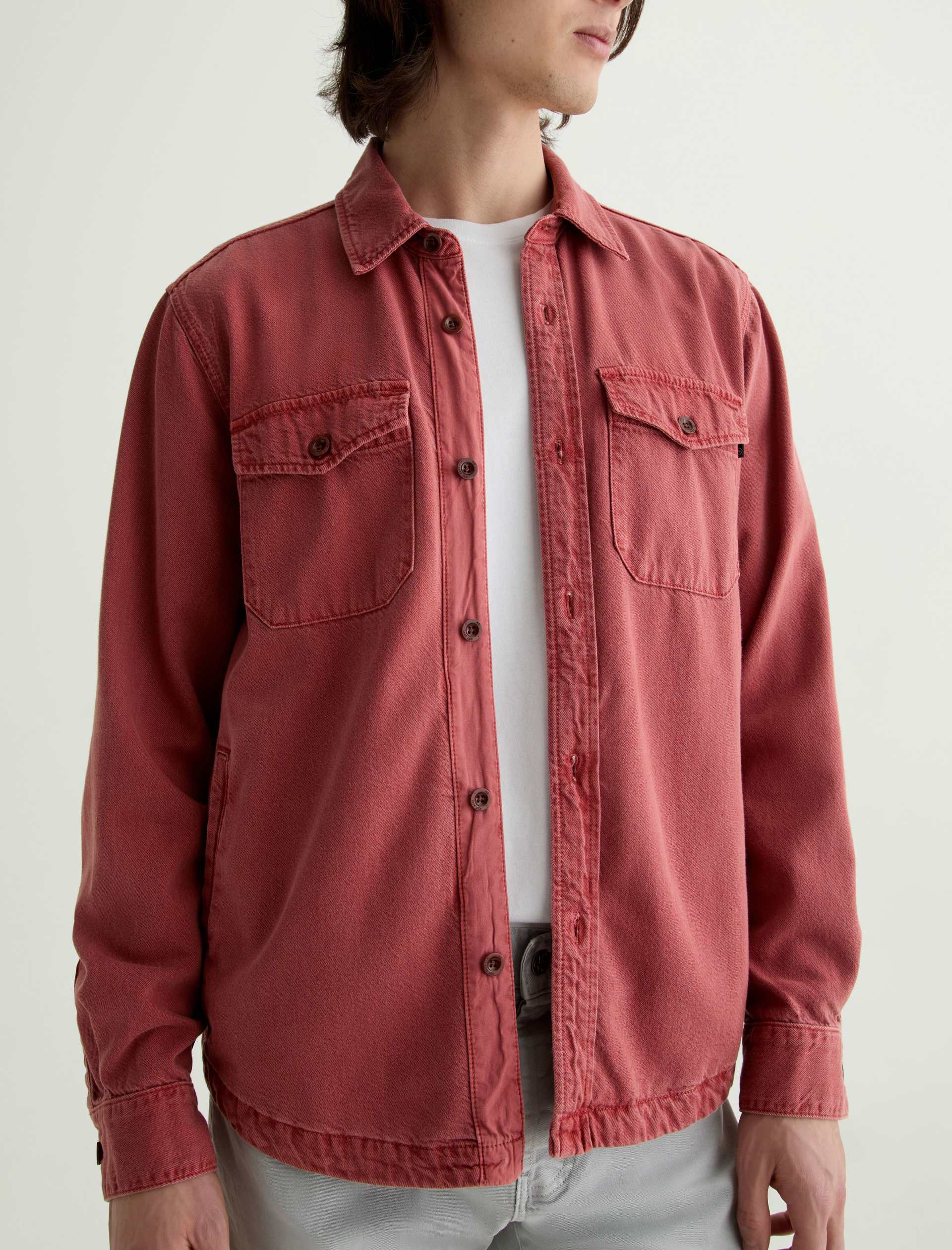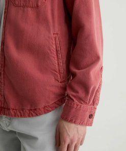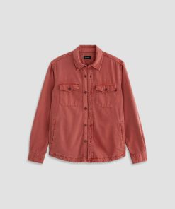 The Elias Shirt Jacket is a long-sleeve style crafted from a cotton-silk blend in a Sulfur Vintage Ruby wash. Non-stretch and button-up, it features two front flap pockets and adjustable button tabs at the cuffs for a customizable fit around the wrists.