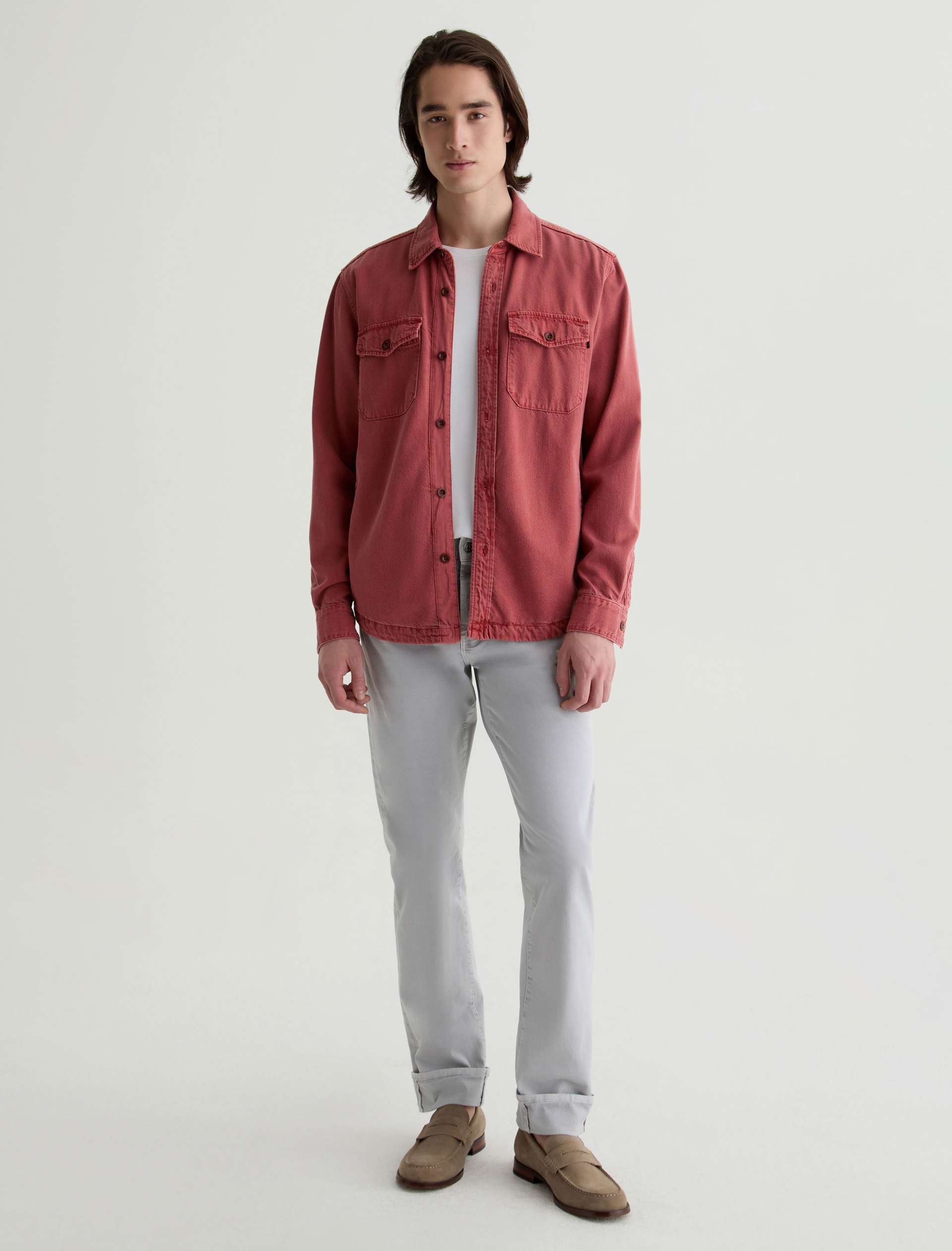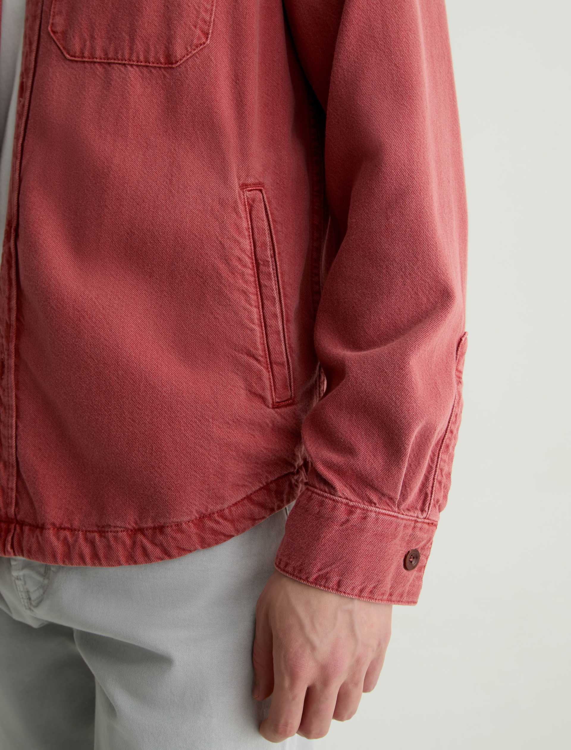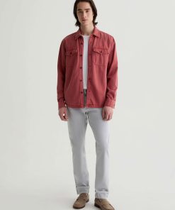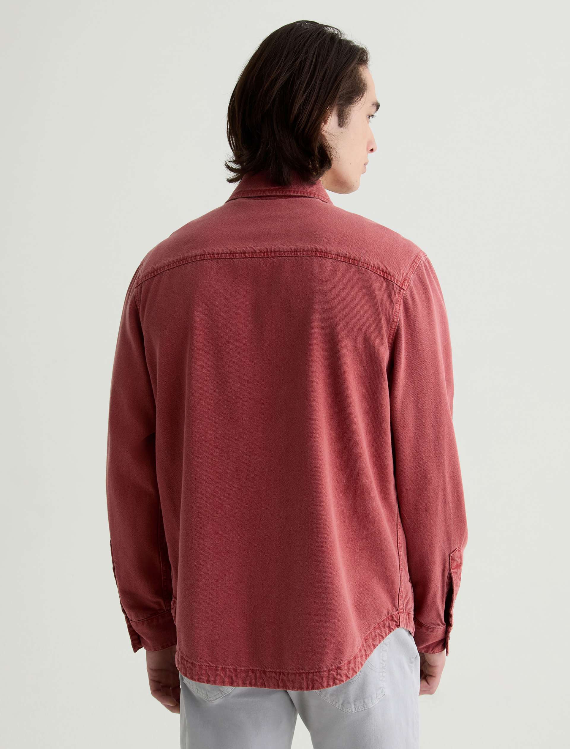 The Elias Shirt Jacket is a long-sleeve style crafted from a cotton-silk blend in a Sulfur Vintage Ruby wash. Non-stretch and button-up, it features two front flap pockets and adjustable button tabs at the cuffs for a customizable fit around the wrists.