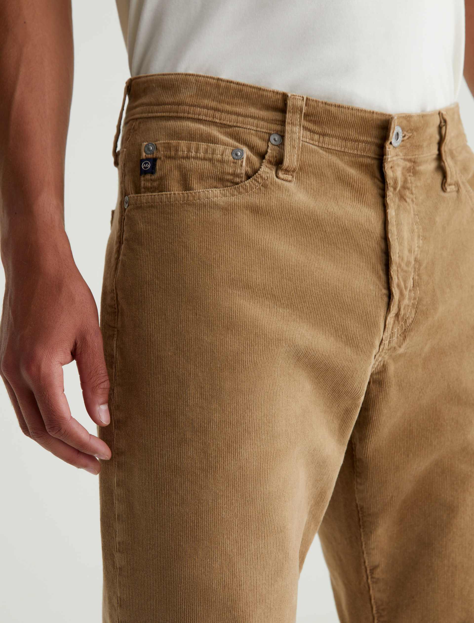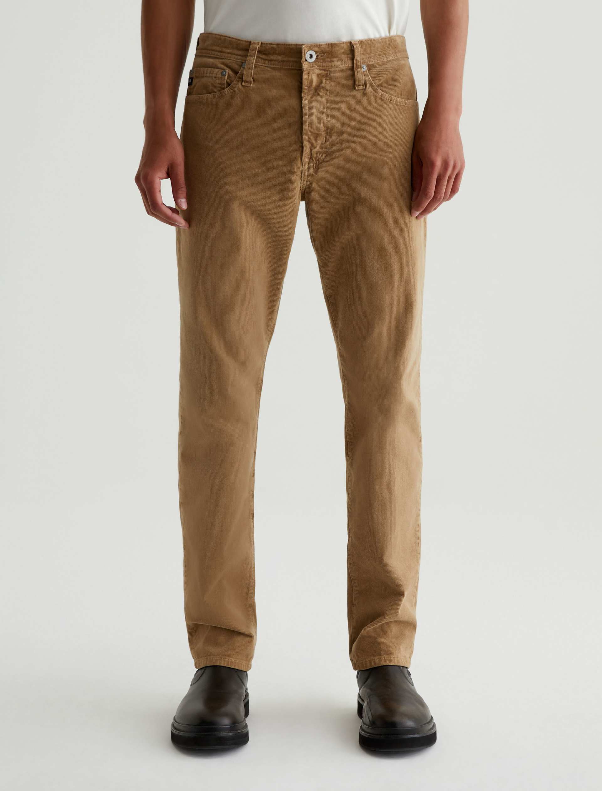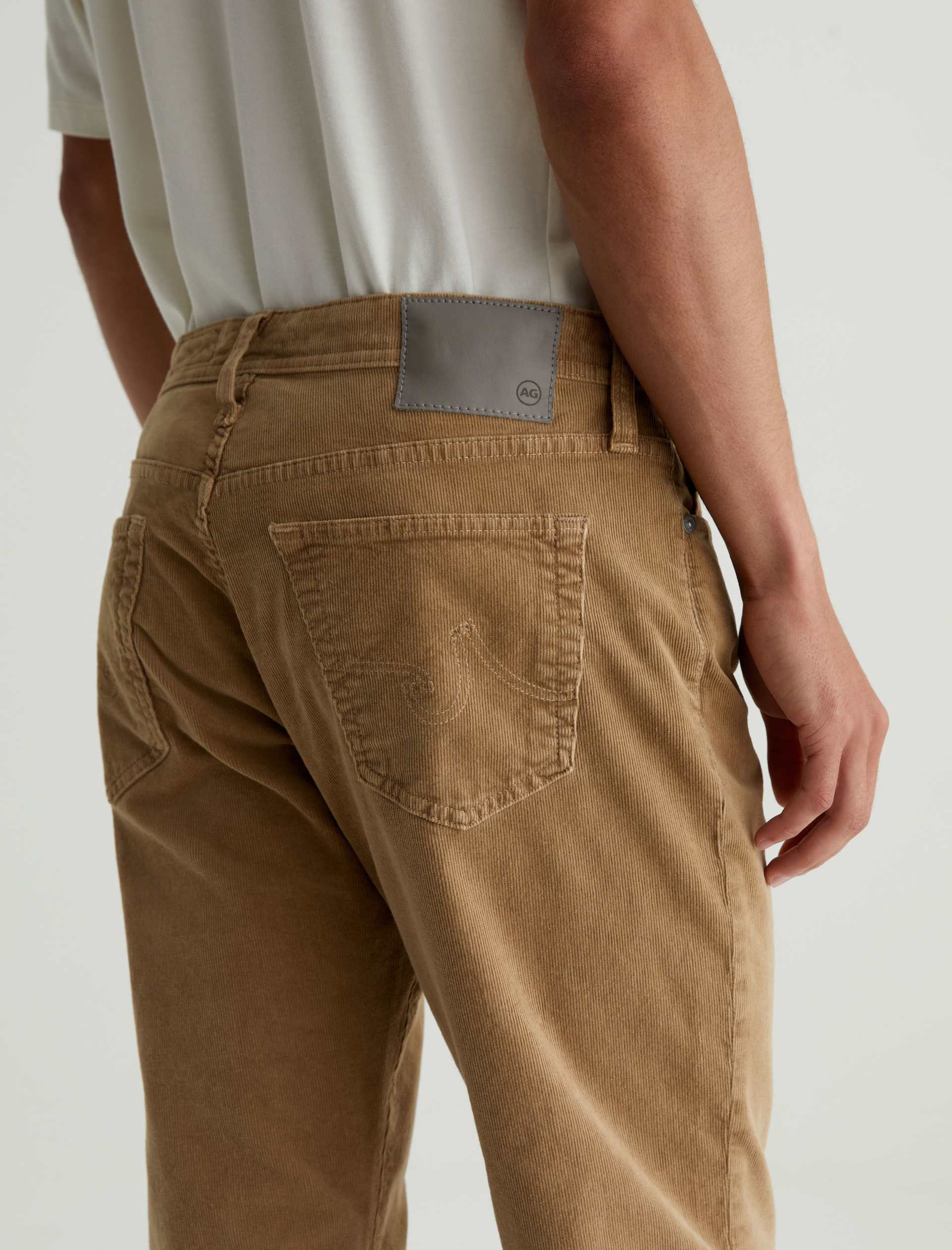 Our Everett slim-straight corduroy pants for men have a soft, plush feel in 8.8 oz. Range Stretch Cord fabric from Japan. Designed with fine-wale construction, this pair has been sulfur-dyed for a khaki shade that’s got subtle variations of color at the seams and edges. The style has a mid-rise waist and a straight fit