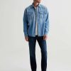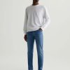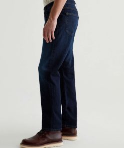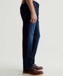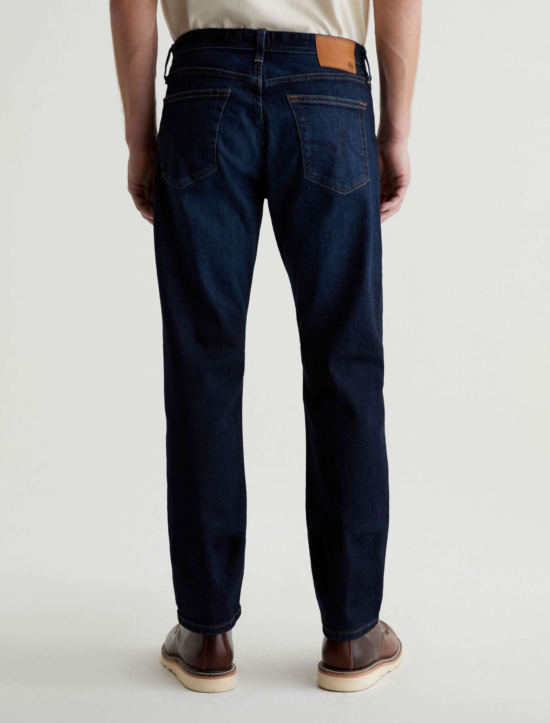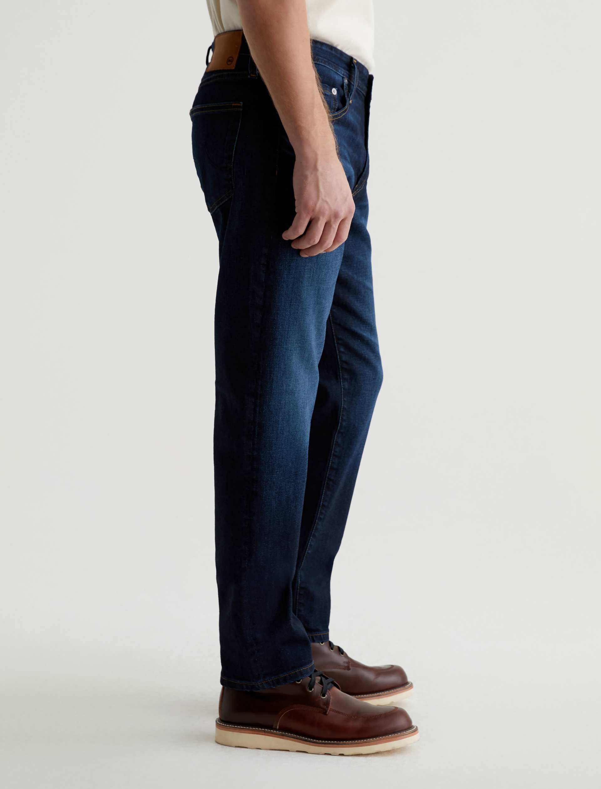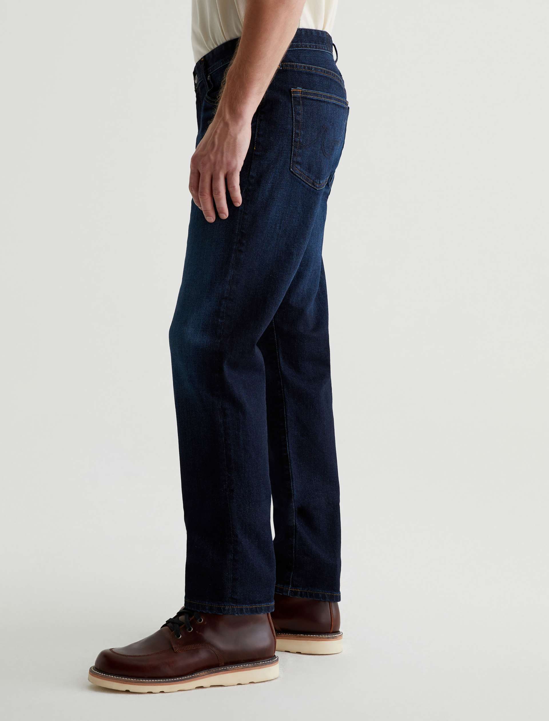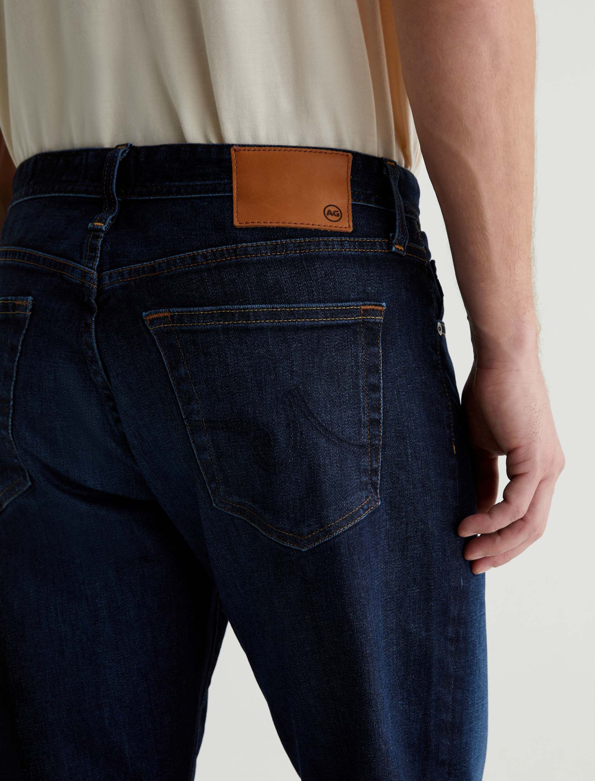 The Graduate is a tailored leg jean for men, done here in a classic dark indigo wash with fading and whiskering. These men’s jeans are cut with a slim mid-rise waist and a relaxed fit from the hip to knee before tapering at the leg opening. The pair features 11.75 oz. Union Dark Denim with comfort stretch. Marigold top