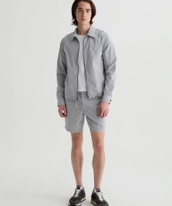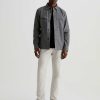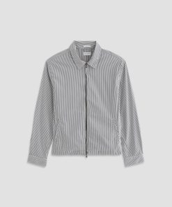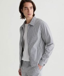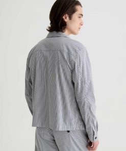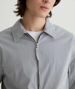 The Philip Zip Jacket is a modern chore coat with long sleeves and a boxy silhouette that tapers slightly at the hem. Designed for a relaxed fit through the chest and shoulders, it features a front zip closure, flap pockets, and a center back seam. Made from Easy Stripe Seersucker, this style comes in a soft grey wash