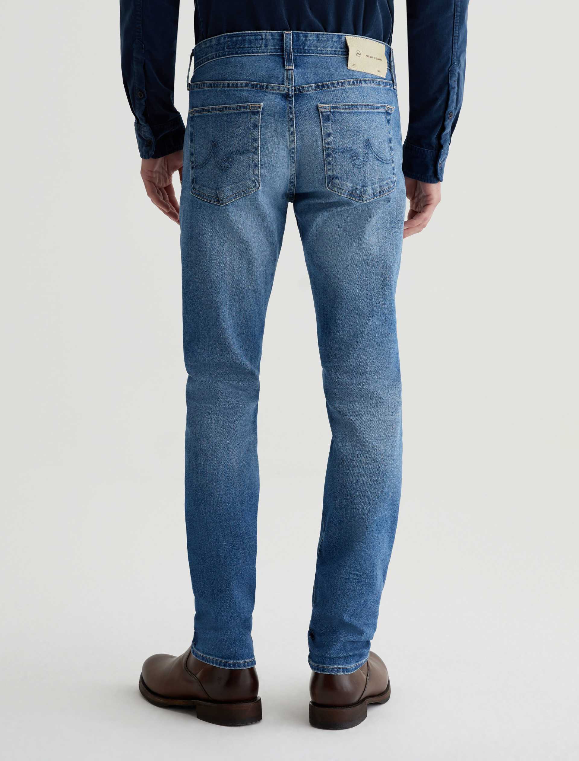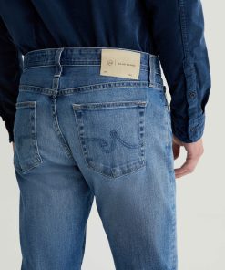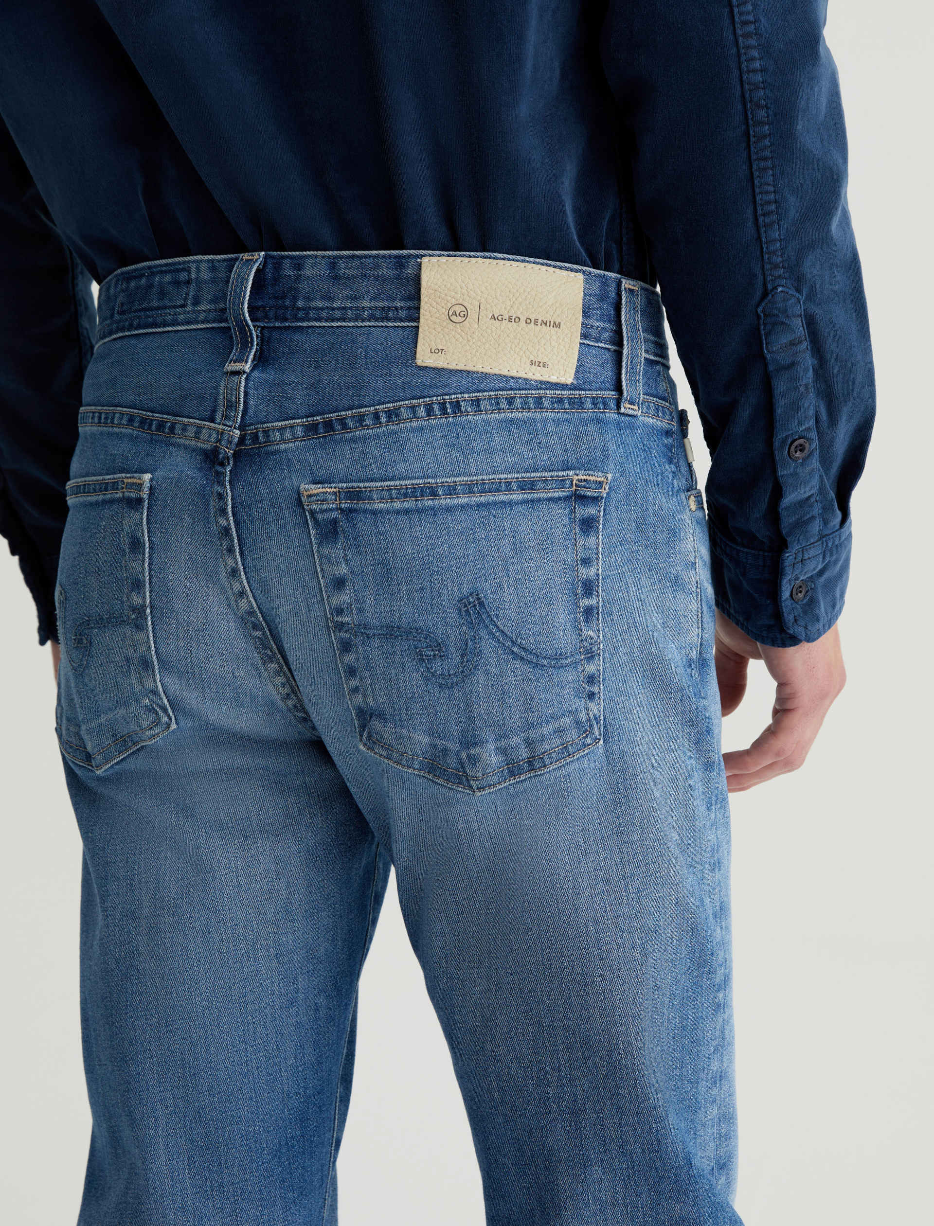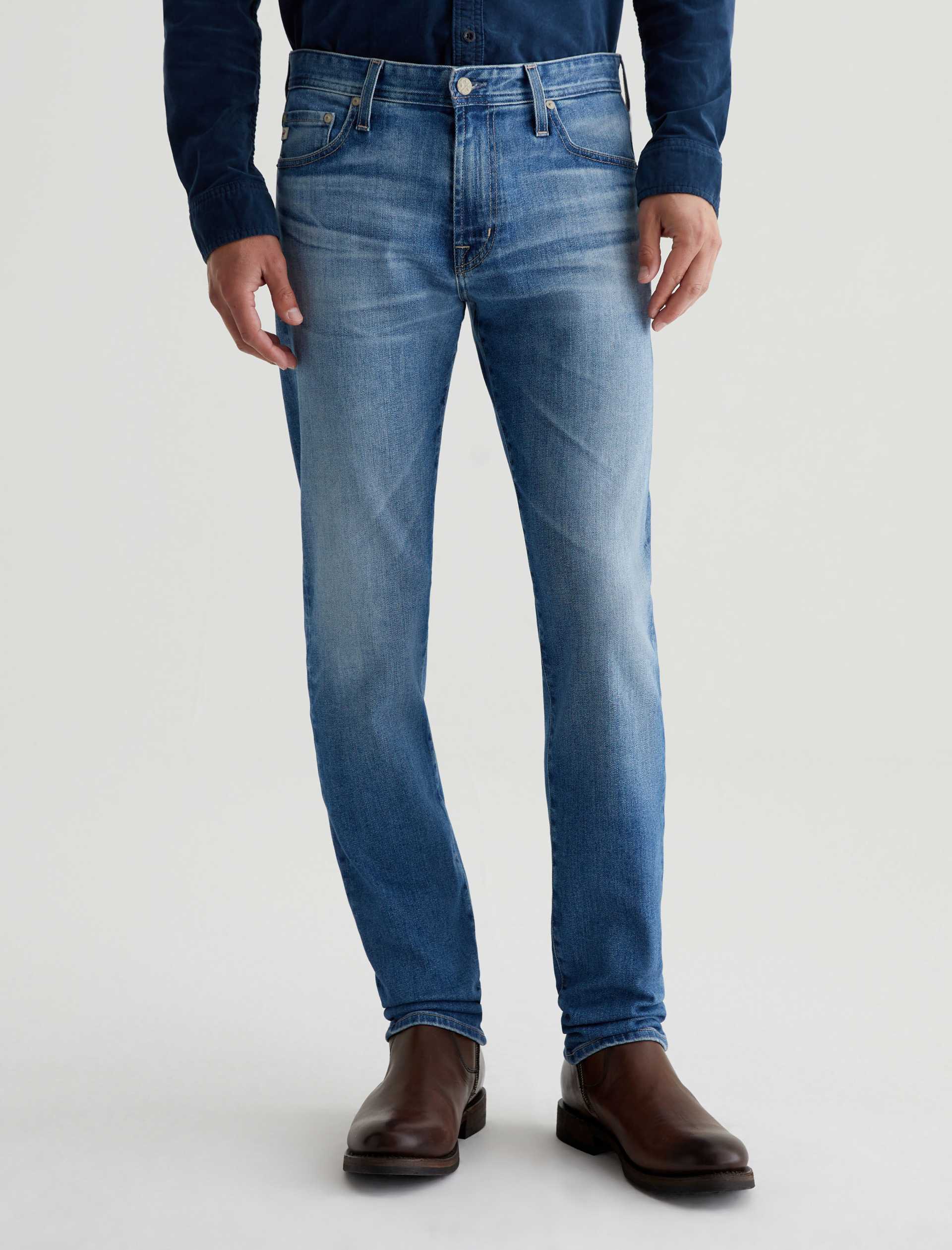 Our Tellis modern slim-fit jeans are cut with a fitted upper block and slender legs that taper at the ankle. This pair has a bit of stretch in 11.2 oz. New Union Dark Denim from Italy. Washed to a medium indigo shade, the style features a 19-year AG-ed™ Denim finish with fading, whiskering, and a subtle honeycomb wear