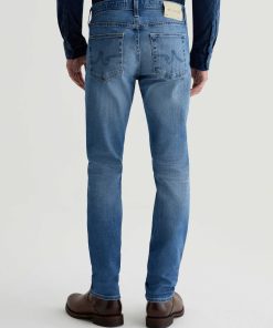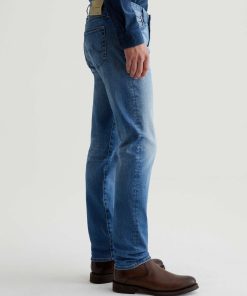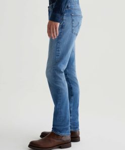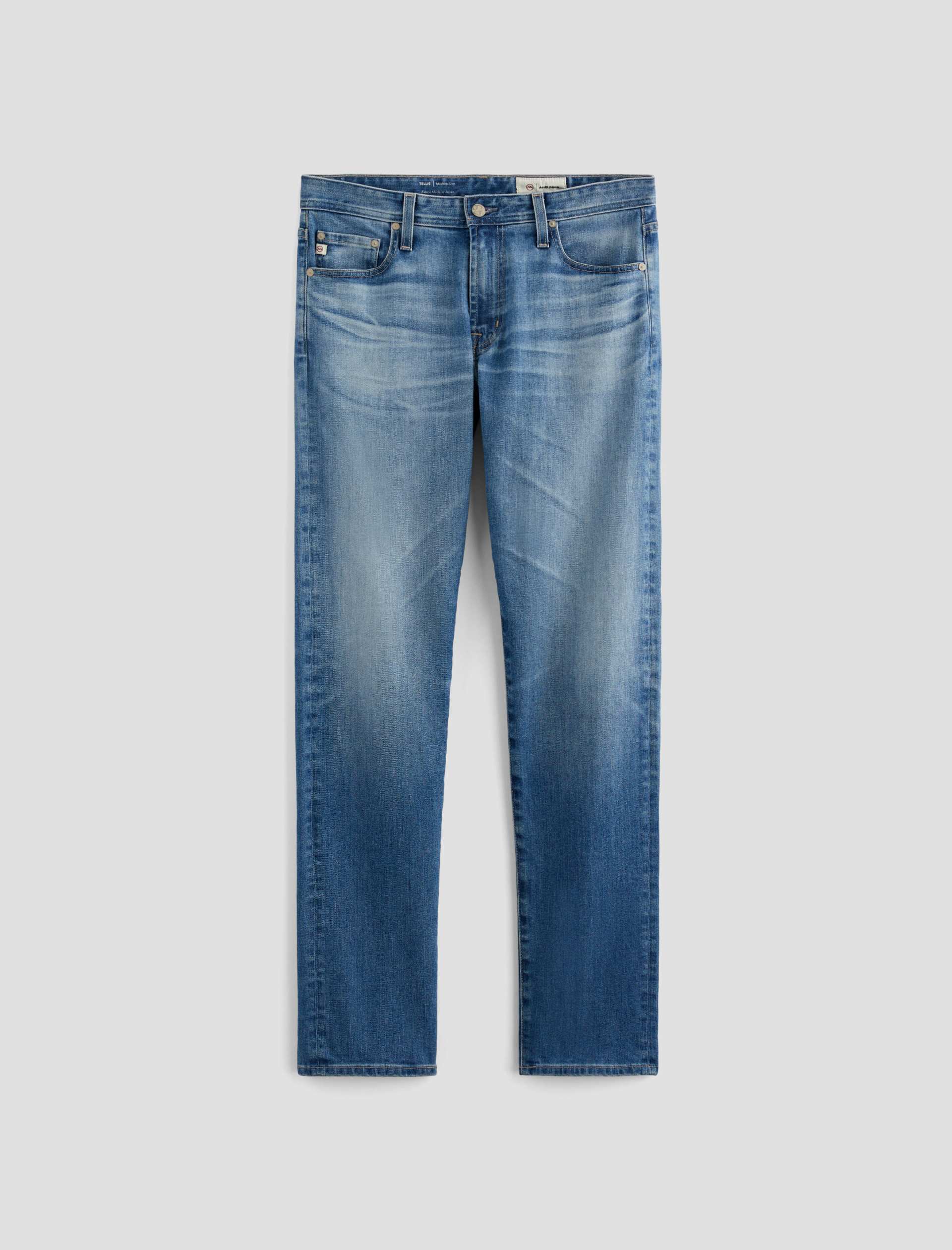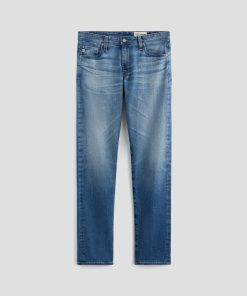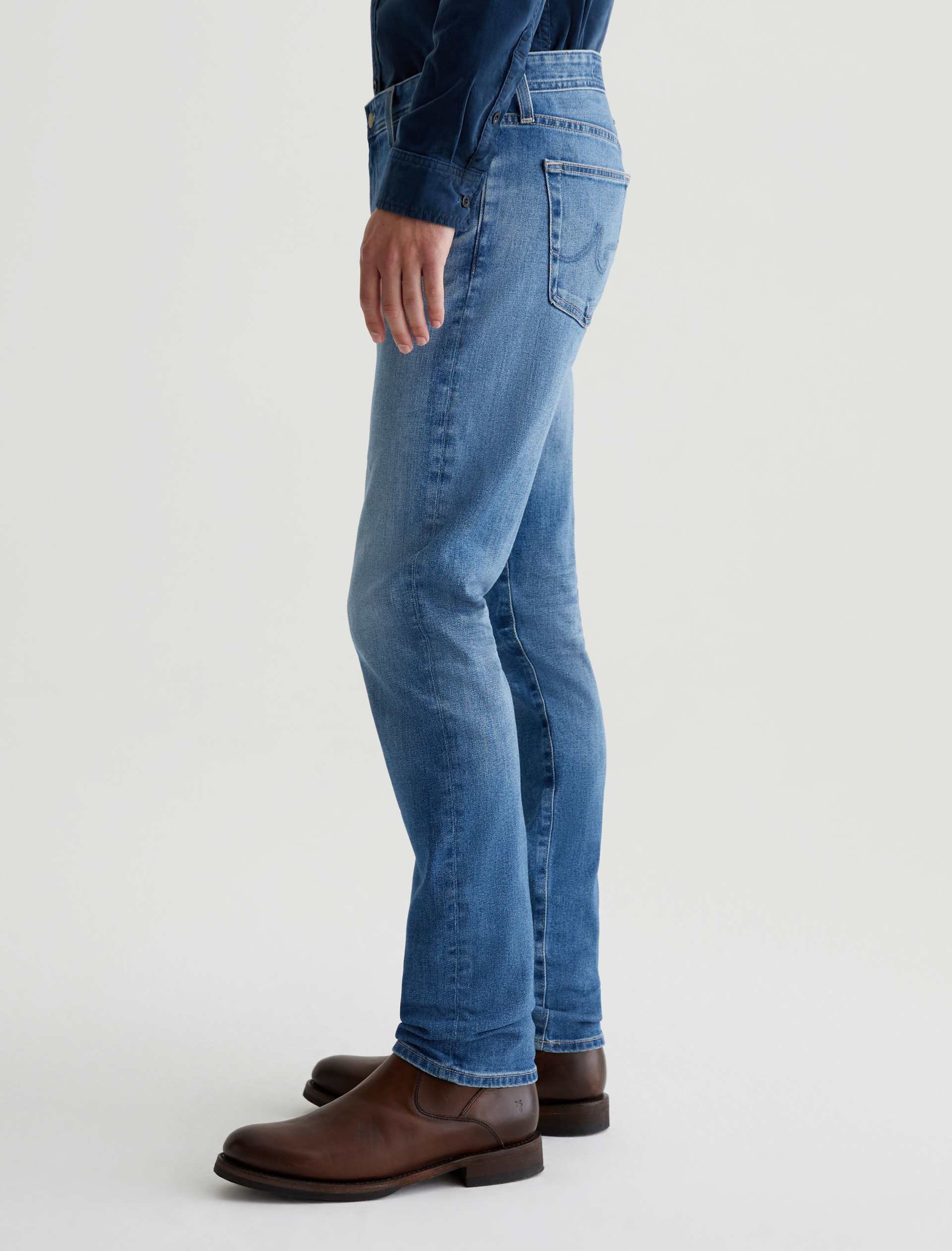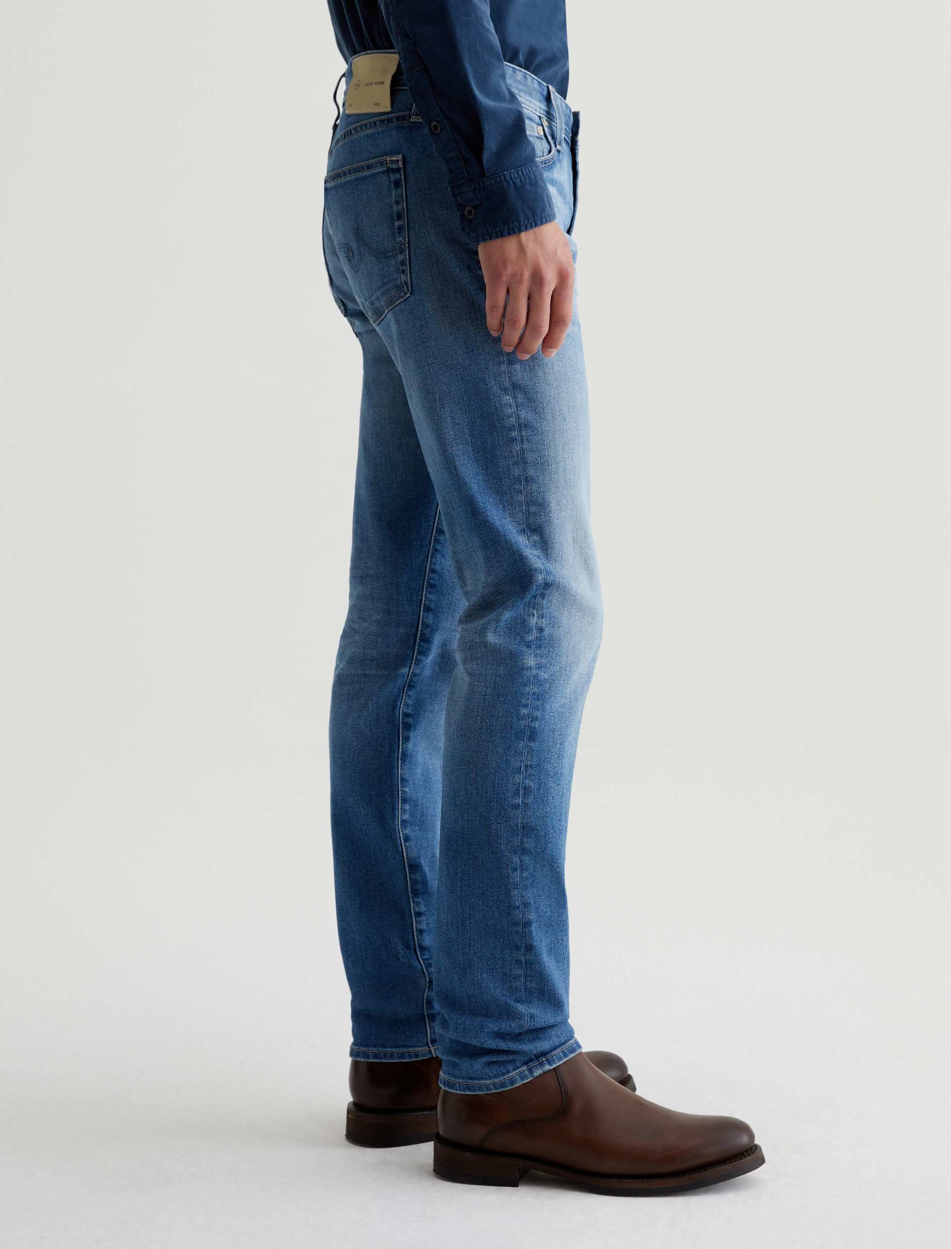 Our Tellis modern slim-fit jeans are cut with a fitted upper block and slender legs that taper at the ankle. This pair has a bit of stretch in 11.2 oz. New Union Dark Denim from Italy. Washed to a medium indigo shade, the style features a 19-year AG-ed™ Denim finish with fading, whiskering, and a subtle honeycomb wear