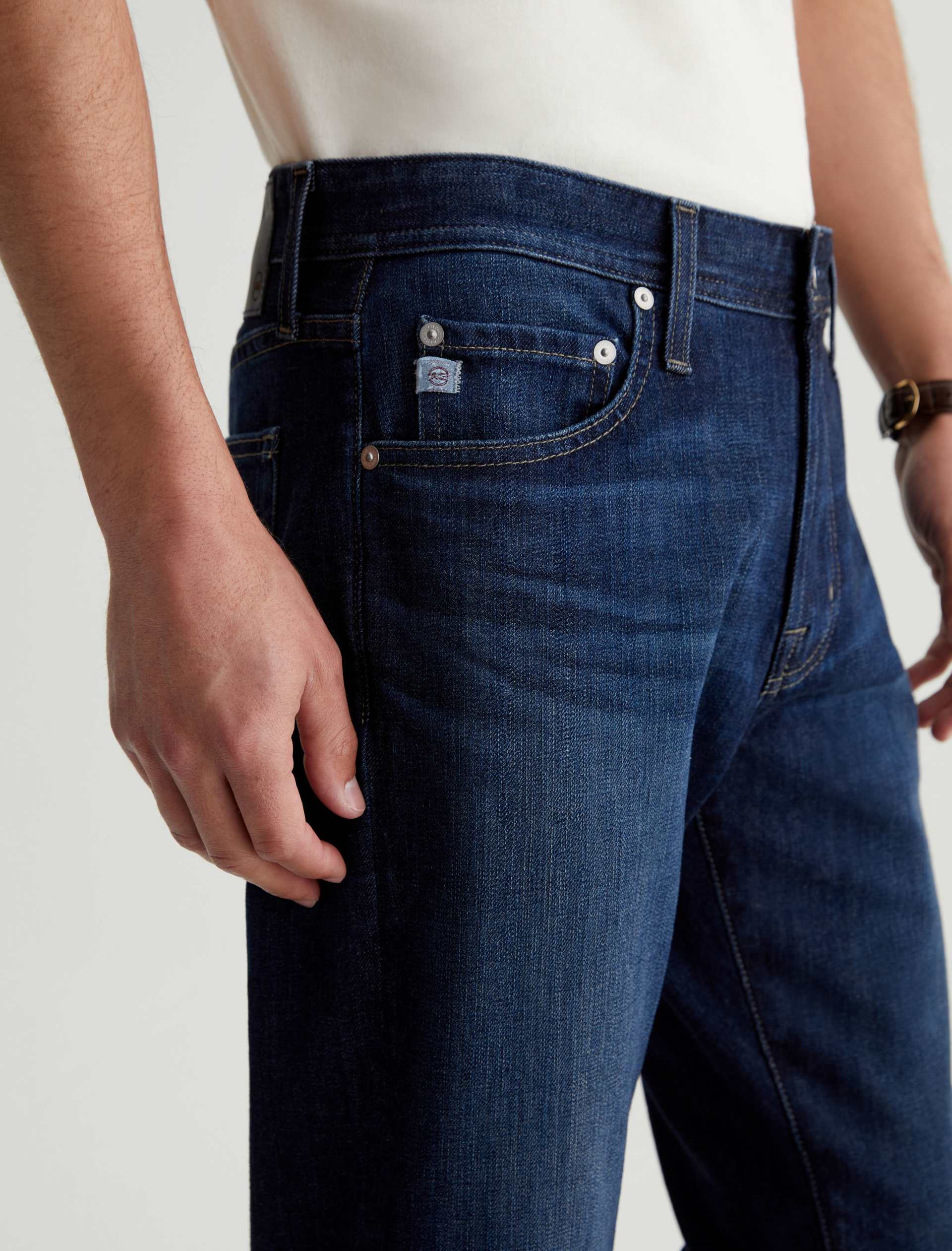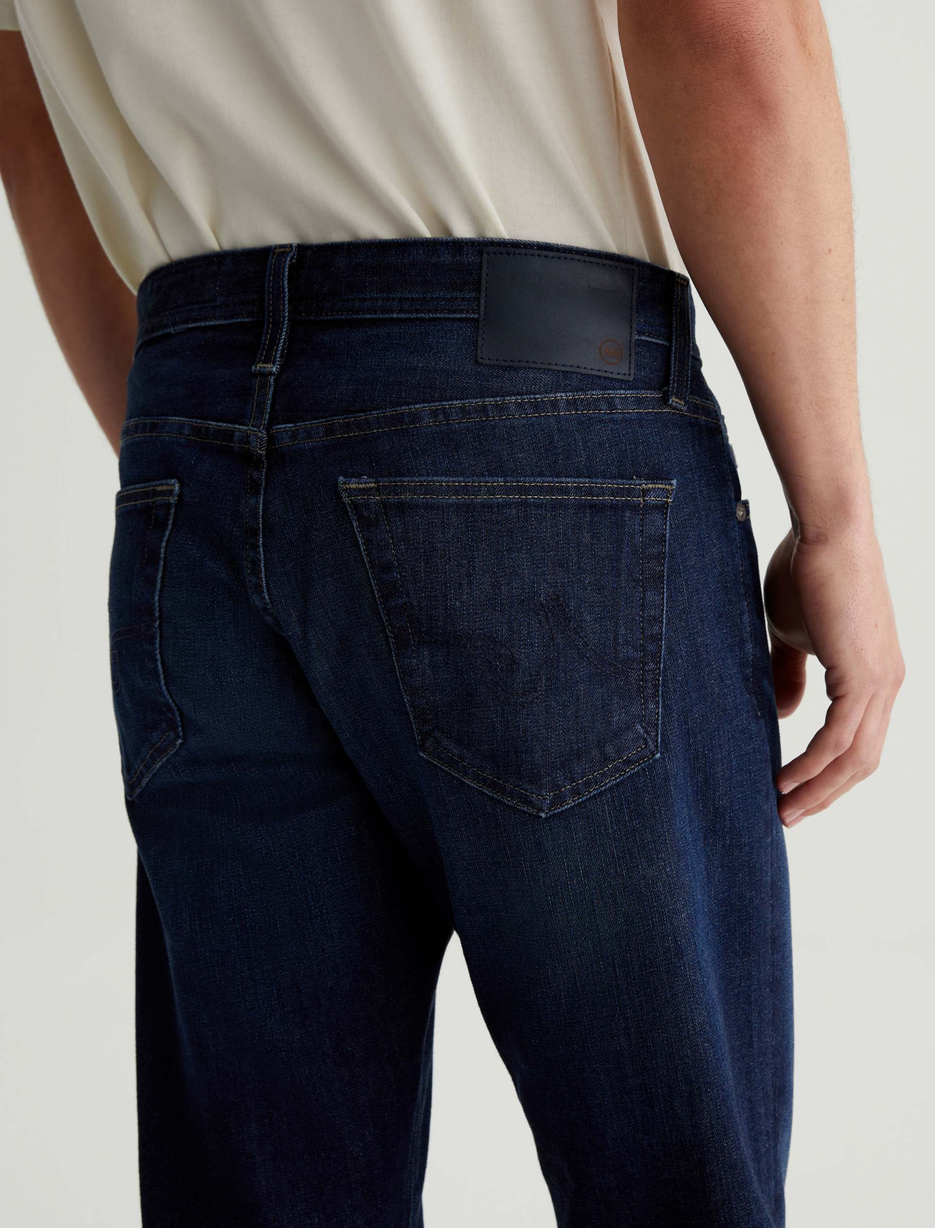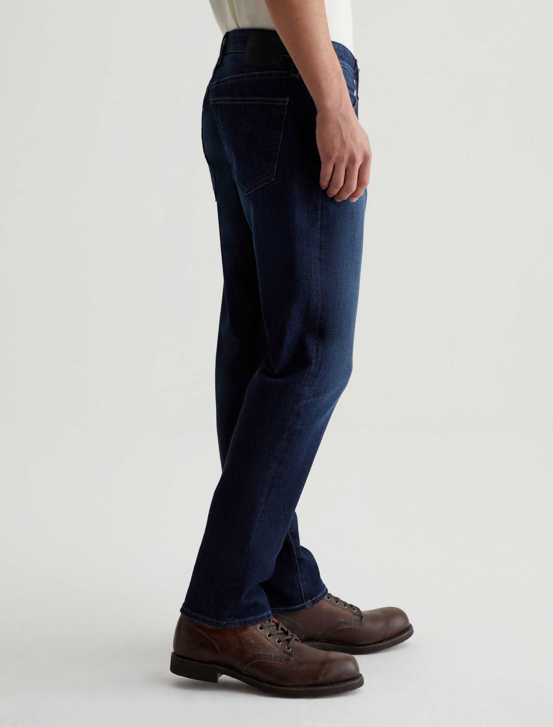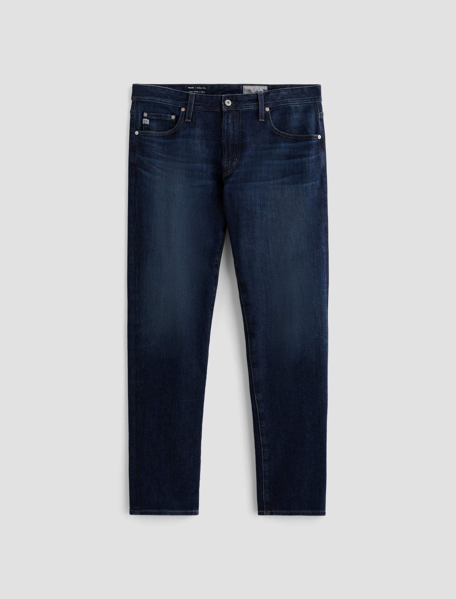 Our Tellis 360° is a modern slim featuring a fitted upper block and tapered leg opening. It’s done in a dark indigo wash with a bit of fading and whiskering. These slim-cut men’s jeans are incredibly comfortable and easy to wear in 11 oz. Flex 360° Denim from Japan.