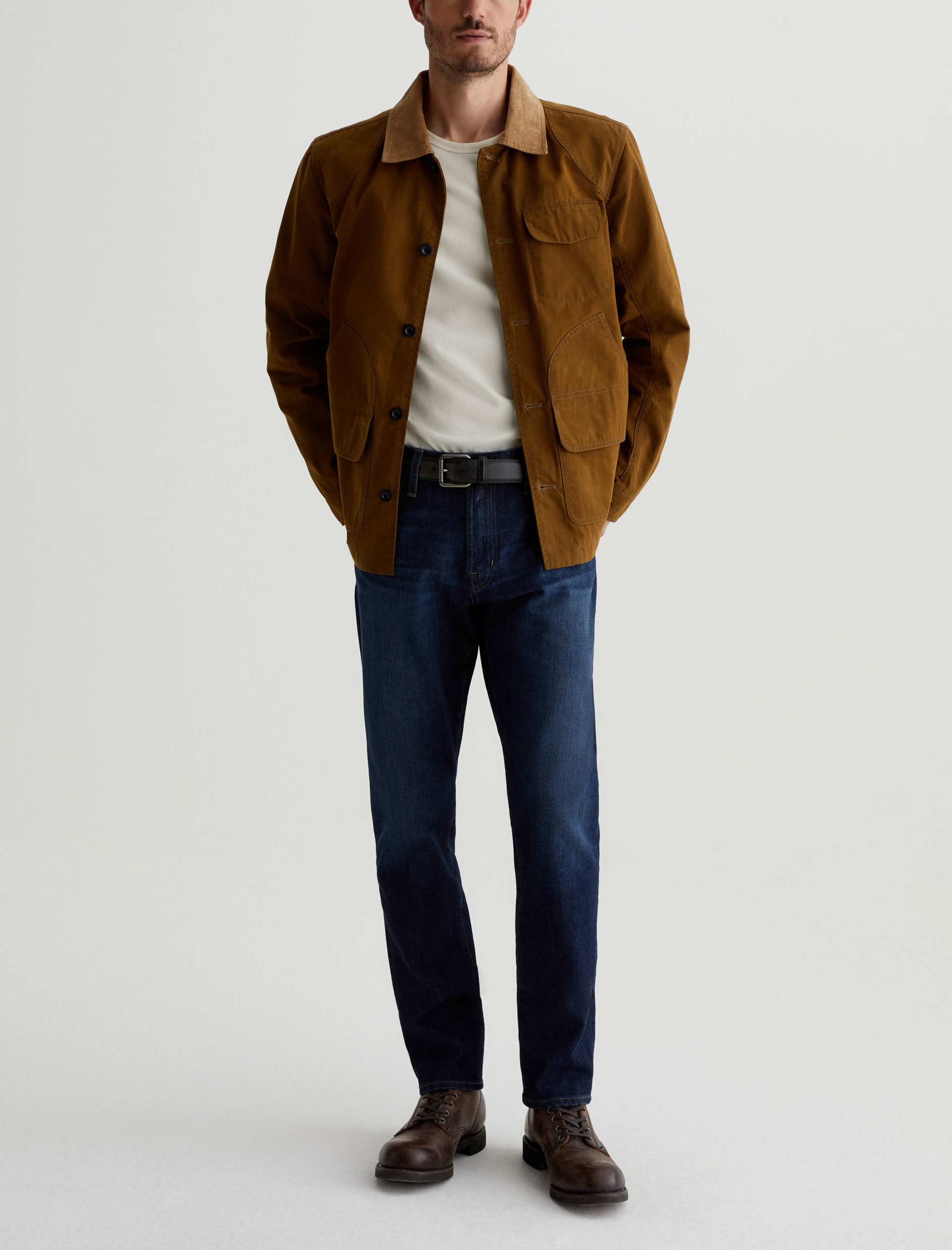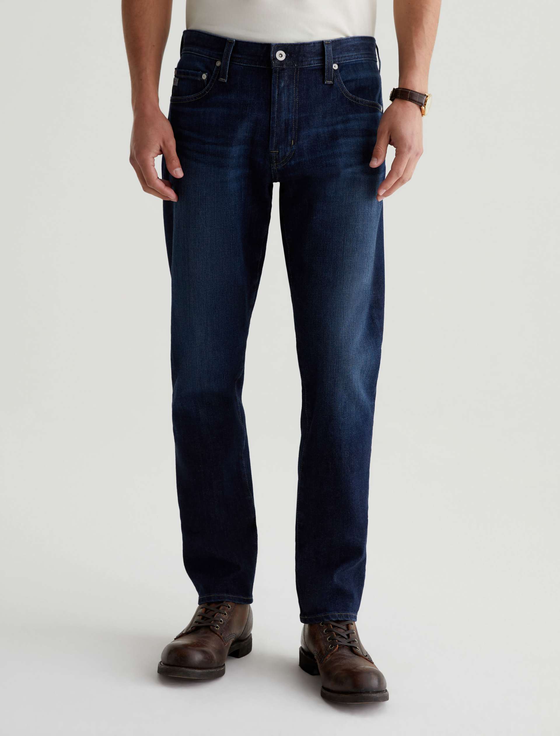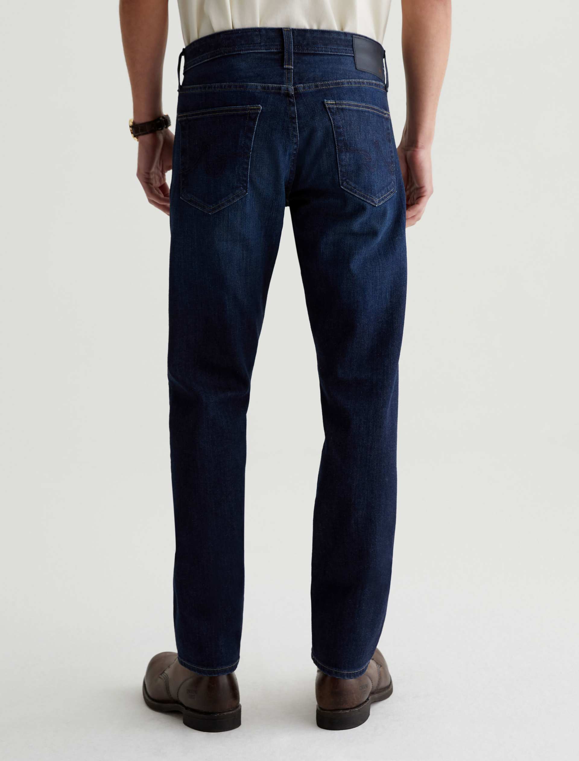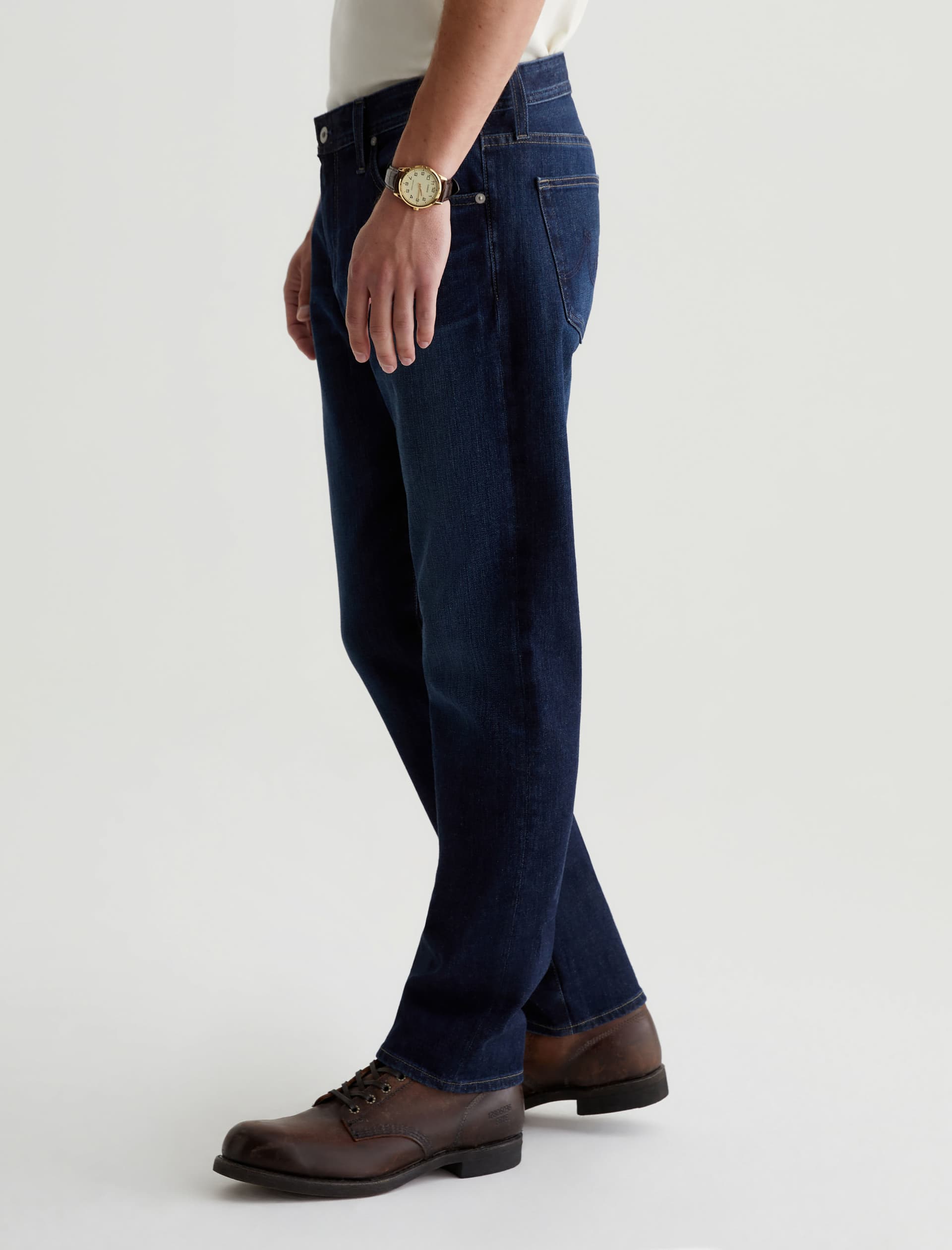 Our Tellis 360° is a modern slim featuring a fitted upper block and tapered leg opening. It’s done in a dark indigo wash with a bit of fading and whiskering. These slim-cut men’s jeans are incredibly comfortable and easy to wear in 11 oz. Flex 360° Denim from Japan.