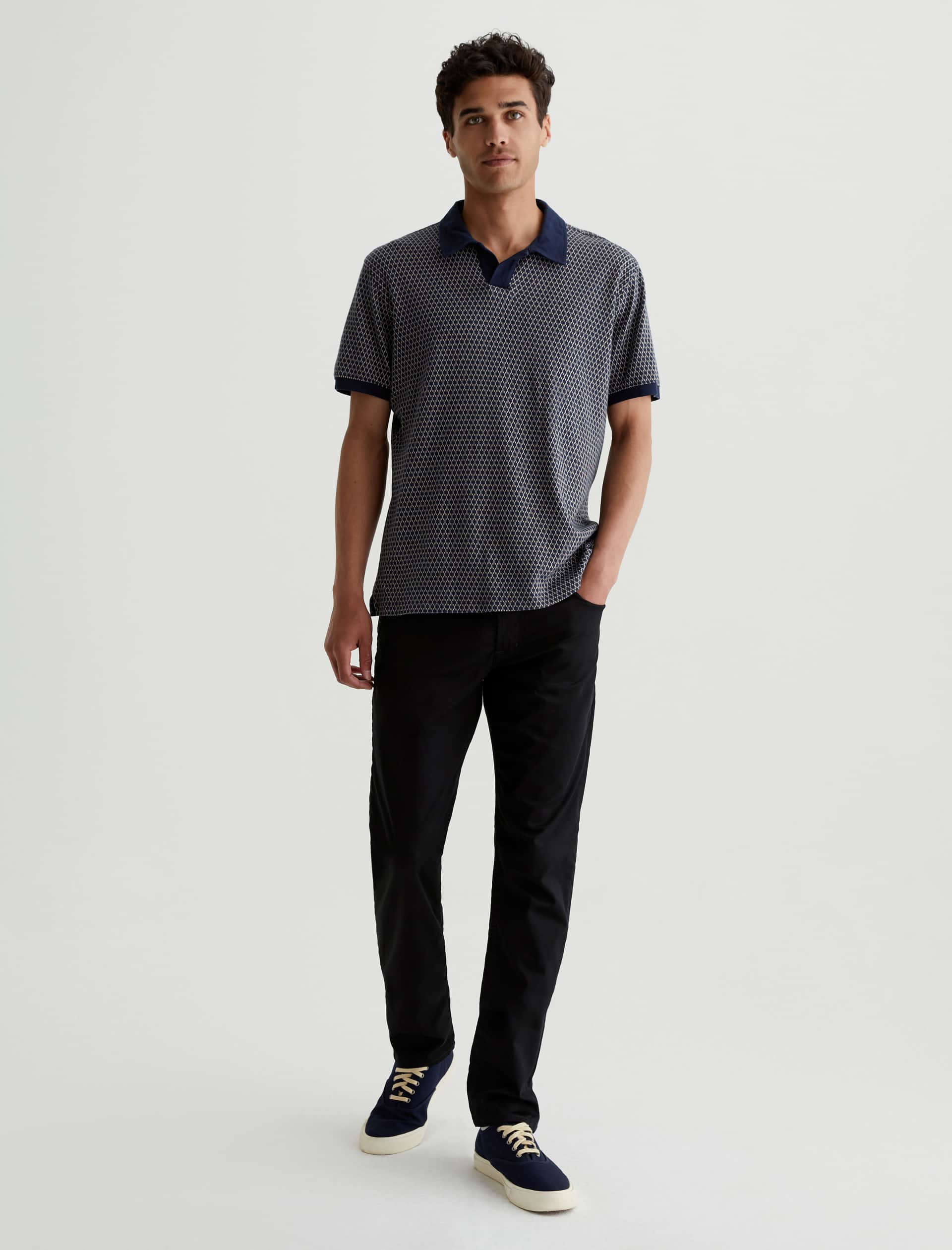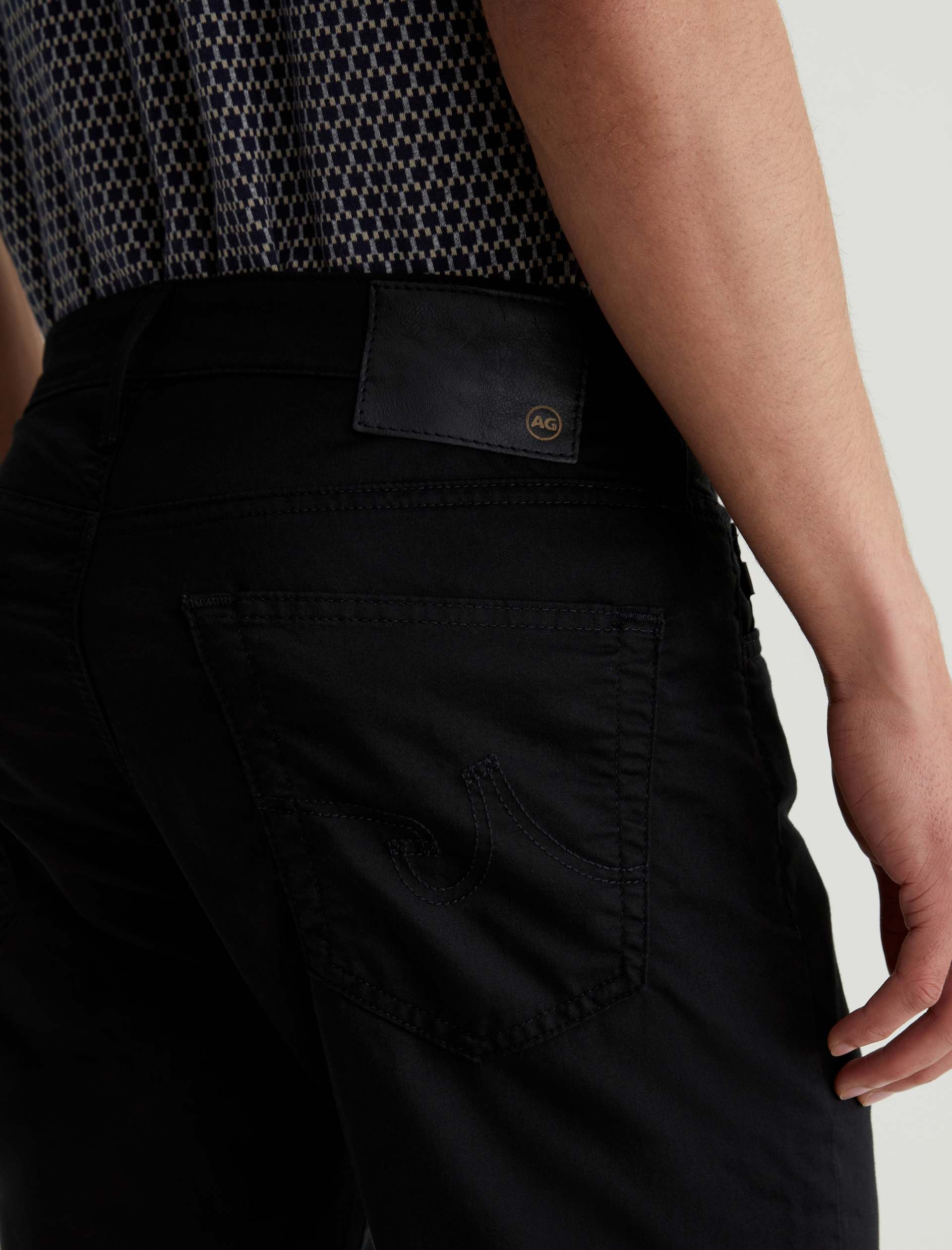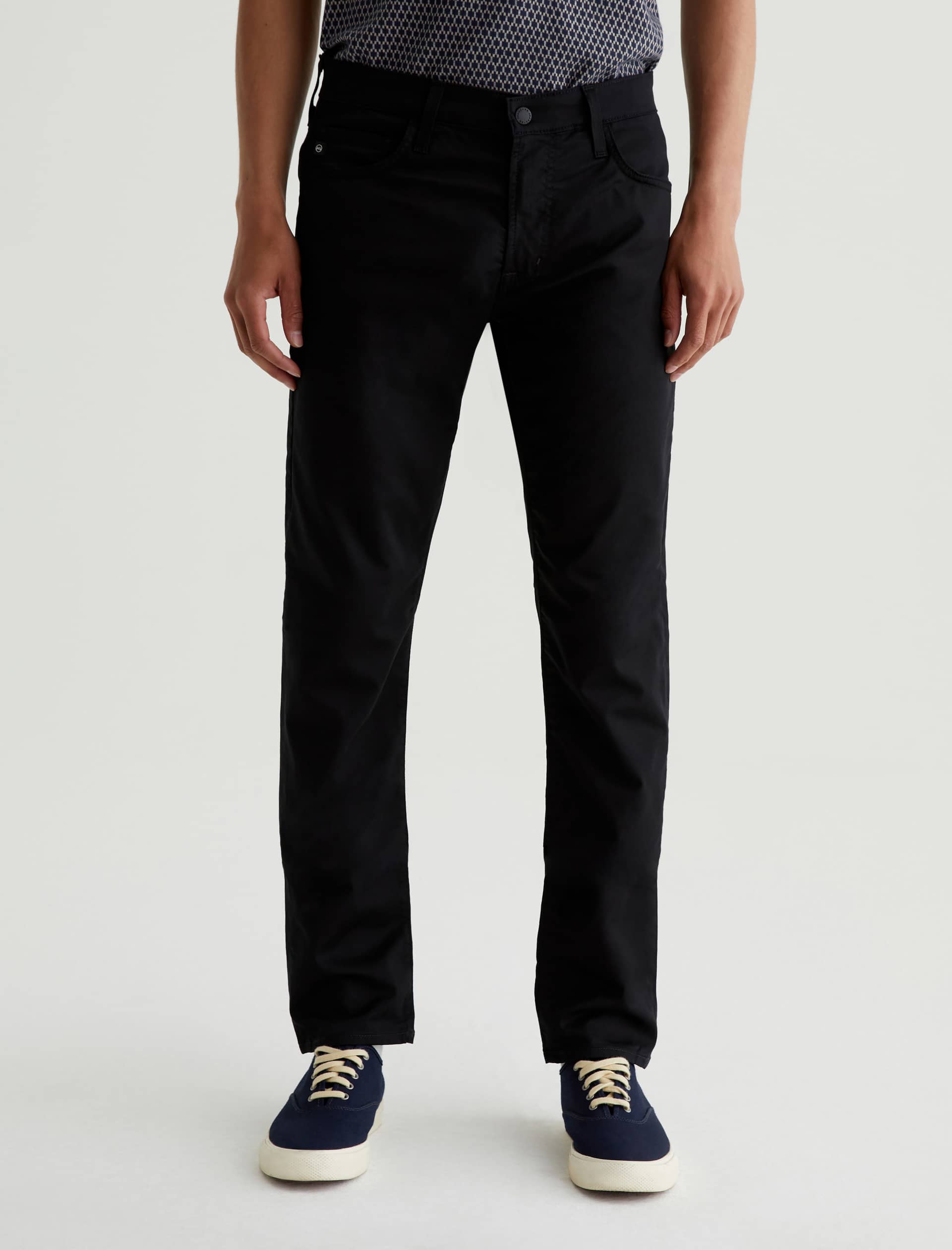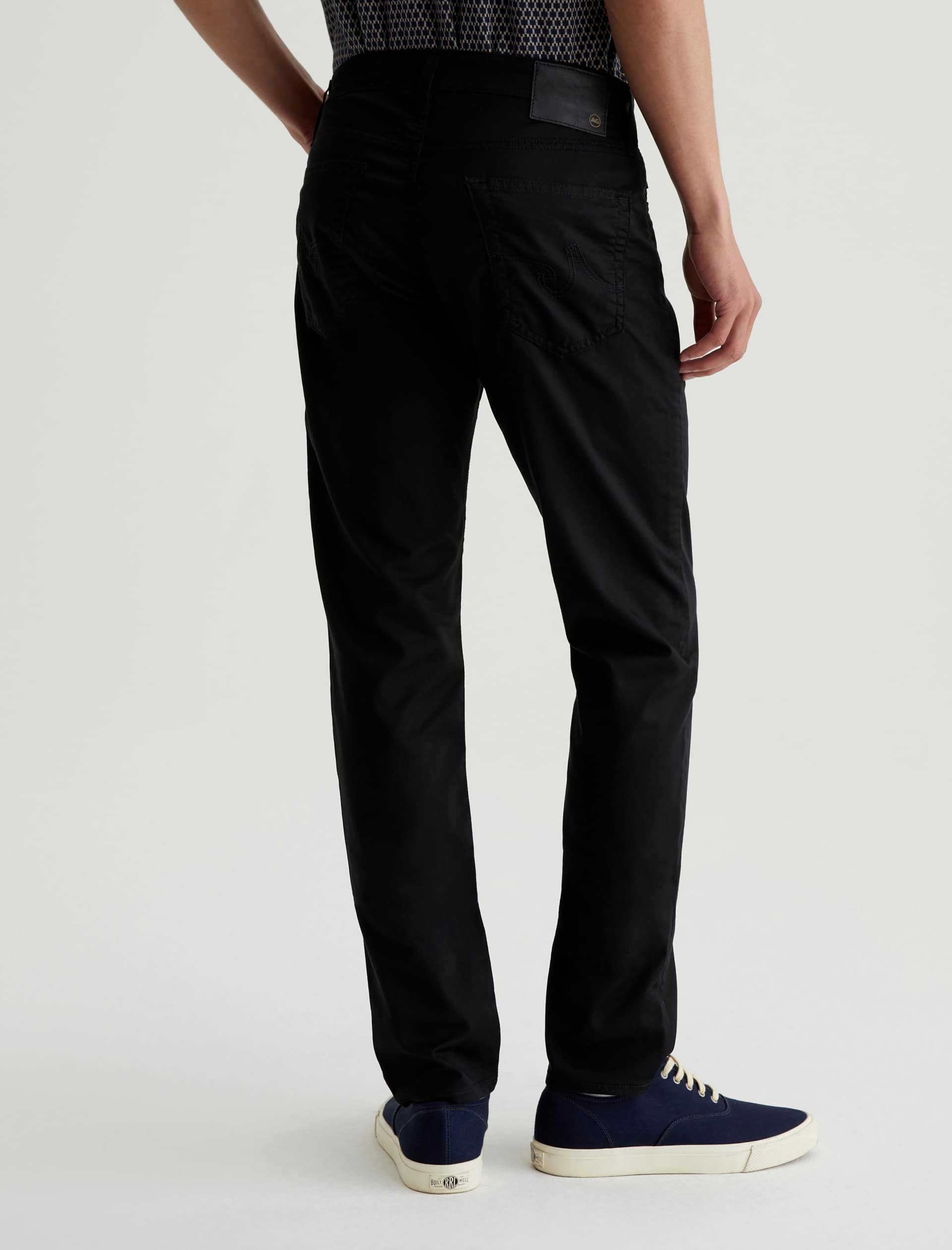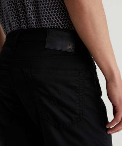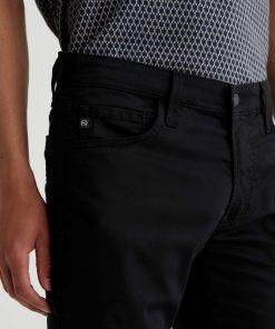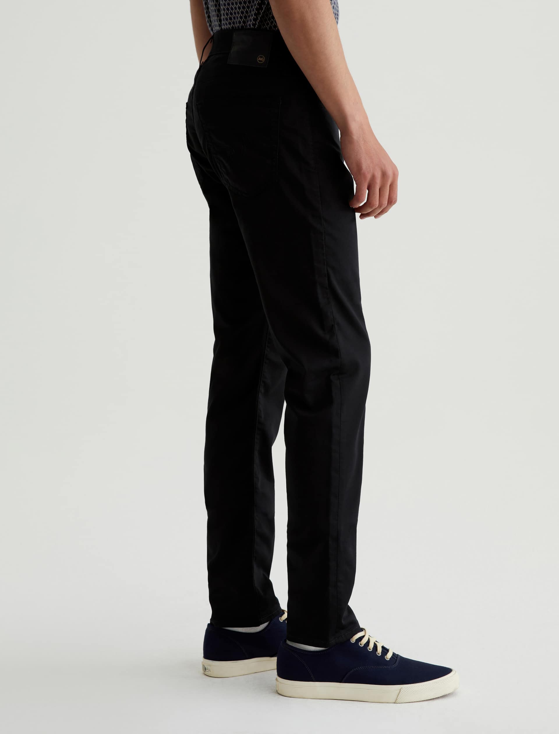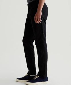 The Tellis is a modern slim fit crafted from our 5.9 oz. Airluxe™ Commuter Performance Sateen with premium stretch for enhanced mobility. Featuring a fitted upper block and tapered leg opening, this five-pocket pant comes in a versatile black shade complemented by tonal stitching and a matching shank button.