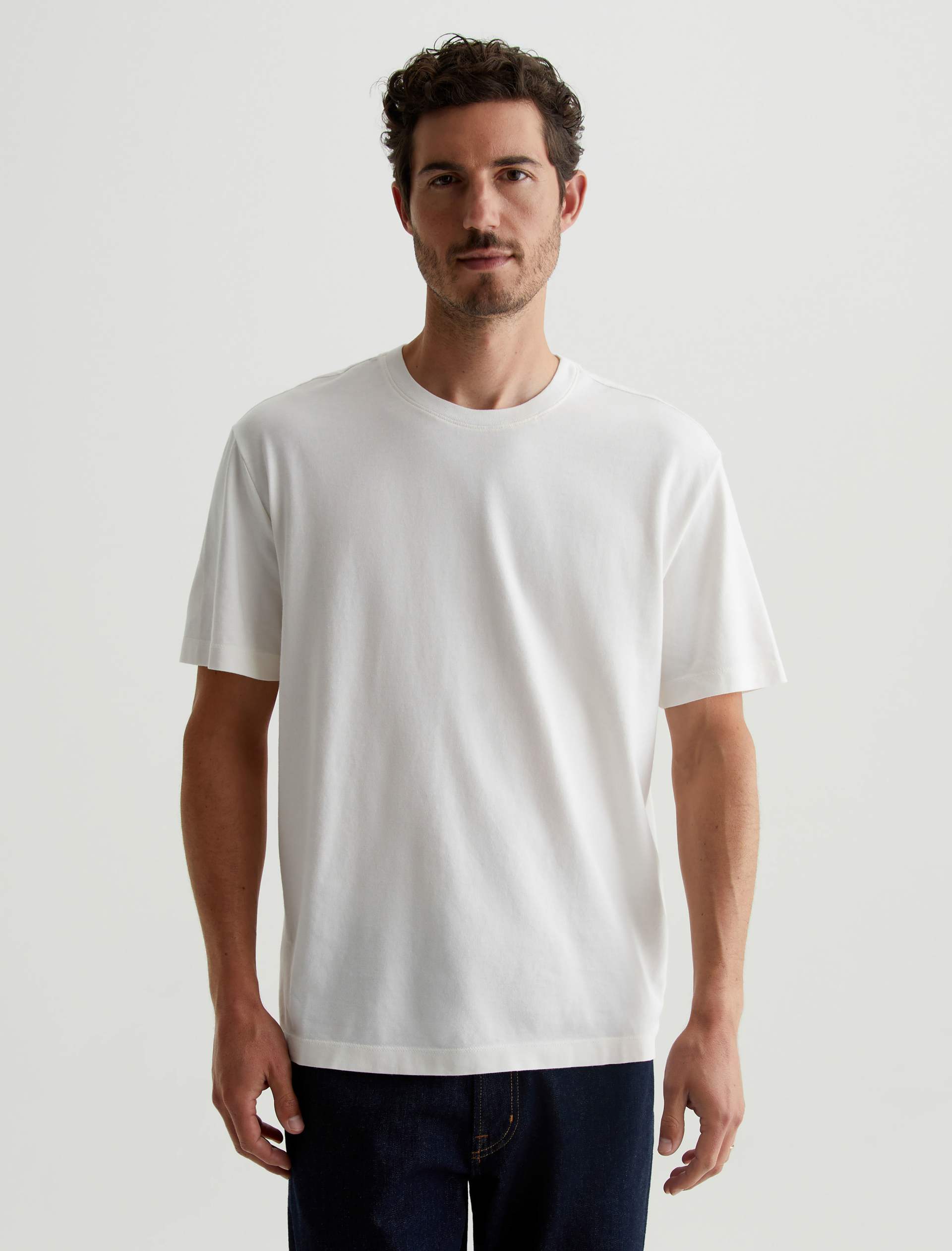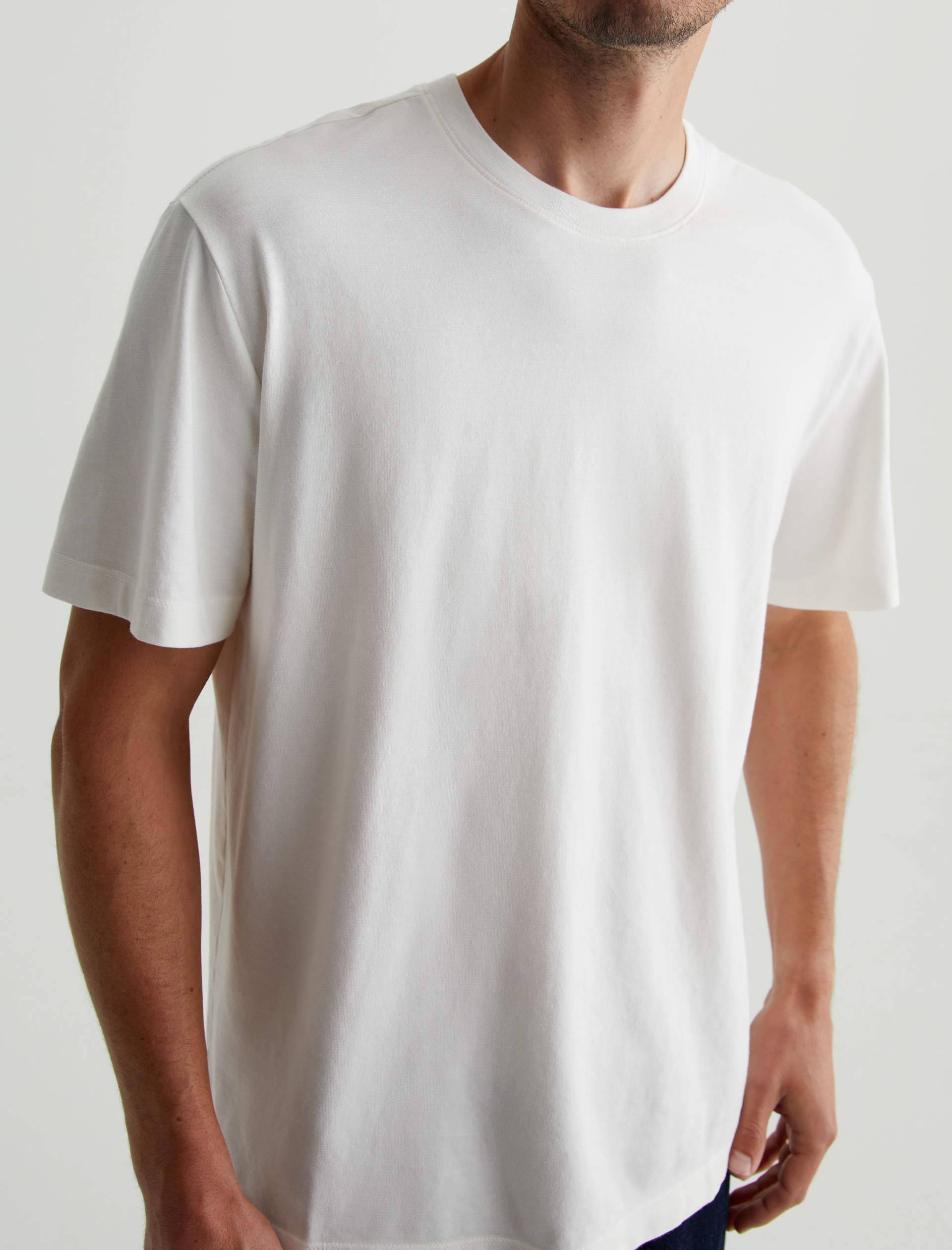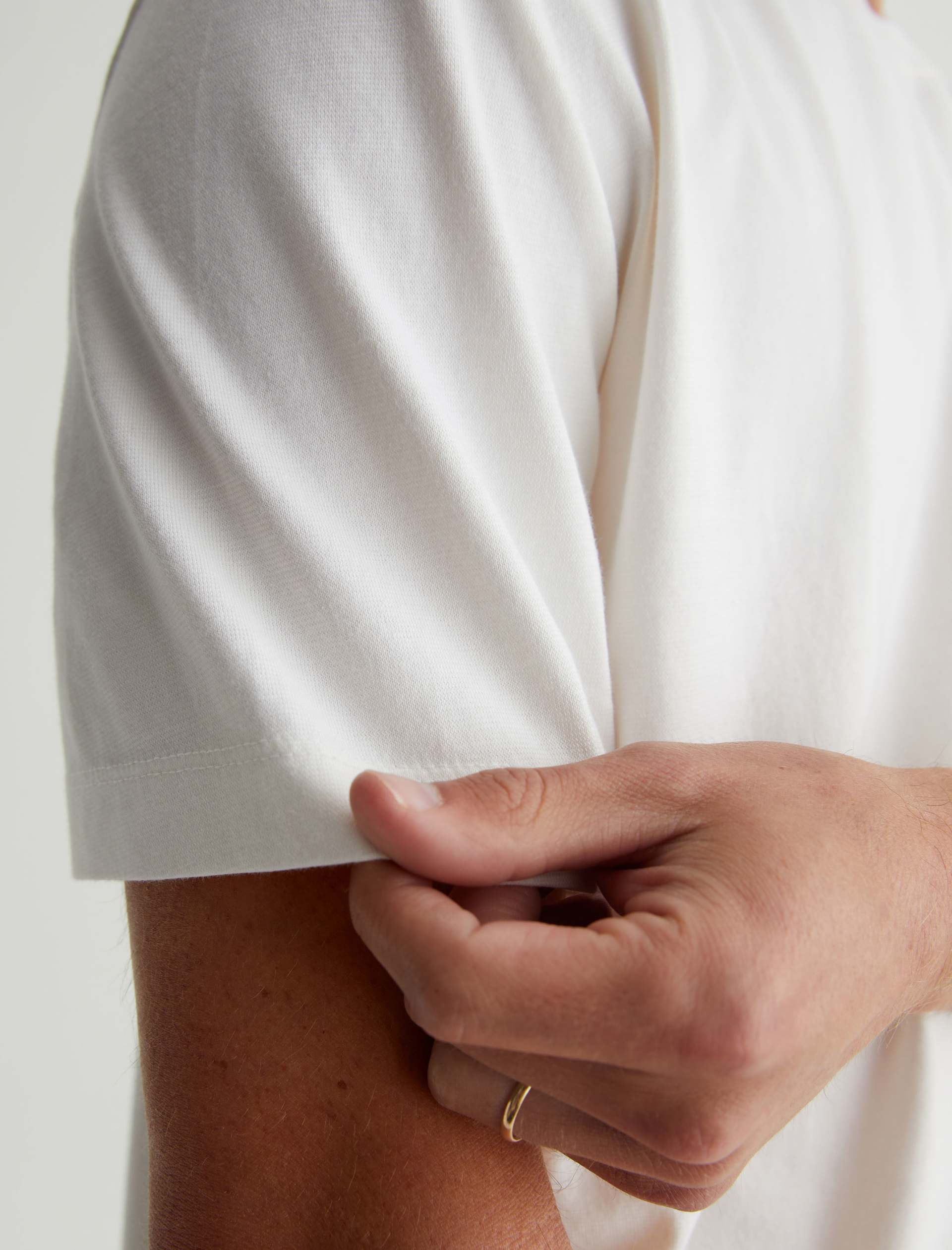 The Wesley Crew in ivory dust is a relaxed short-sleeve tee for men. The tee offers drop shoulder detailing and wider hem for a more fashion forward fit. Our Jersey Knit offers a luxurious comfort that is unrivaled—knitted with both S-twist and Z-twist yarn to sustain longevity and stability, preventing unnecessary twi