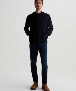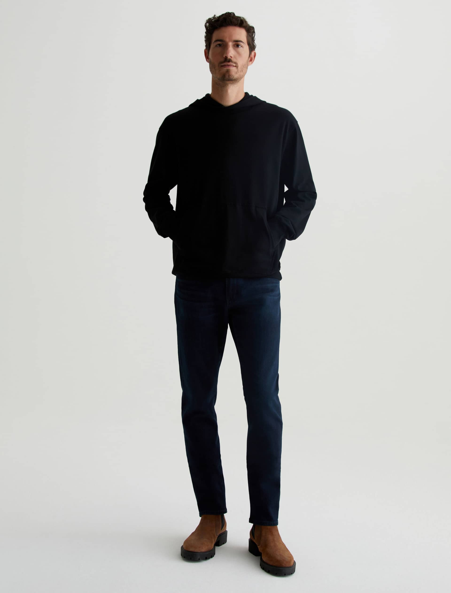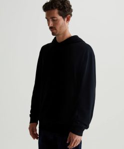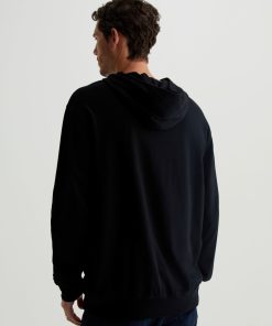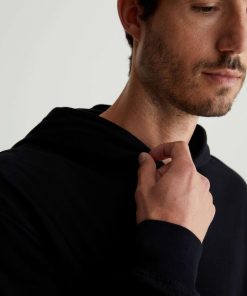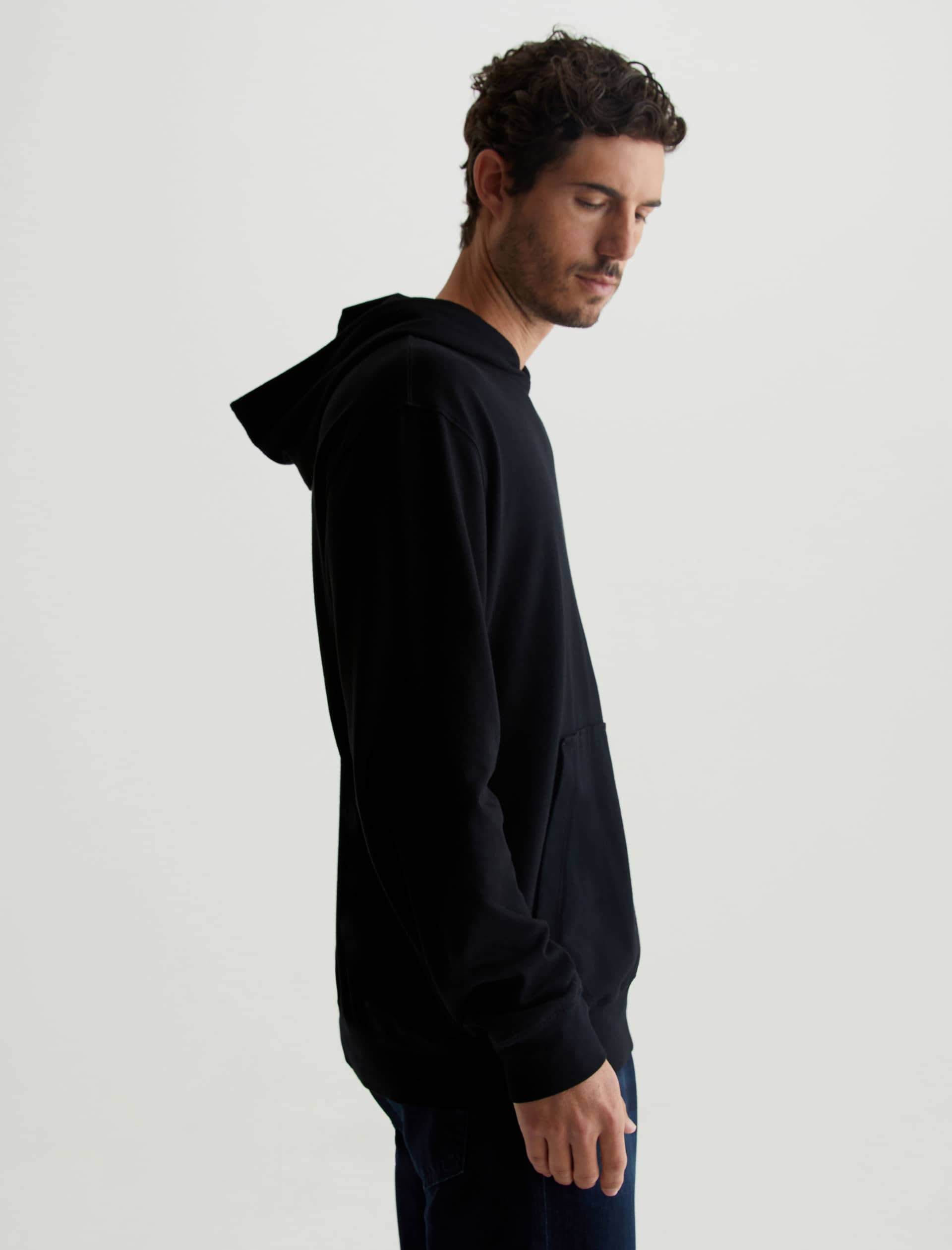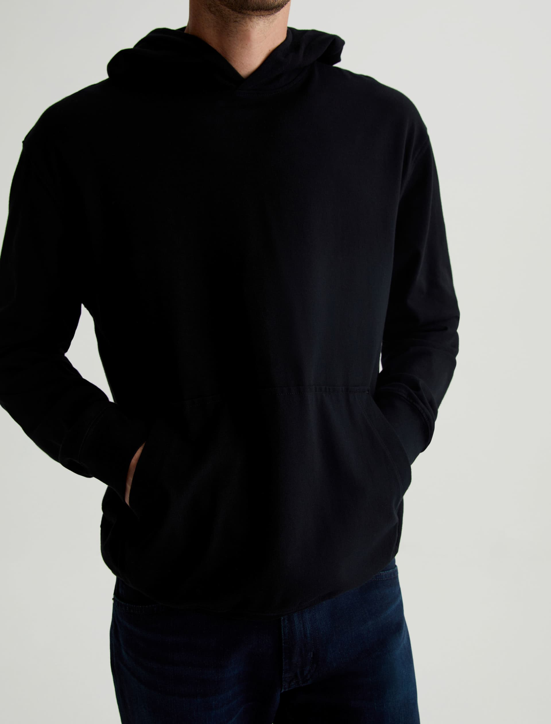 The Wesley Hoodie in black is a lightweight jersey sweatshirt complete with a front kangaroo pocket and a hoodie that is double layered for shape and structure. Our Jersey Knit offers a luxurious comfort that is unrivaled—knitted with both S-twist and Z-twist yarn to sustain longevity and stability, preventing unnecess