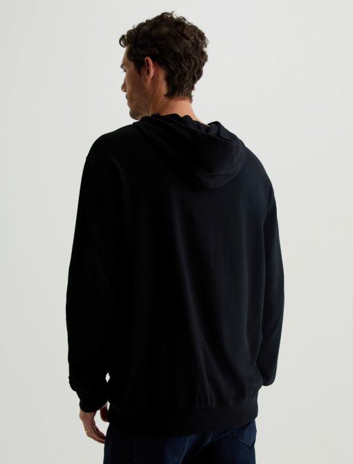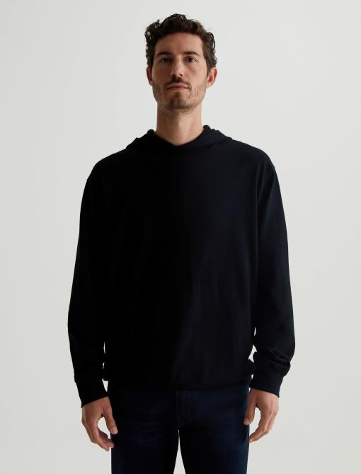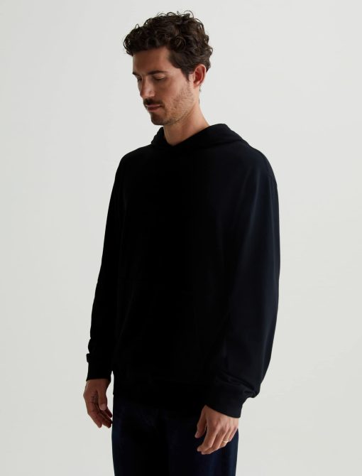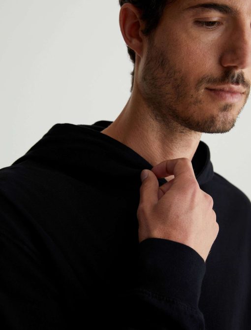 The Wesley Hoodie in black is a lightweight jersey sweatshirt complete with a front kangaroo pocket and a hoodie that is double layered for shape and structure. Our Jersey Knit offers a luxurious comfort that is unrivaled—knitted with both S-twist and Z-twist yarn to sustain longevity and stability, preventing unnecess