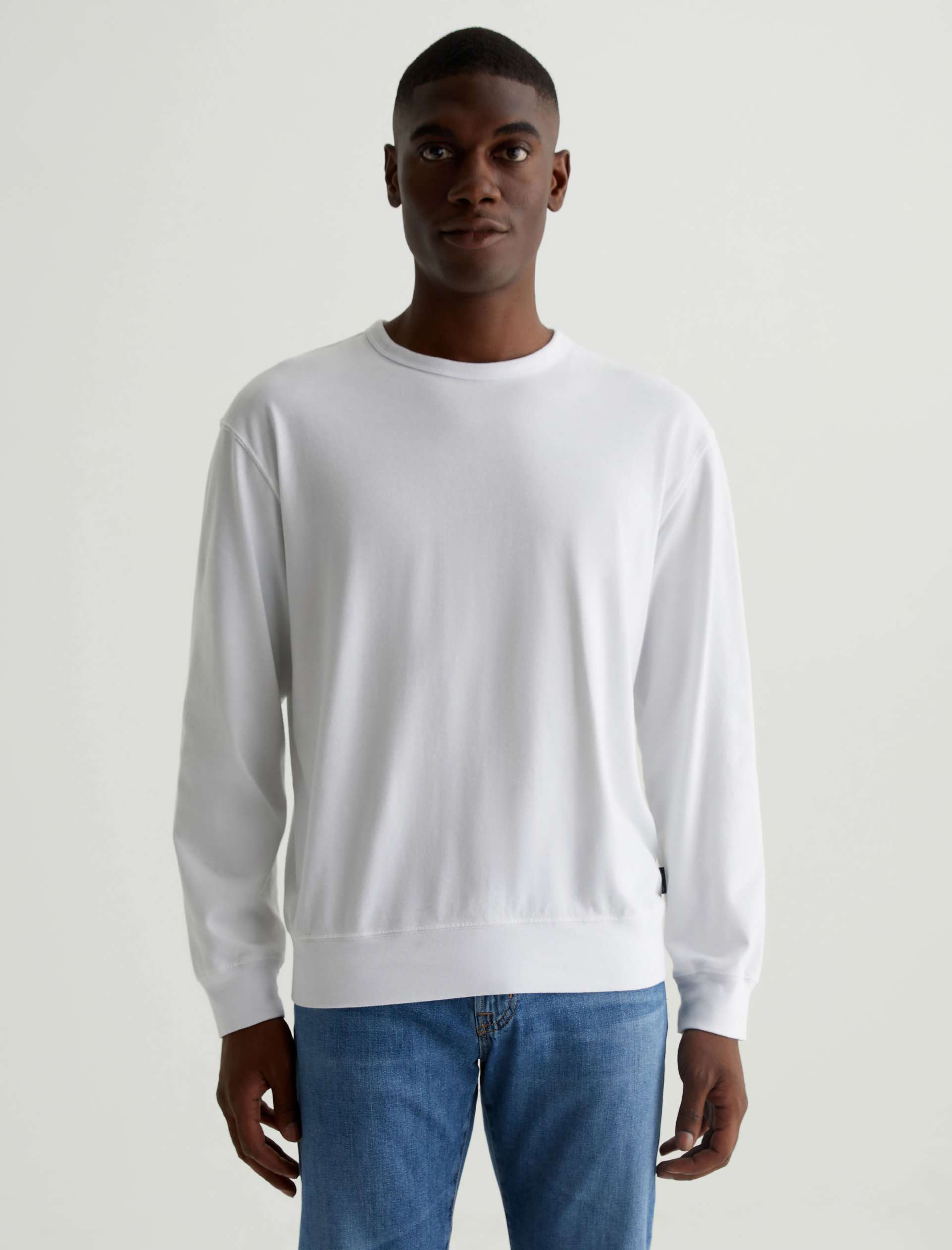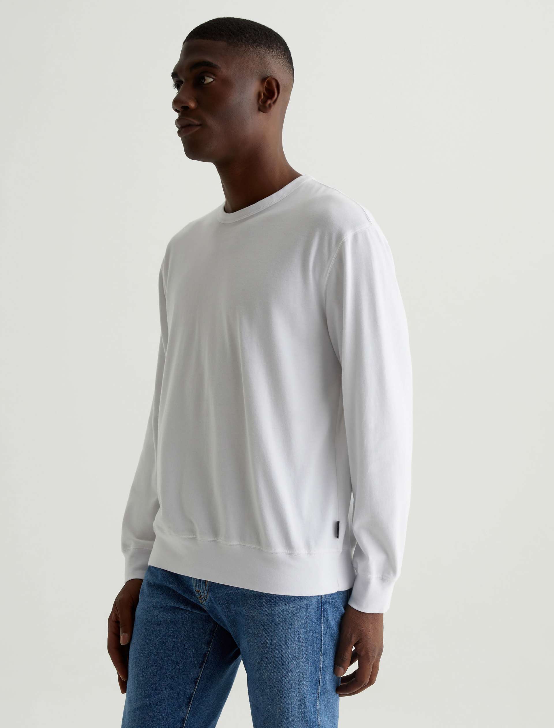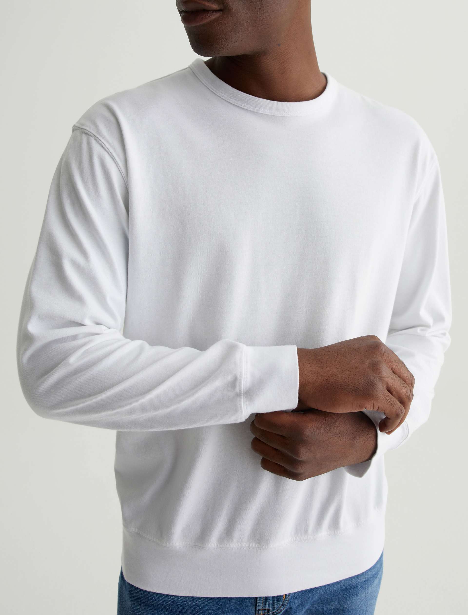 The Wesley Pullover in white is a new silhouette added to our Basic Essentials collection. Borrowing details from a traditional sweatshirt such as rib binding, cuffs, and bottom hem allowed us to create a lightweight pullover that feels classic, modern, and uniform. Our Jersey Knit offers a luxurious comfort that is un