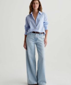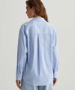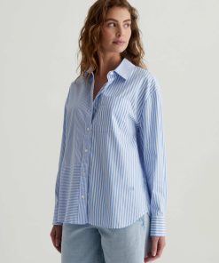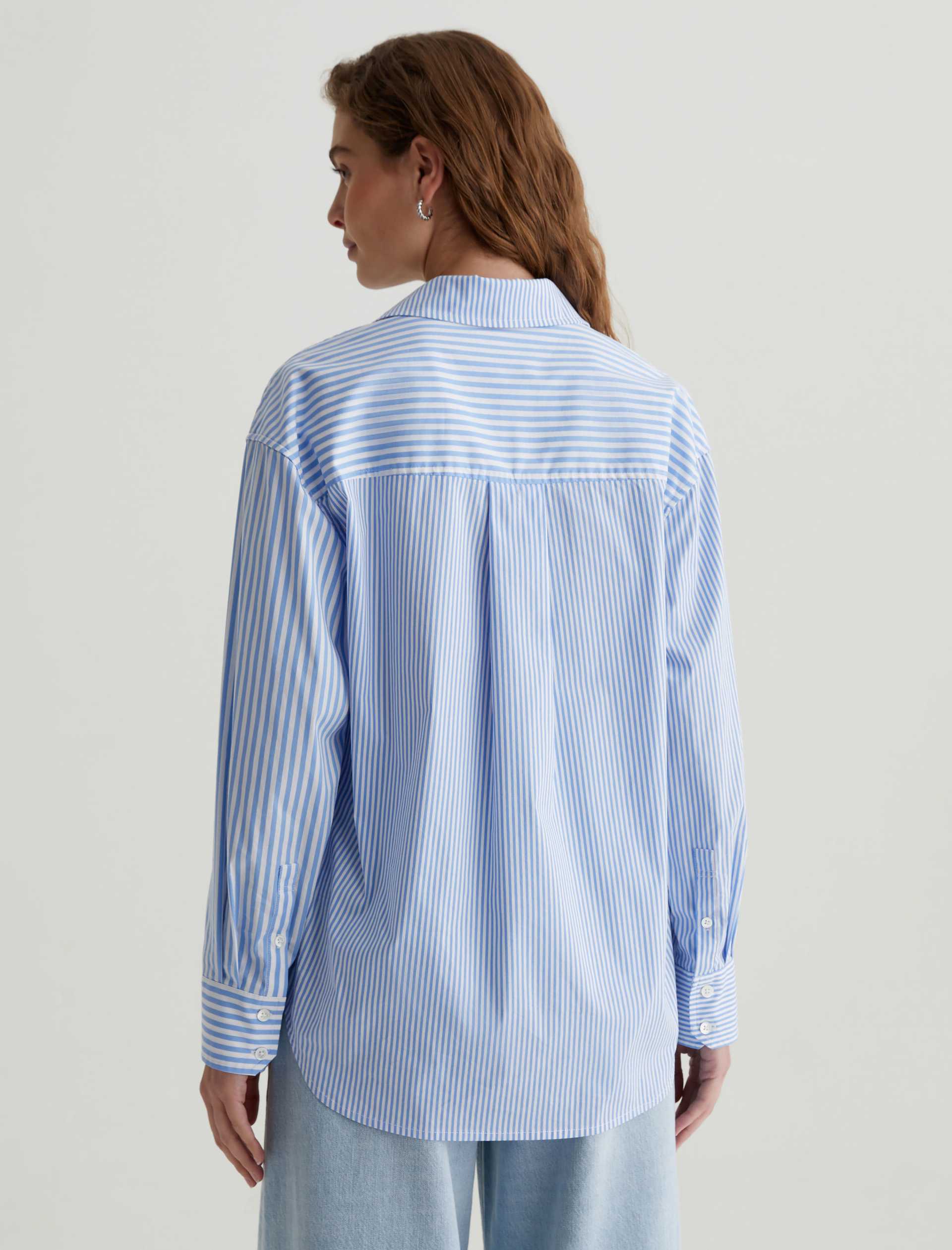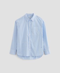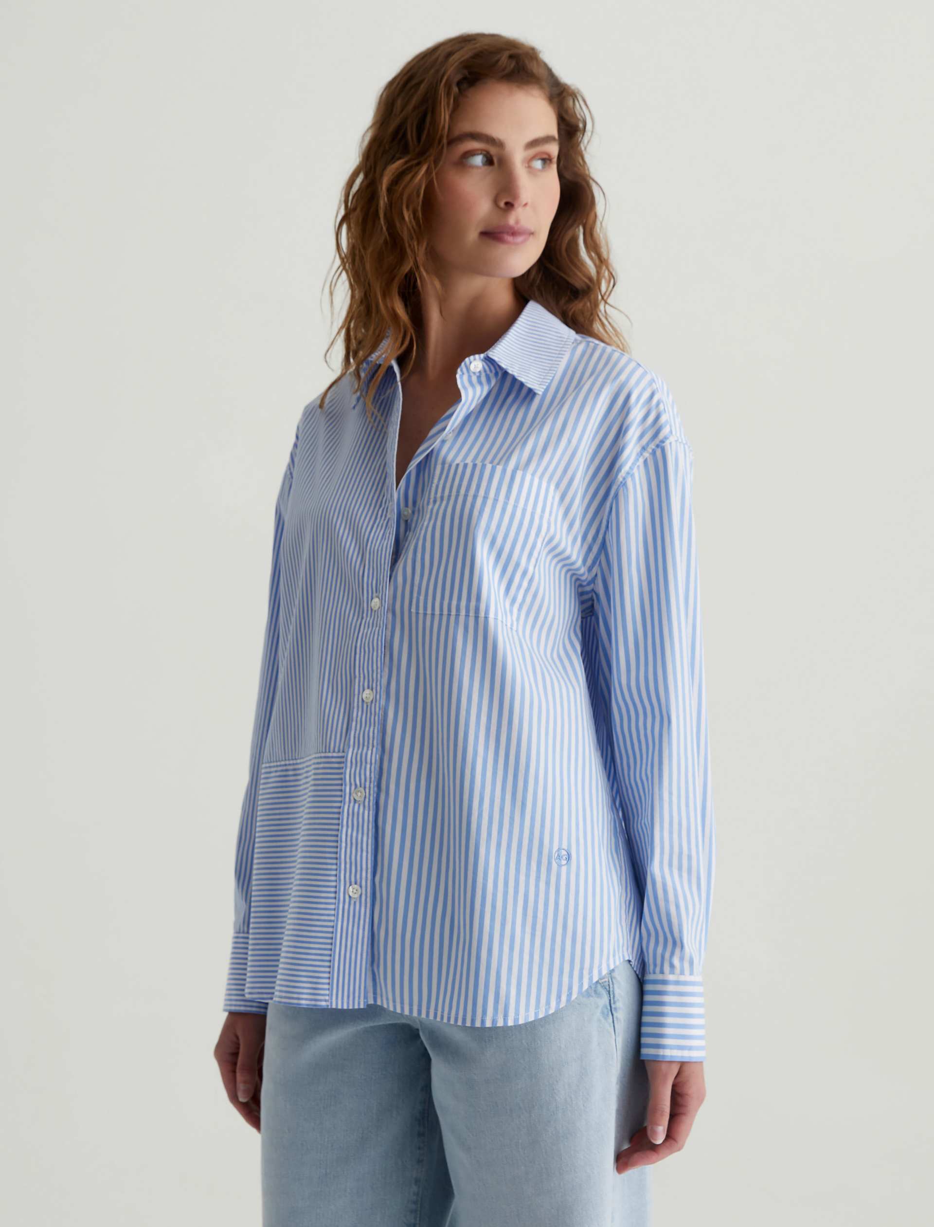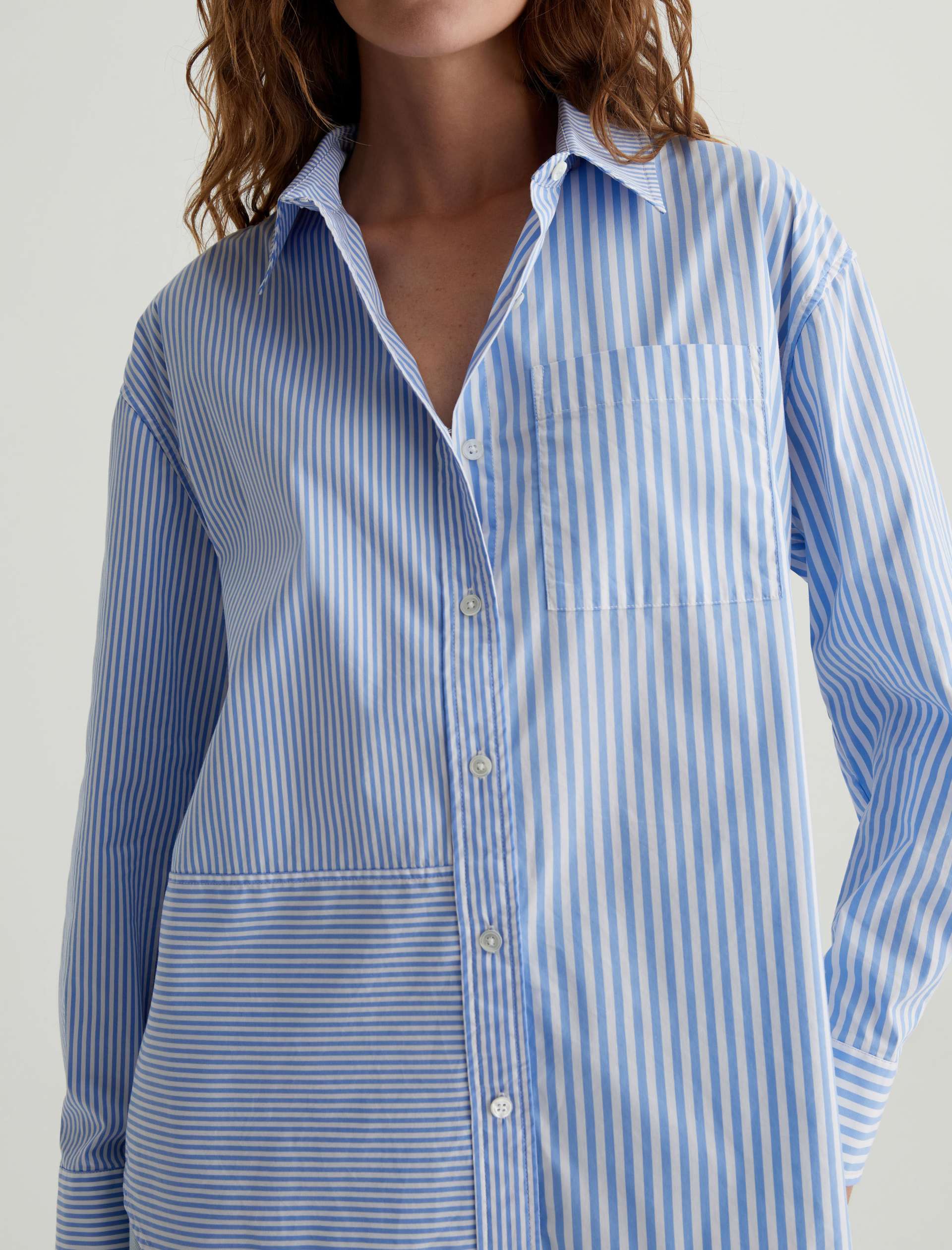 The Addison Shirt takes inspiration from vintage men’s styles. Cut from stretch cotton-nylon poplin, it’s patterned with a mix of vertical stripes and horizontal stripe paneling. This long-sleeve button-up has a relaxed, oversized fit featuring a pointed collar, dropped shoulders, and a shirttail hem. Finished by a sin