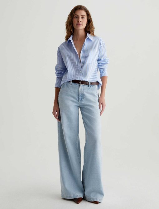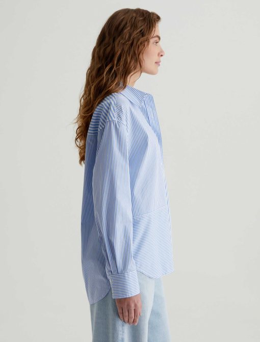The Addison Shirt takes inspiration from vintage men’s styles. Cut from stretch cotton-nylon poplin, it’s patterned with a mix of vertical stripes and horizontal stripe paneling. This long-sleeve button-up has a relaxed, oversized fit featuring a pointed collar, dropped shoulders, and a shirttail hem. Finished by a sin