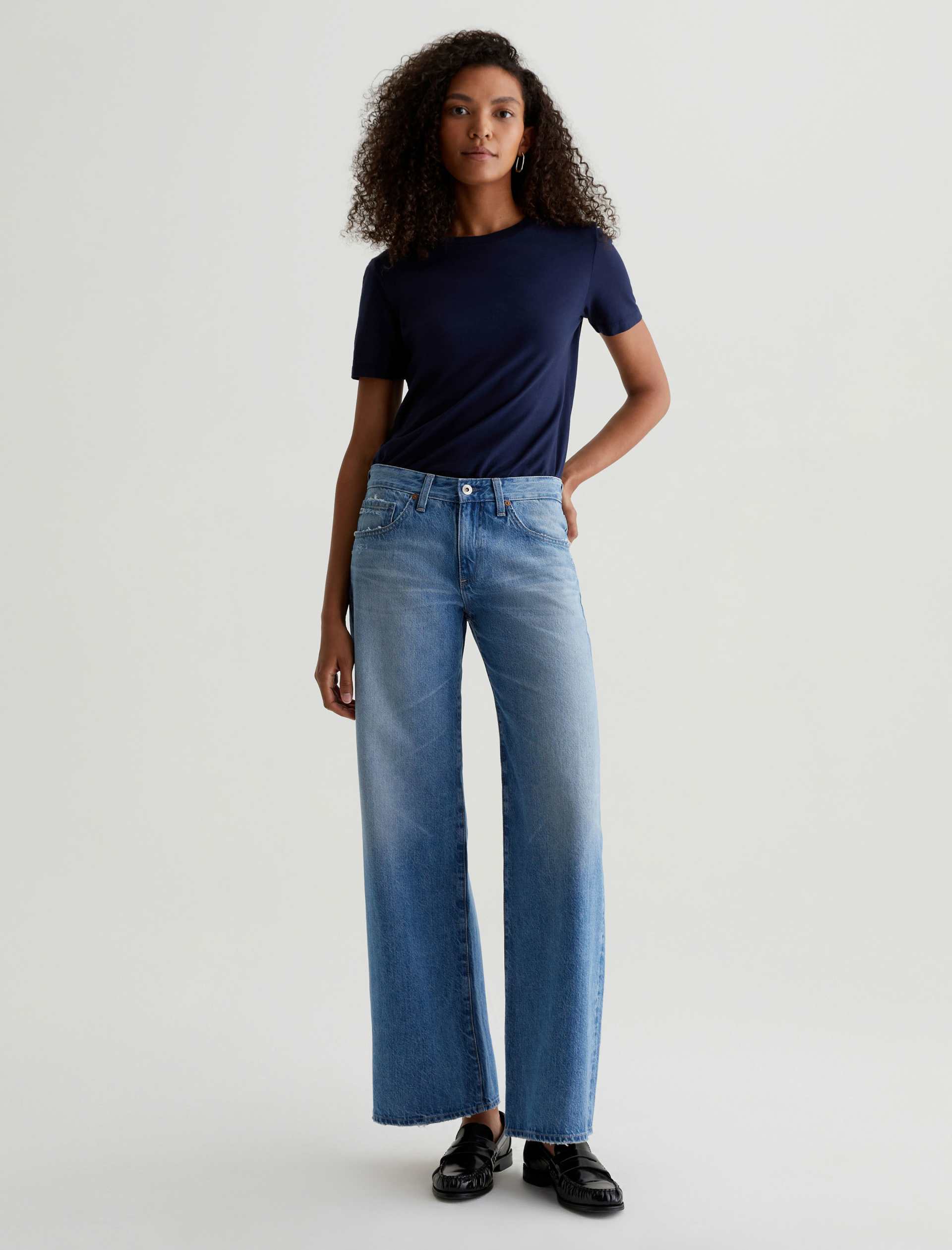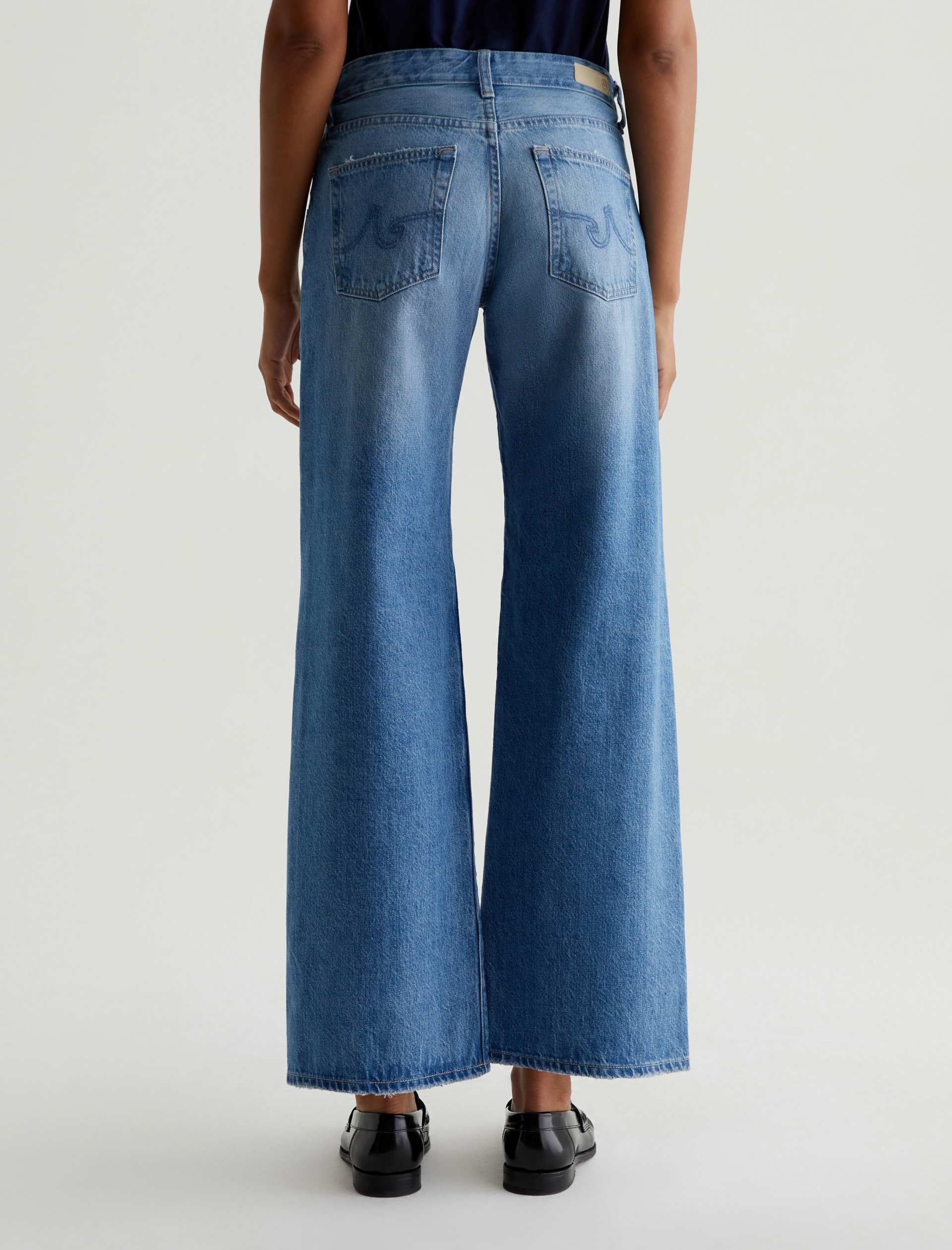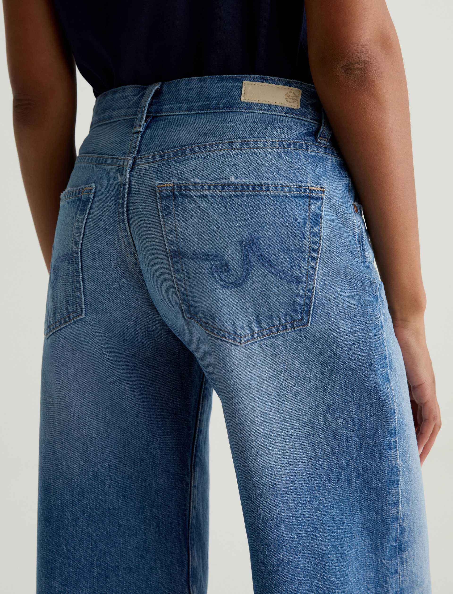 Adria is our new low-rise wide-leg jean that hangs low on the hips for a relaxed, slouchy look. These five-pocket jeans fit loose and wide through the legs, designed to puddle at the hems. Made from 13 oz. Sioux Rigid Denim in 100% cotton, the pair here features a medium indigo wash with fading, subtle whiskering, and