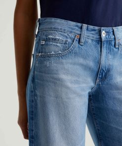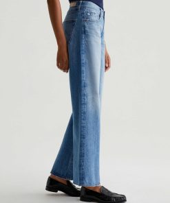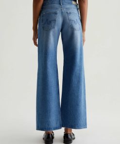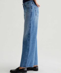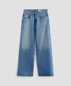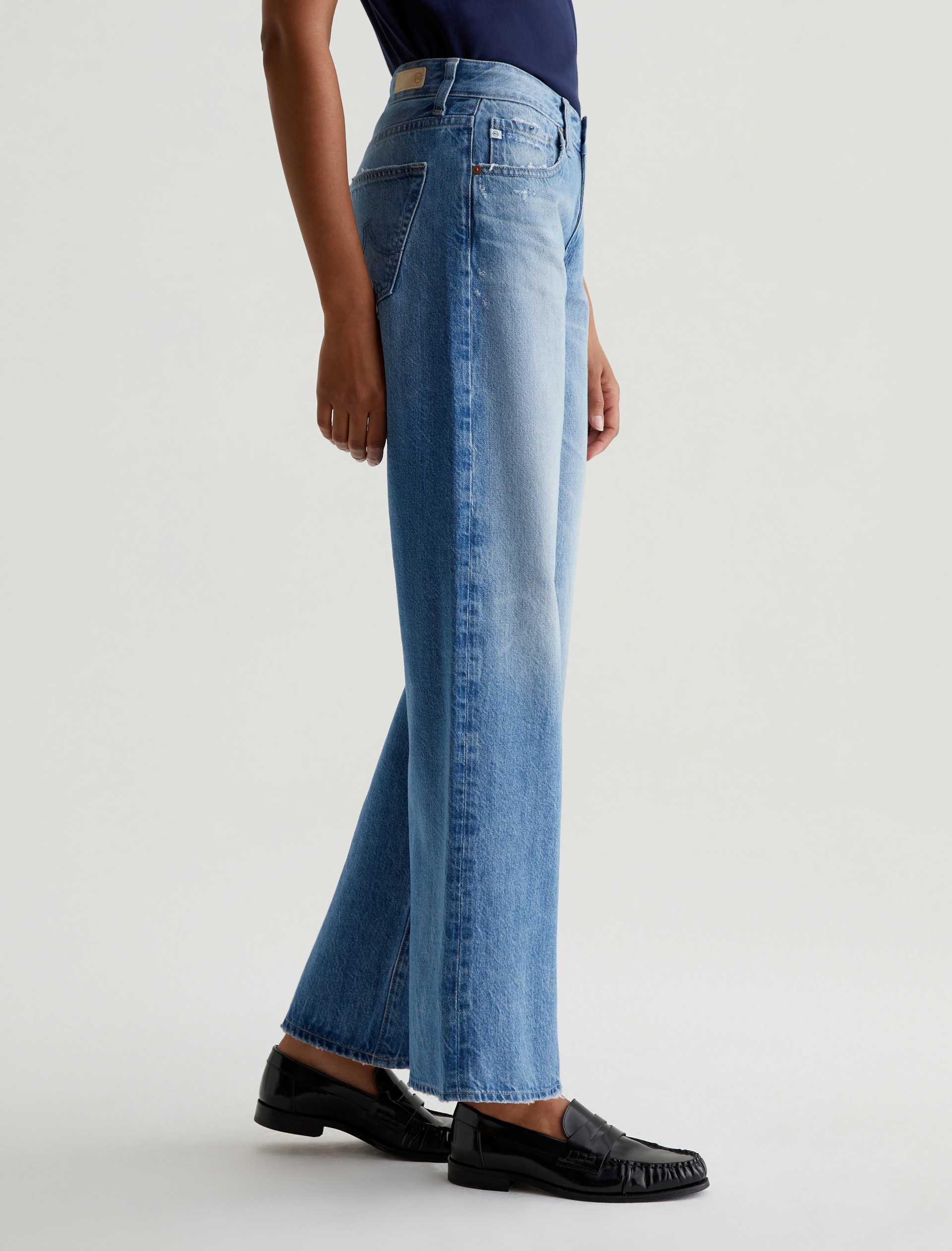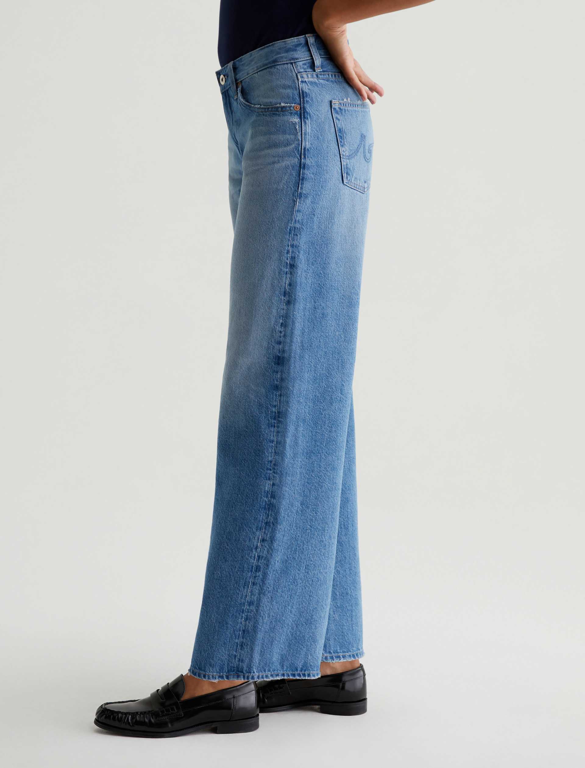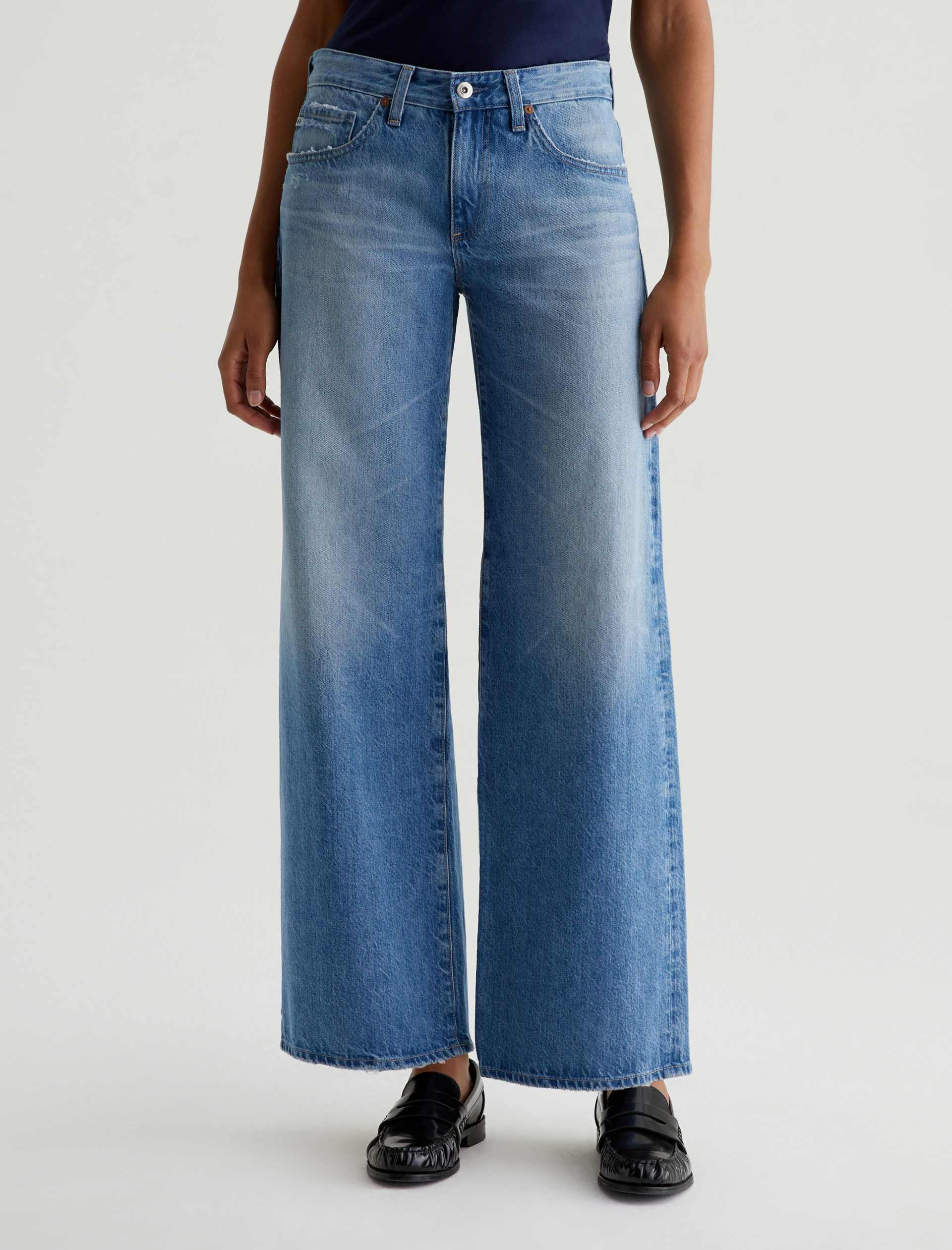 Adria is our new low-rise wide-leg jean that hangs low on the hips for a relaxed, slouchy look. These five-pocket jeans fit loose and wide through the legs, designed to puddle at the hems. Made from 13 oz. Sioux Rigid Denim in 100% cotton, the pair here features a medium indigo wash with fading, subtle whiskering, and