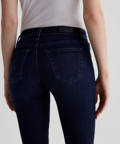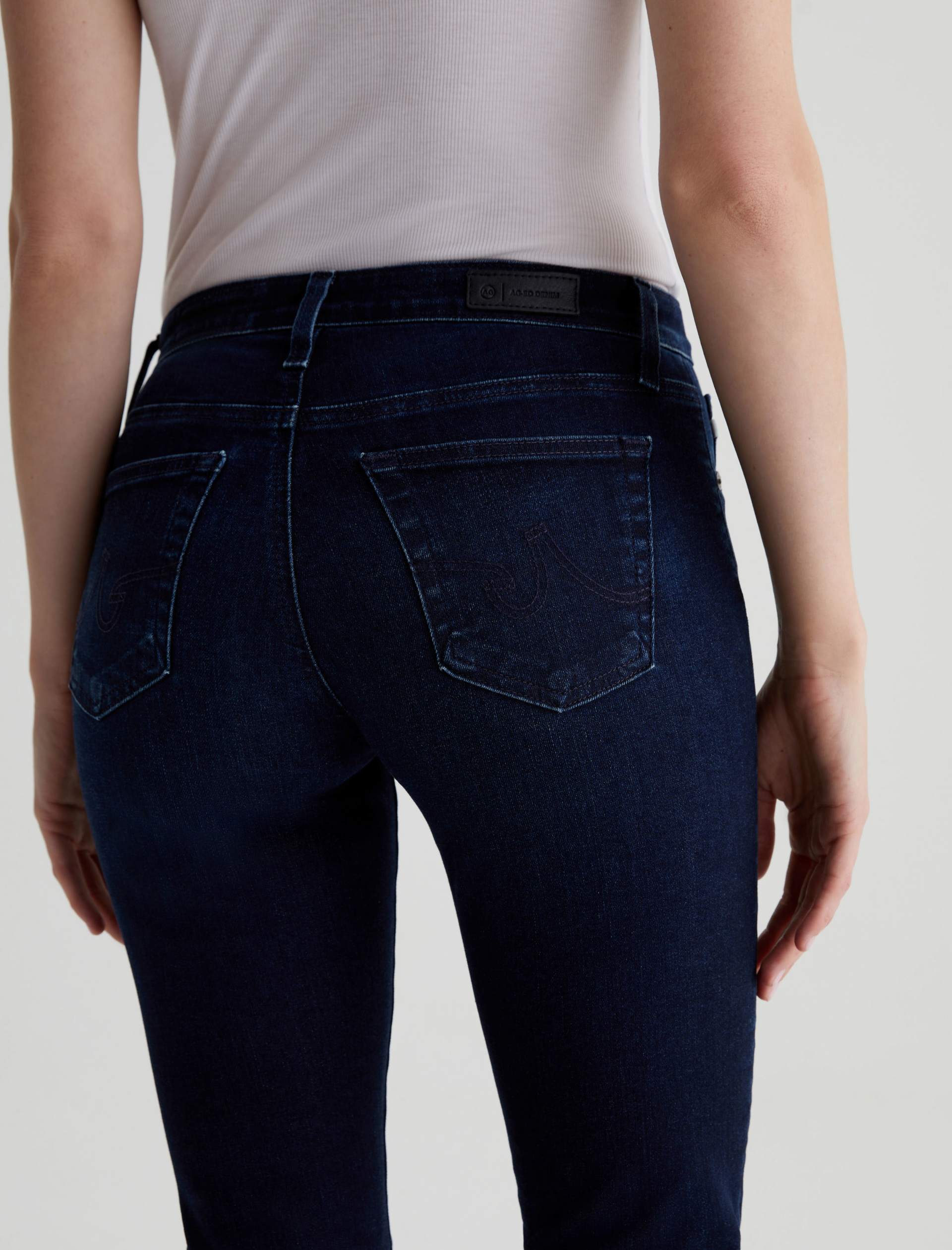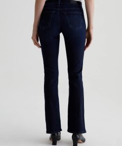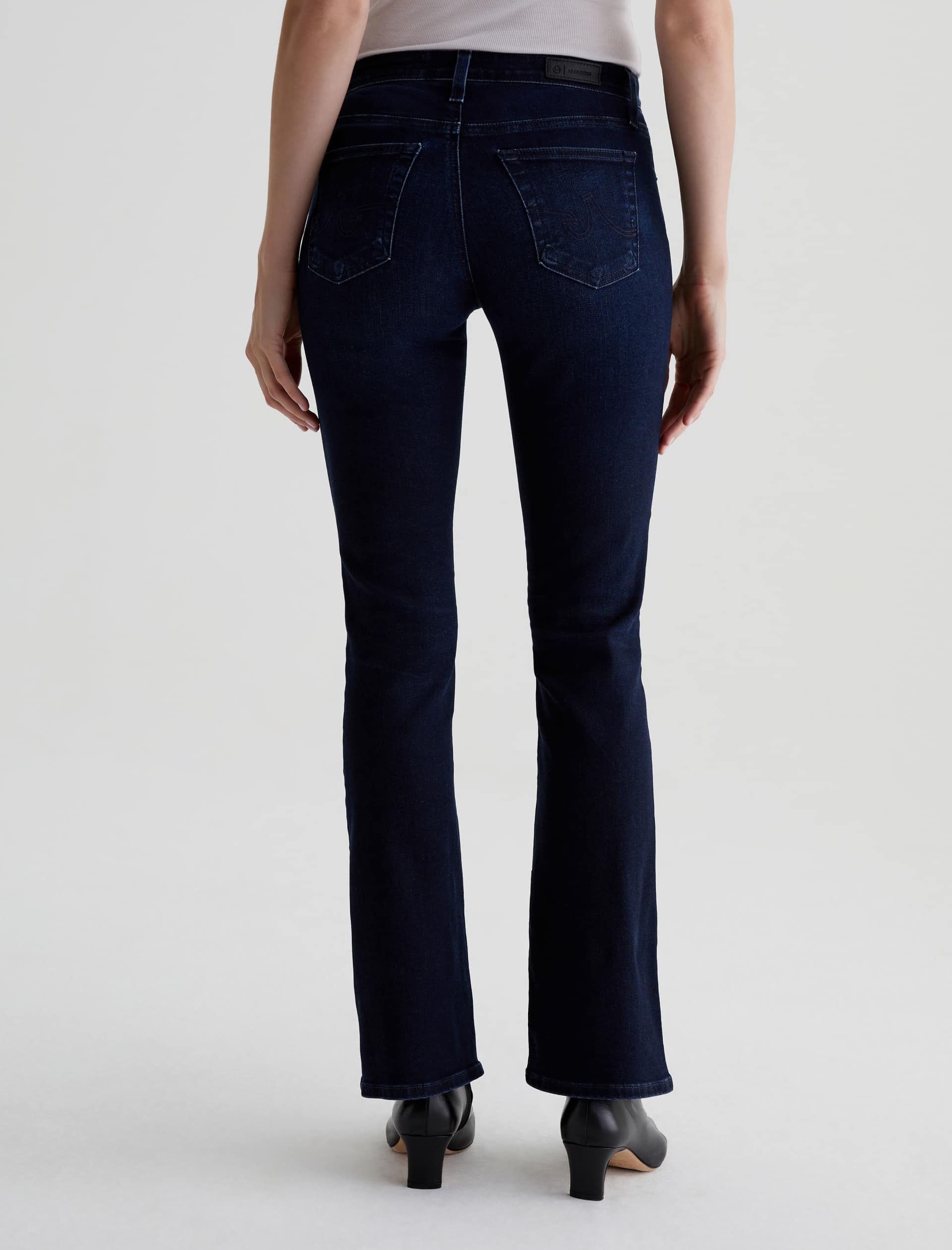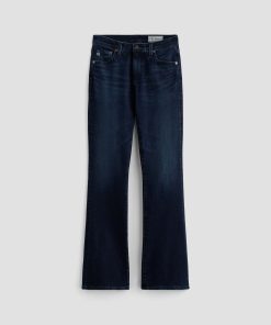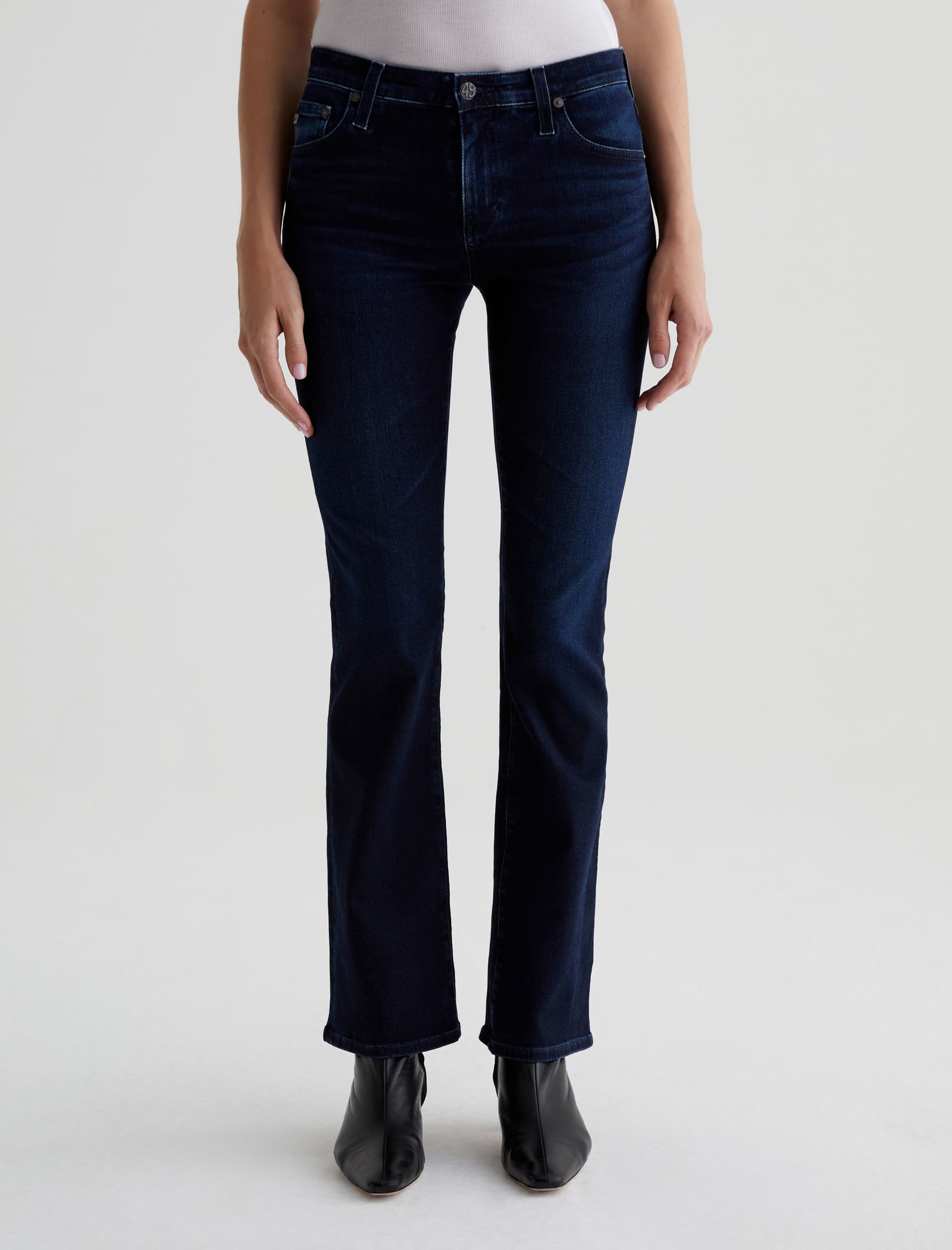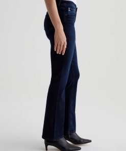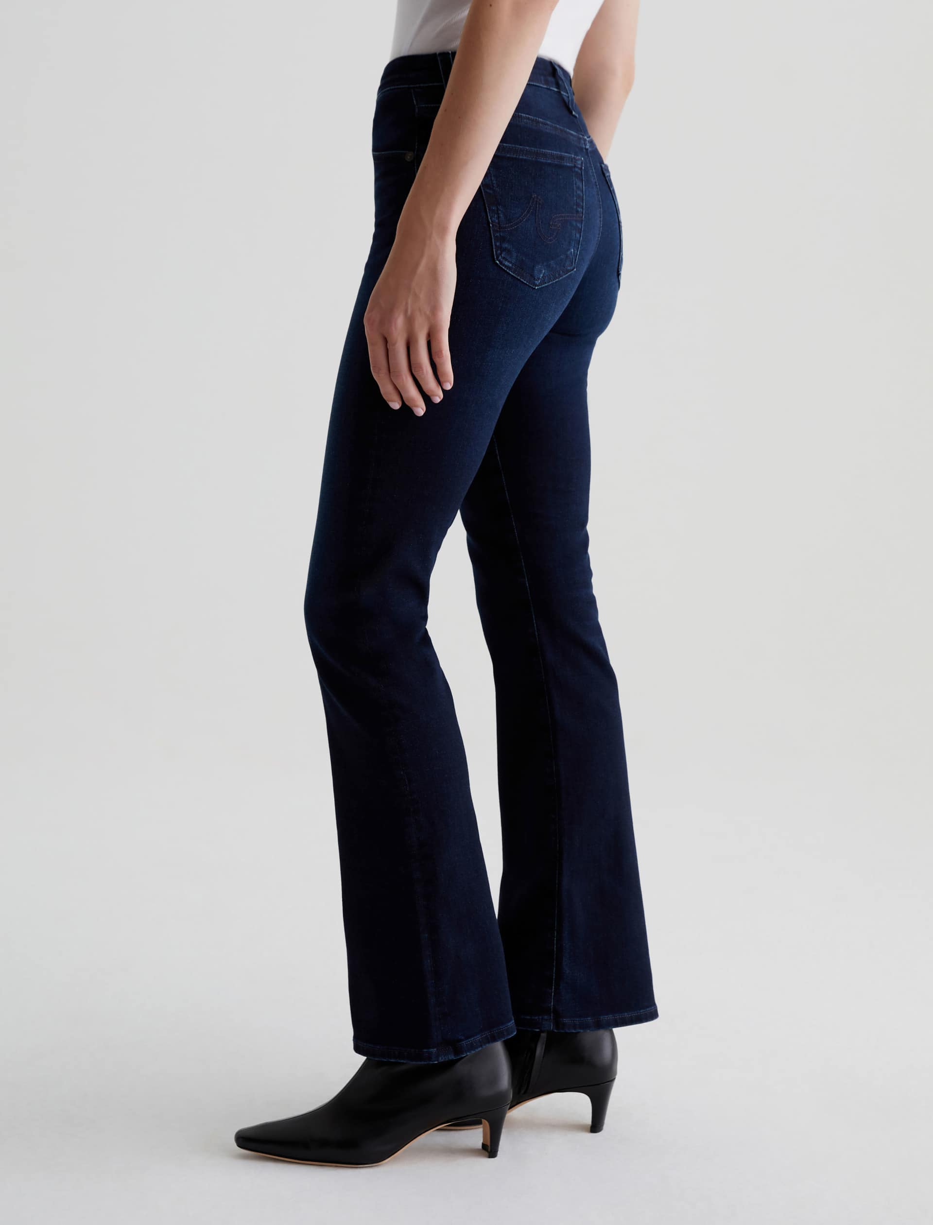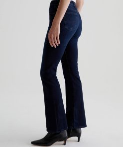 The Angel low-rise bootcut jeans fit close to the body before opening to subtly flared hems. Designed in 10 oz. Empower Denim from Japan, this pair has shape-hugging stretch and premium recovery. It comes in a dark indigo wash featuring a 3-year AG-ed™ fade with subtle fading and whiskering.