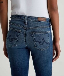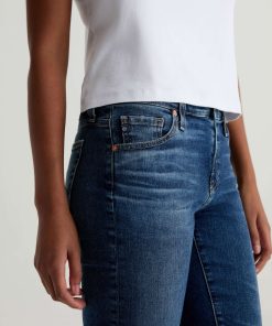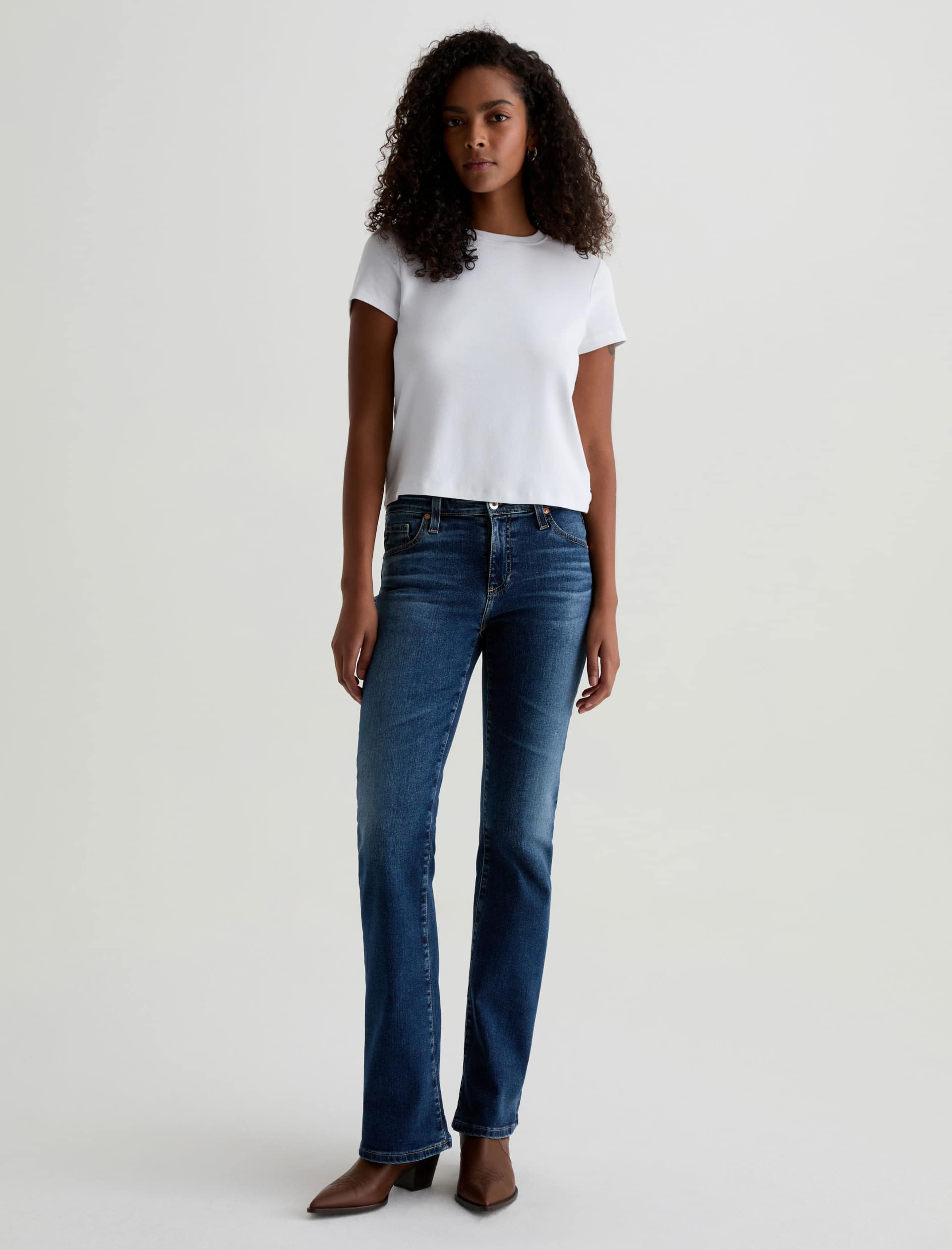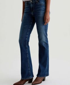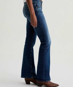 Our Angel low-rise bootcut silhouette features a dark blue wash with fading and whiskering. Cut from 10 oz. Empower Denim, these five-pocket jeans are blended with stretch for a shape-hugging silhouette and premium recovery. Classic marigold topstitching finishes the look.