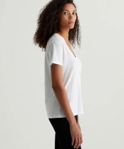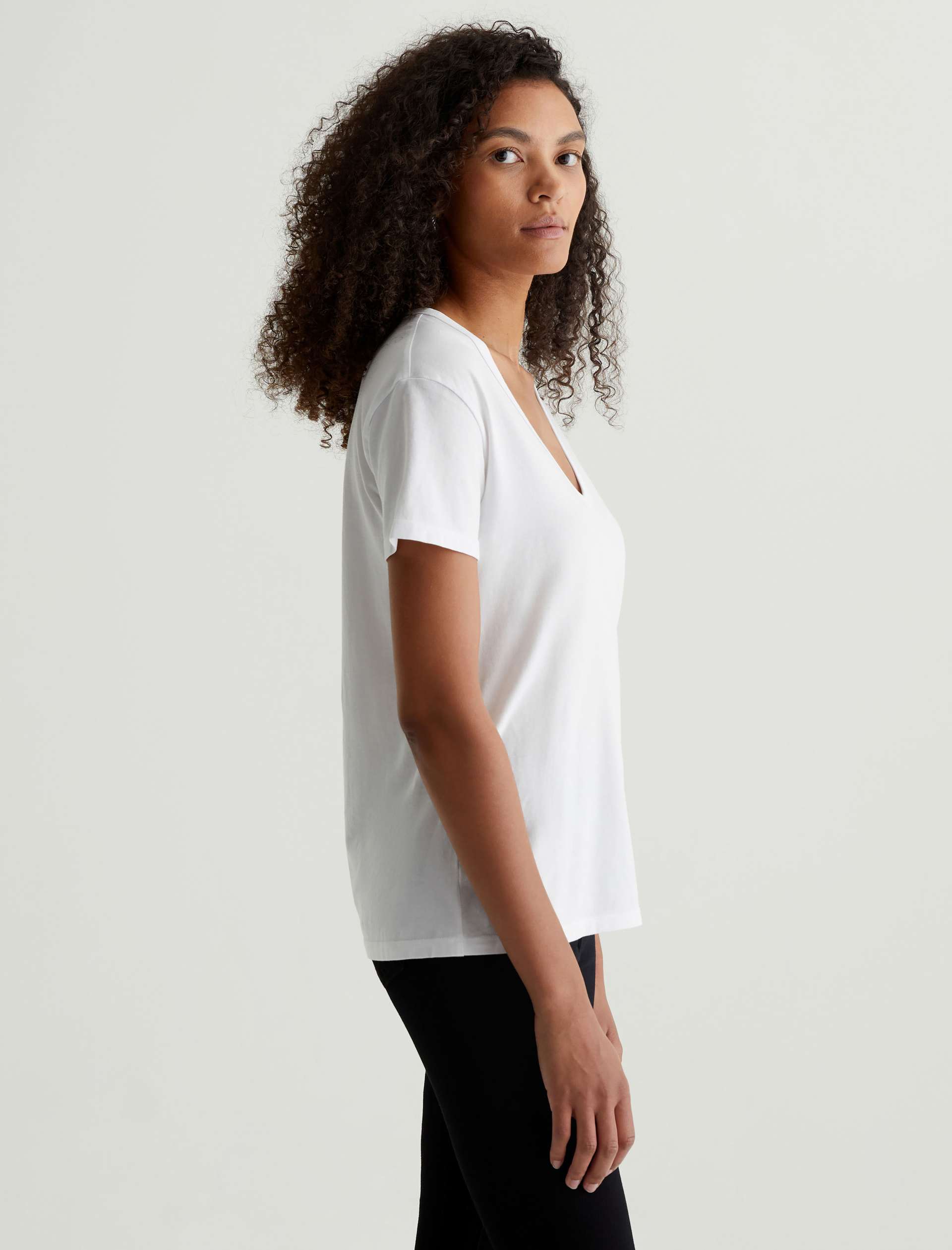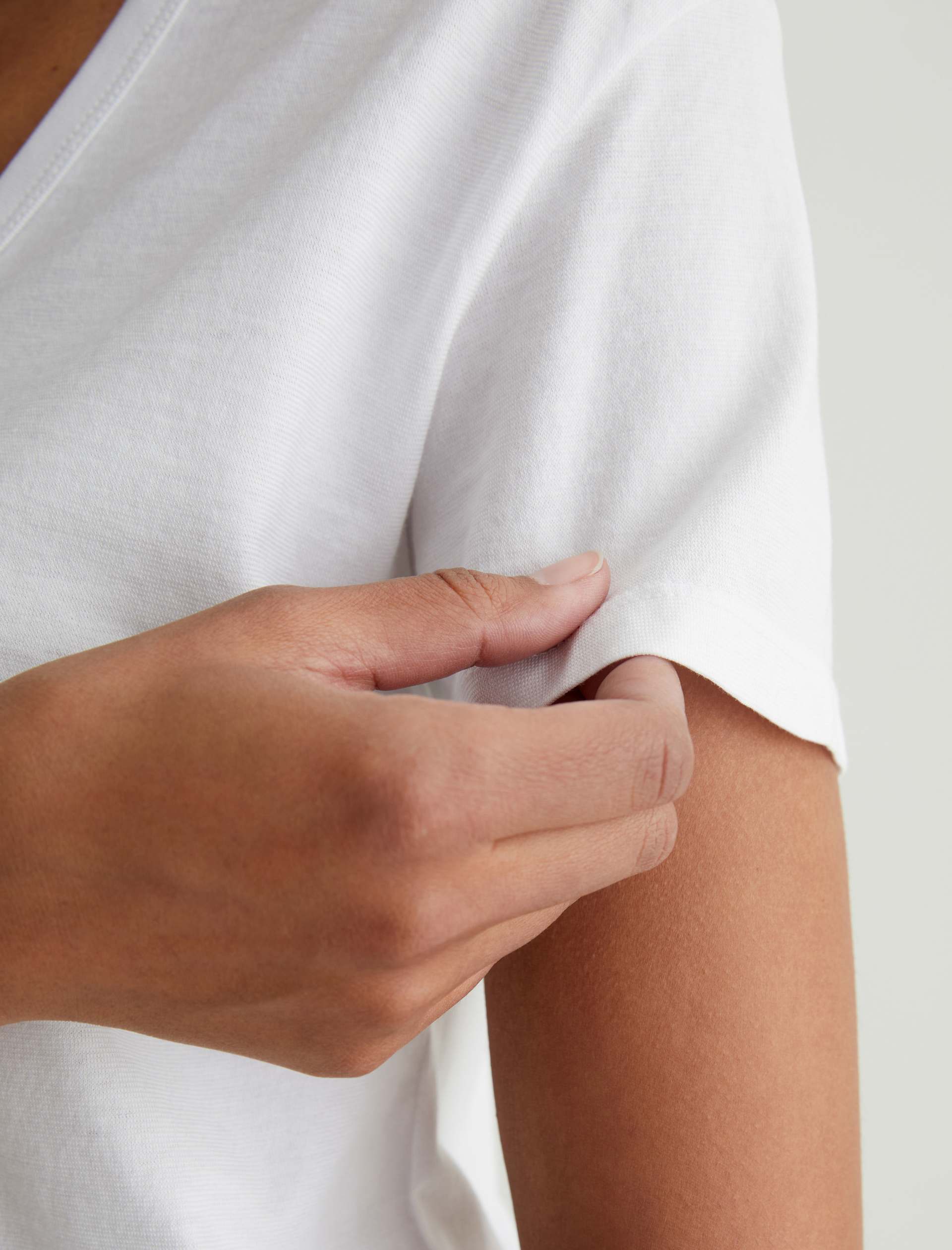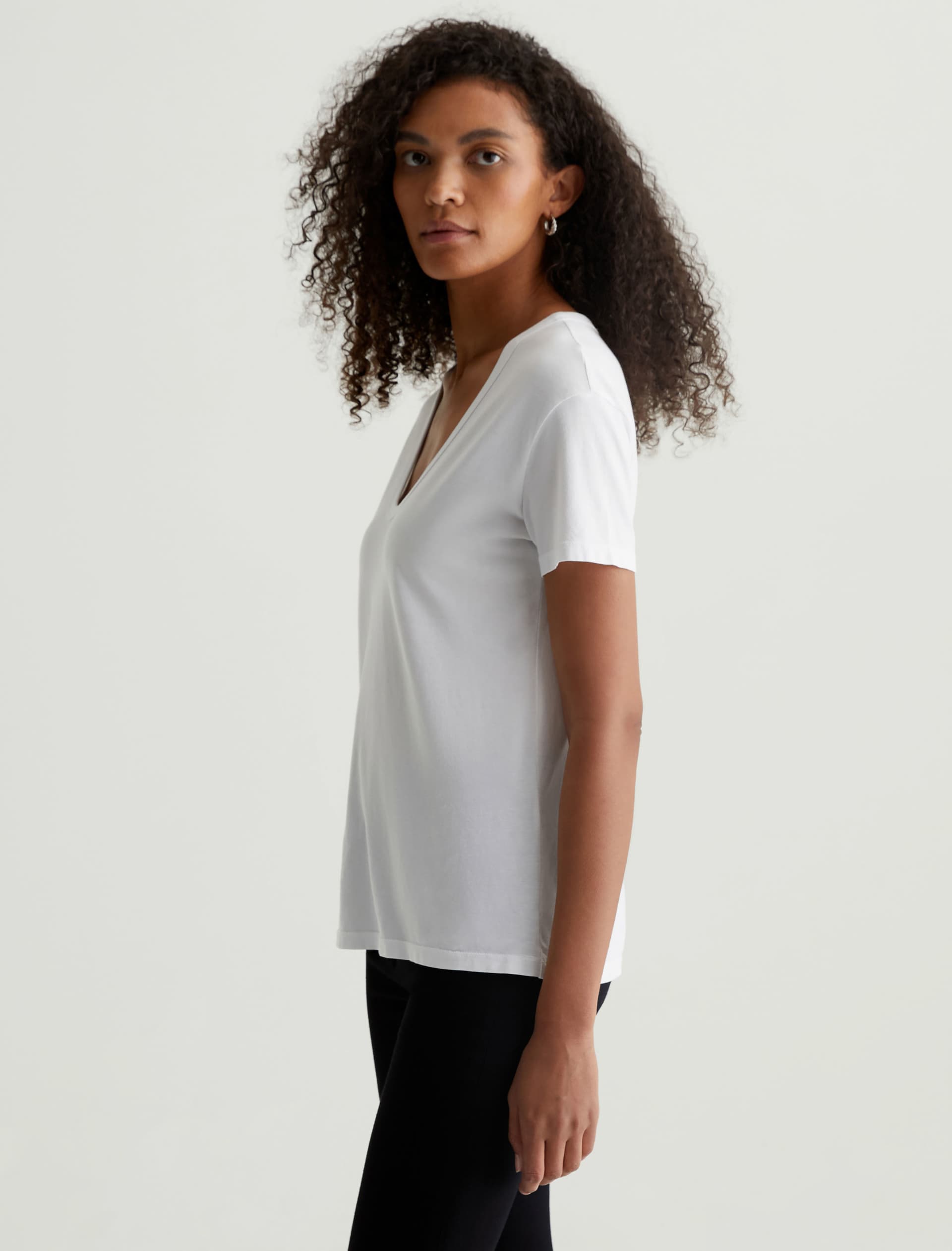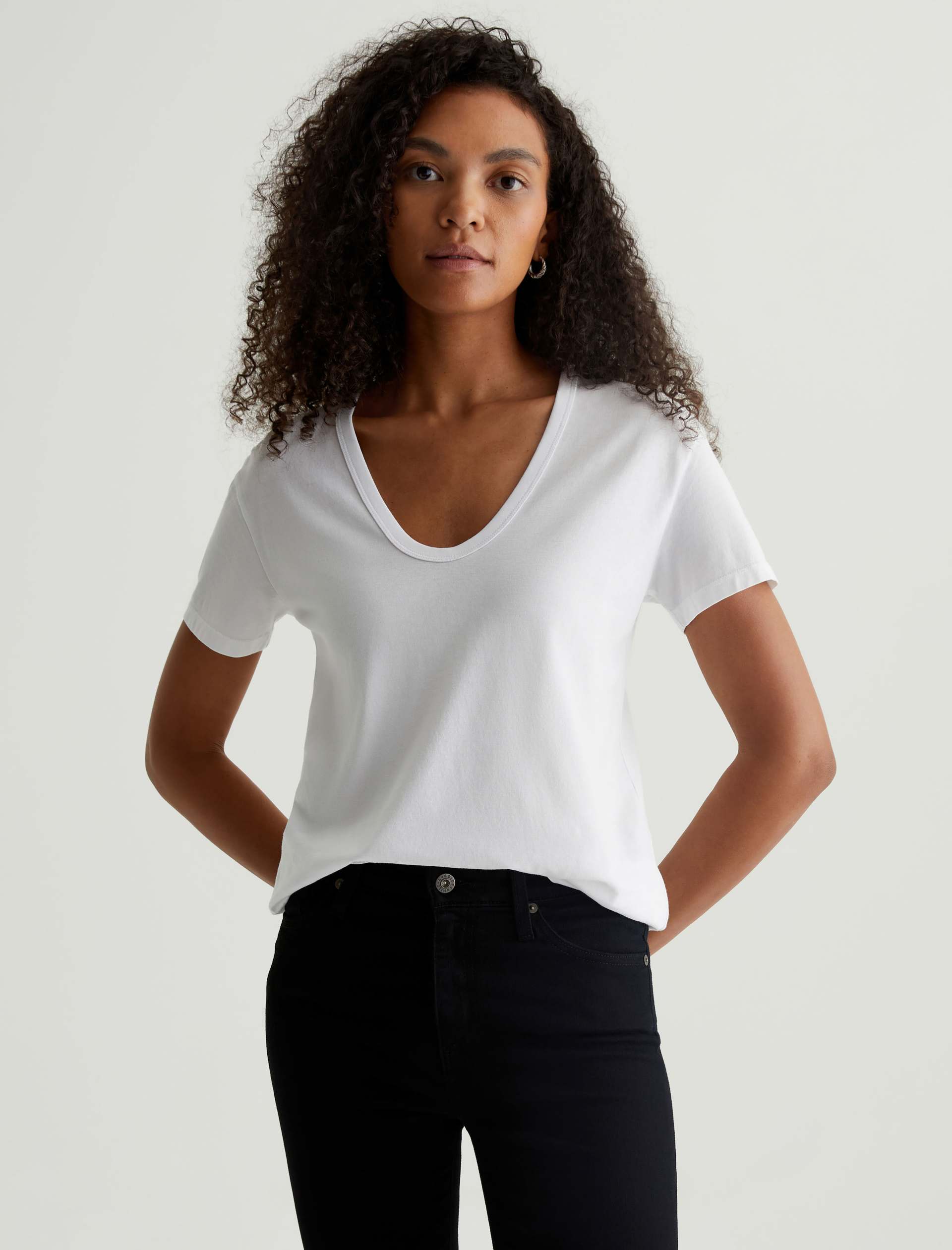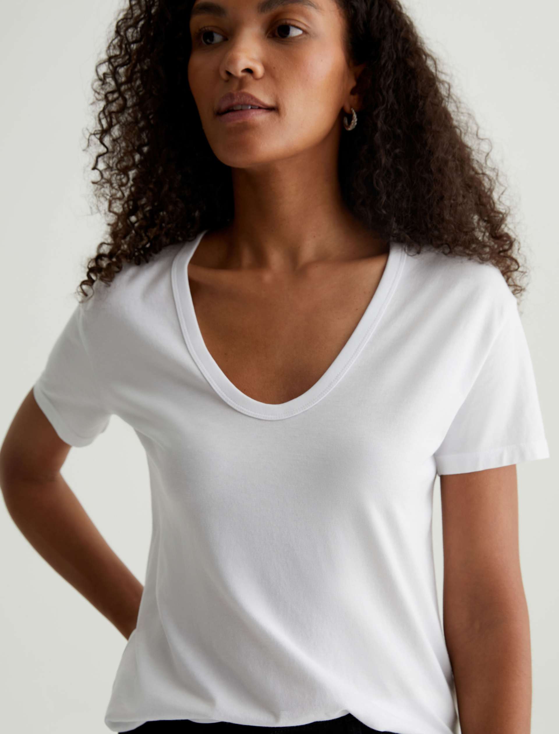 Aspen U-Neck is our classic U-neck tee that has a very easy neckline with a touch of femininity. The white tee offers a relaxed fit with a slightly dropped shoulder. An easy styling piece to dress up or down with a vintage style jean. Our Jersey Knit offers a luxurious comfort that is unrivaled—knitted with both S-twis