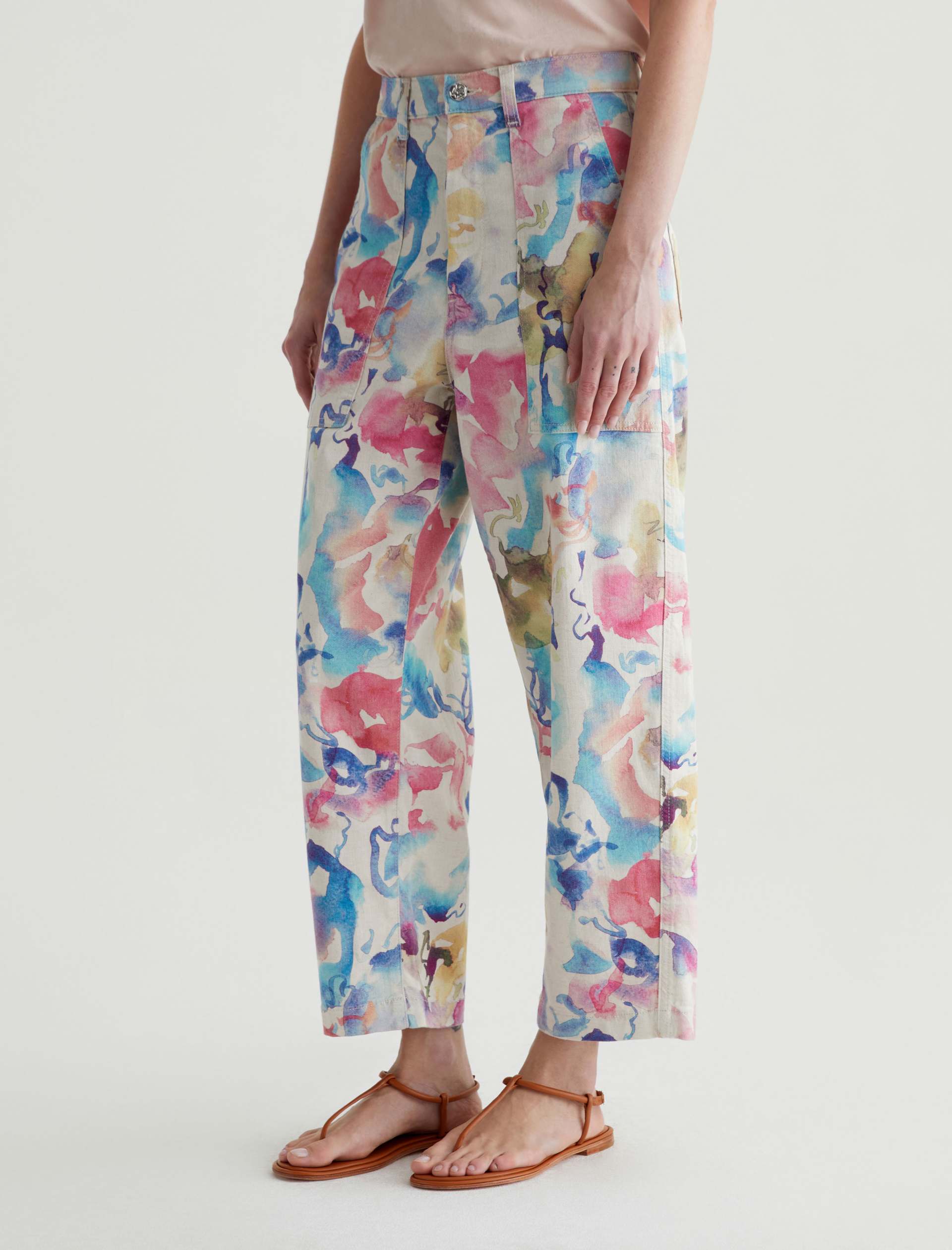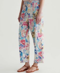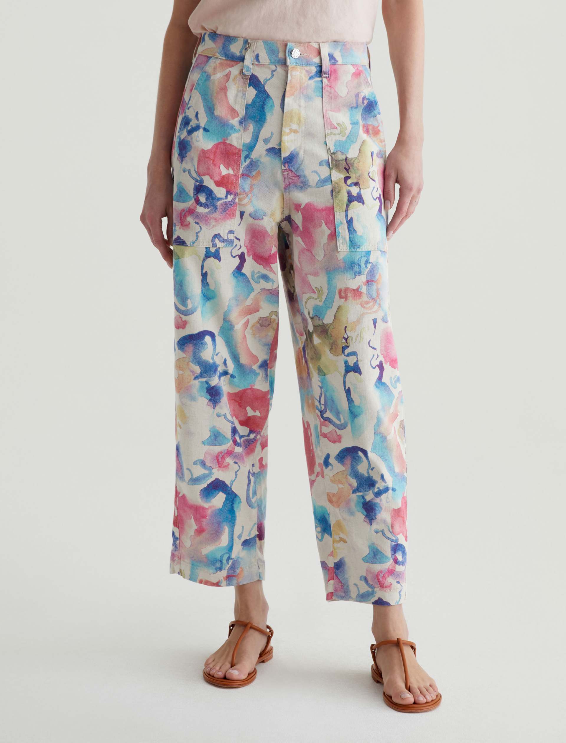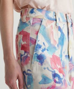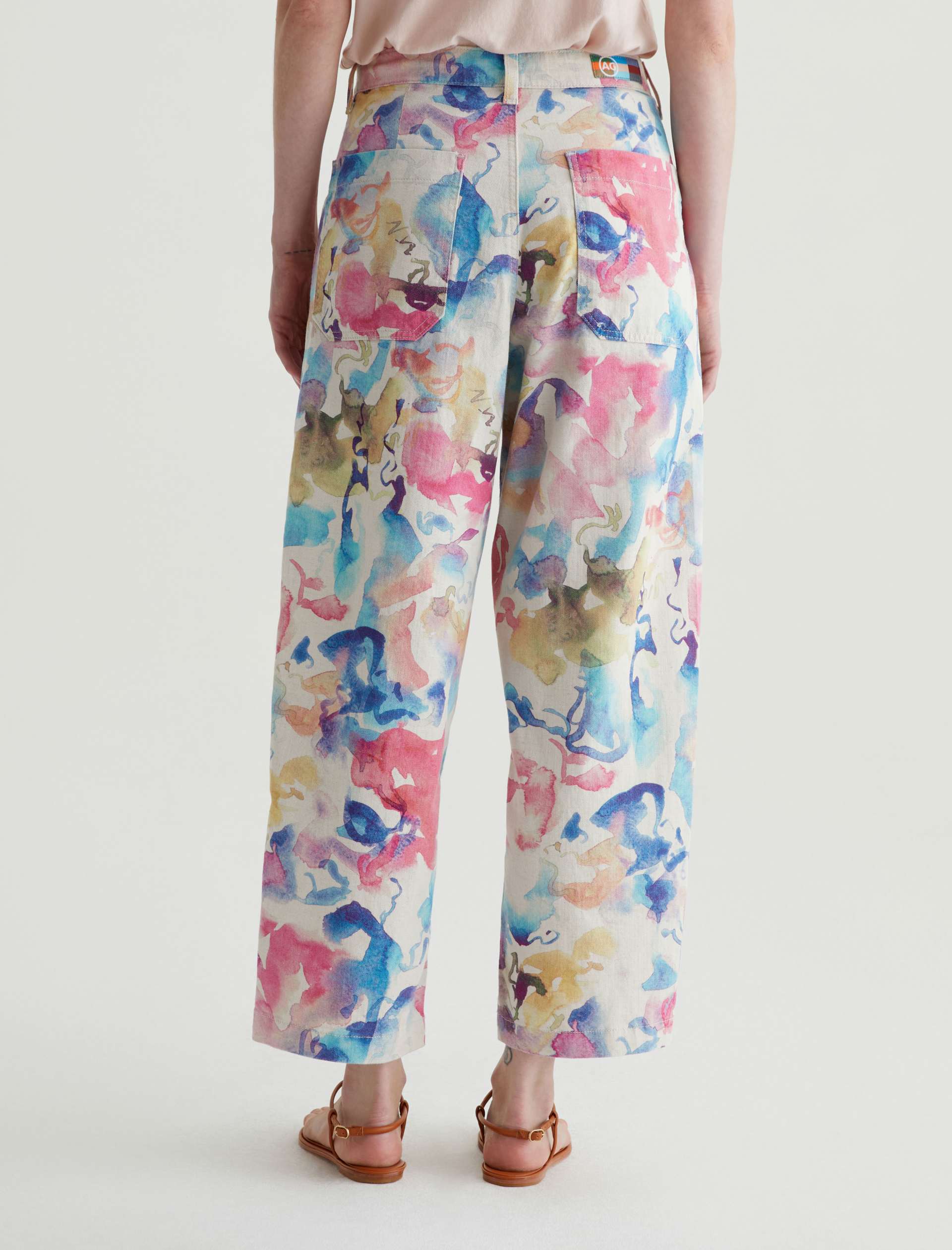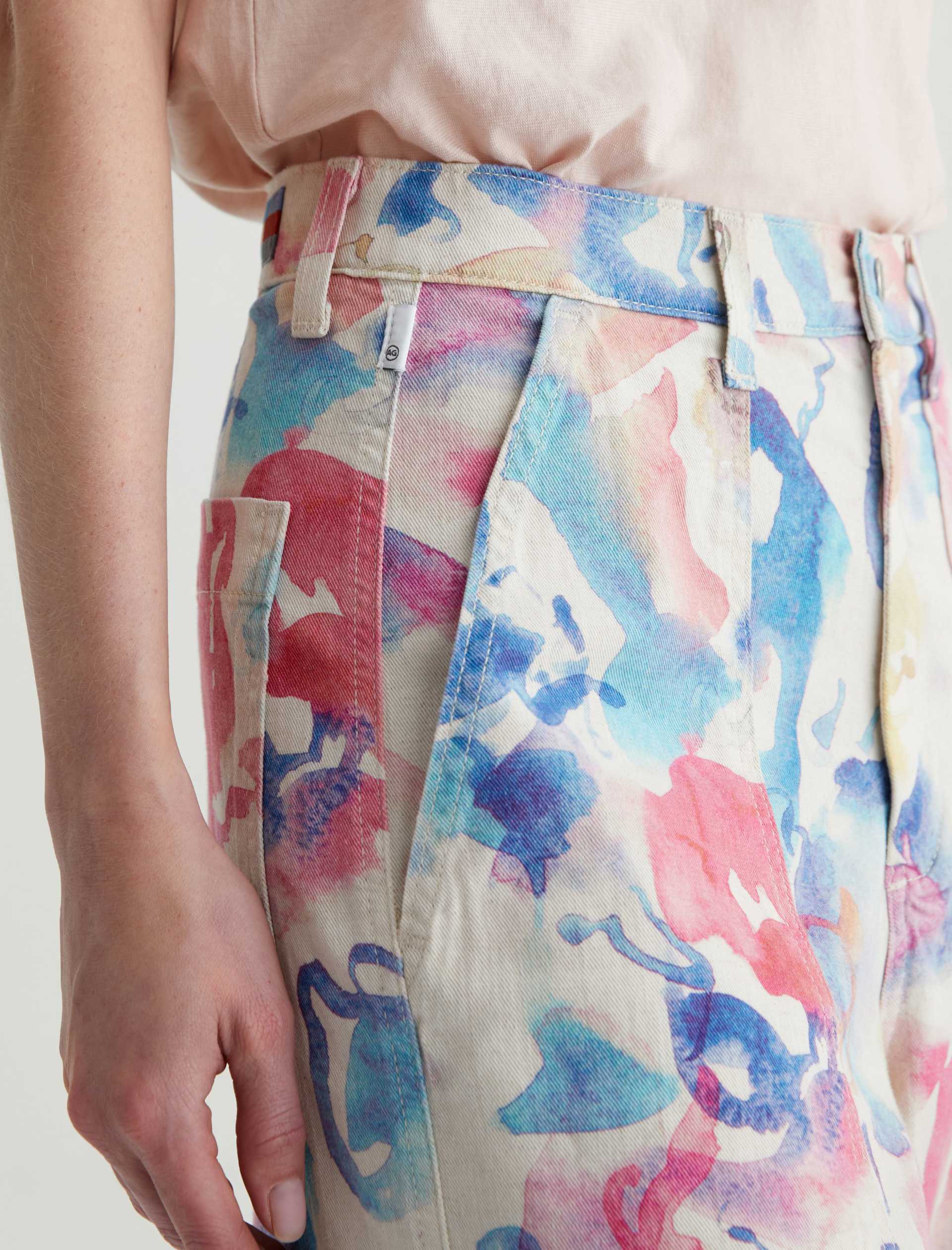 Our Camille utility barrel-leg pants make the perfect canvas for a unique watercolor print. Cut from a comfortable stretch-linen blend, this style has an ultra-high waist, workwear-inspired front pockets, and a loose, cropped fit through the legs. Roomy back pockets finish the look. About the Art Project print: Waterco