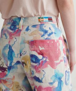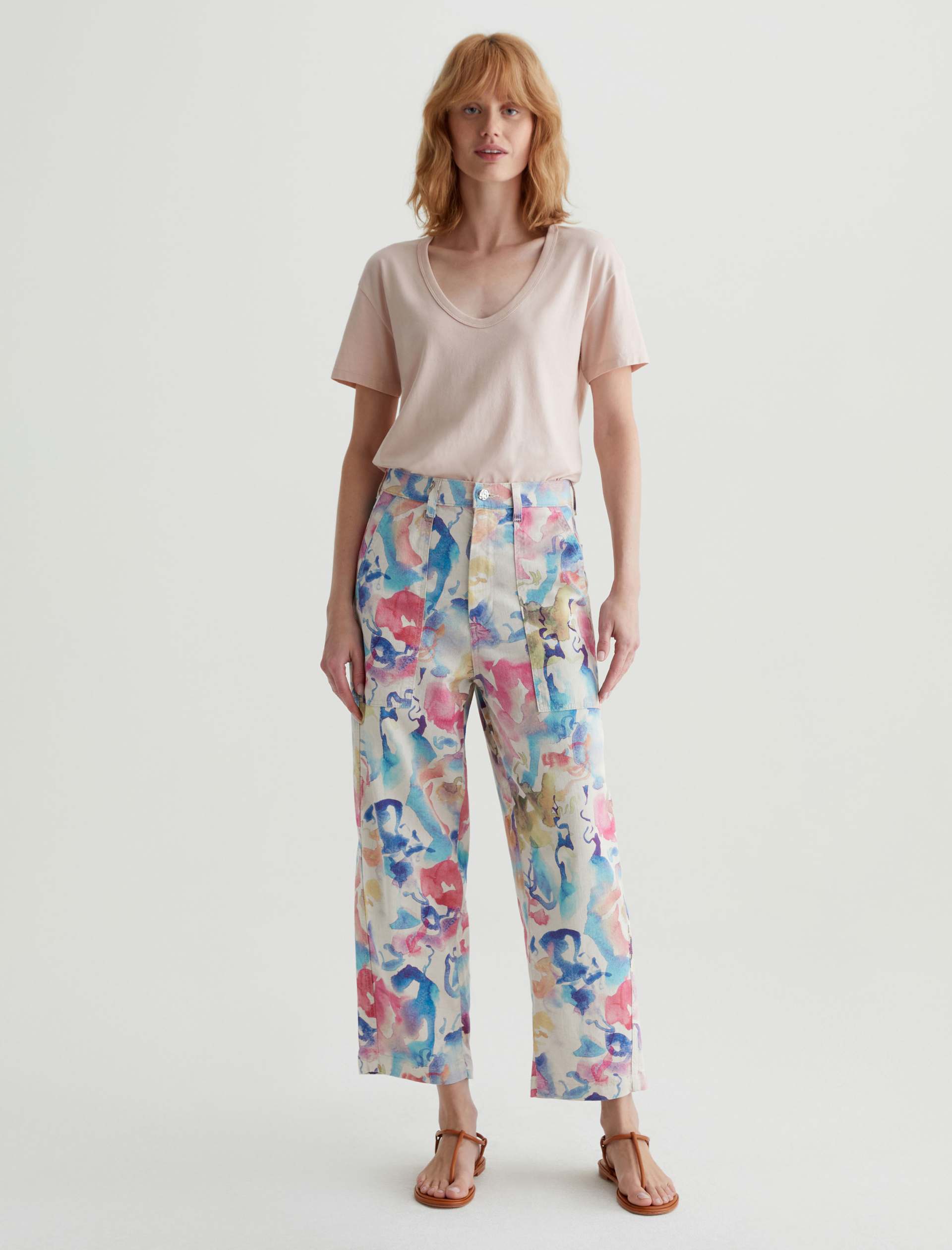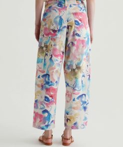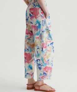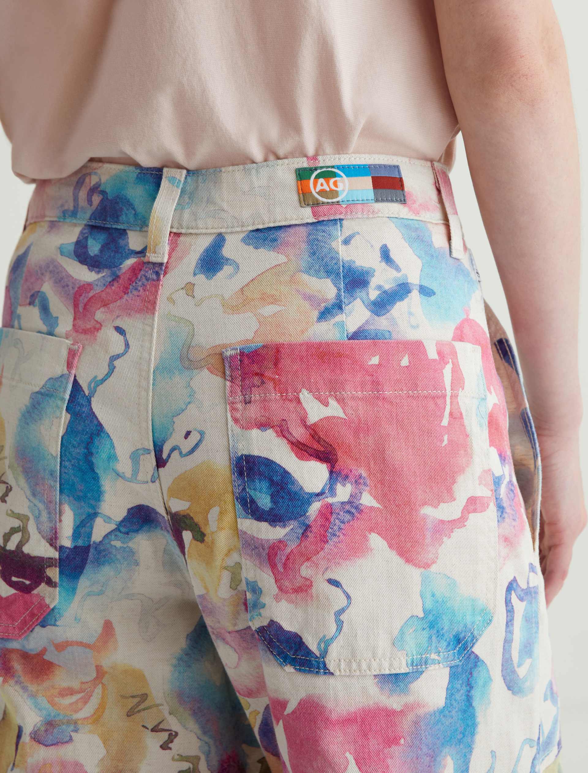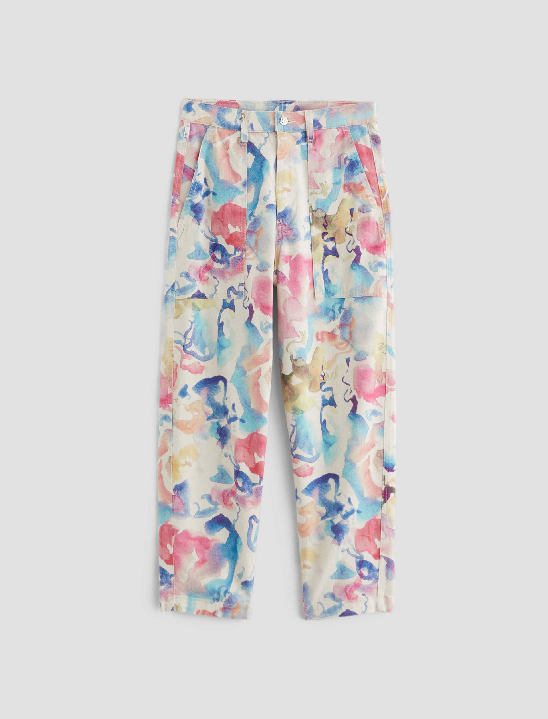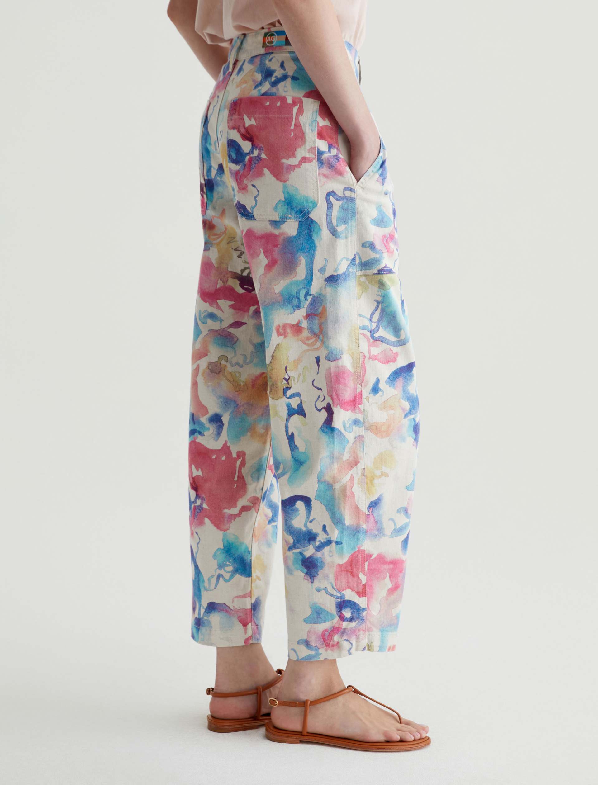 Our Camille utility barrel-leg pants make the perfect canvas for a unique watercolor print. Cut from a comfortable stretch-linen blend, this style has an ultra-high waist, workwear-inspired front pockets, and a loose, cropped fit through the legs. Roomy back pockets finish the look. About the Art Project print: Waterco