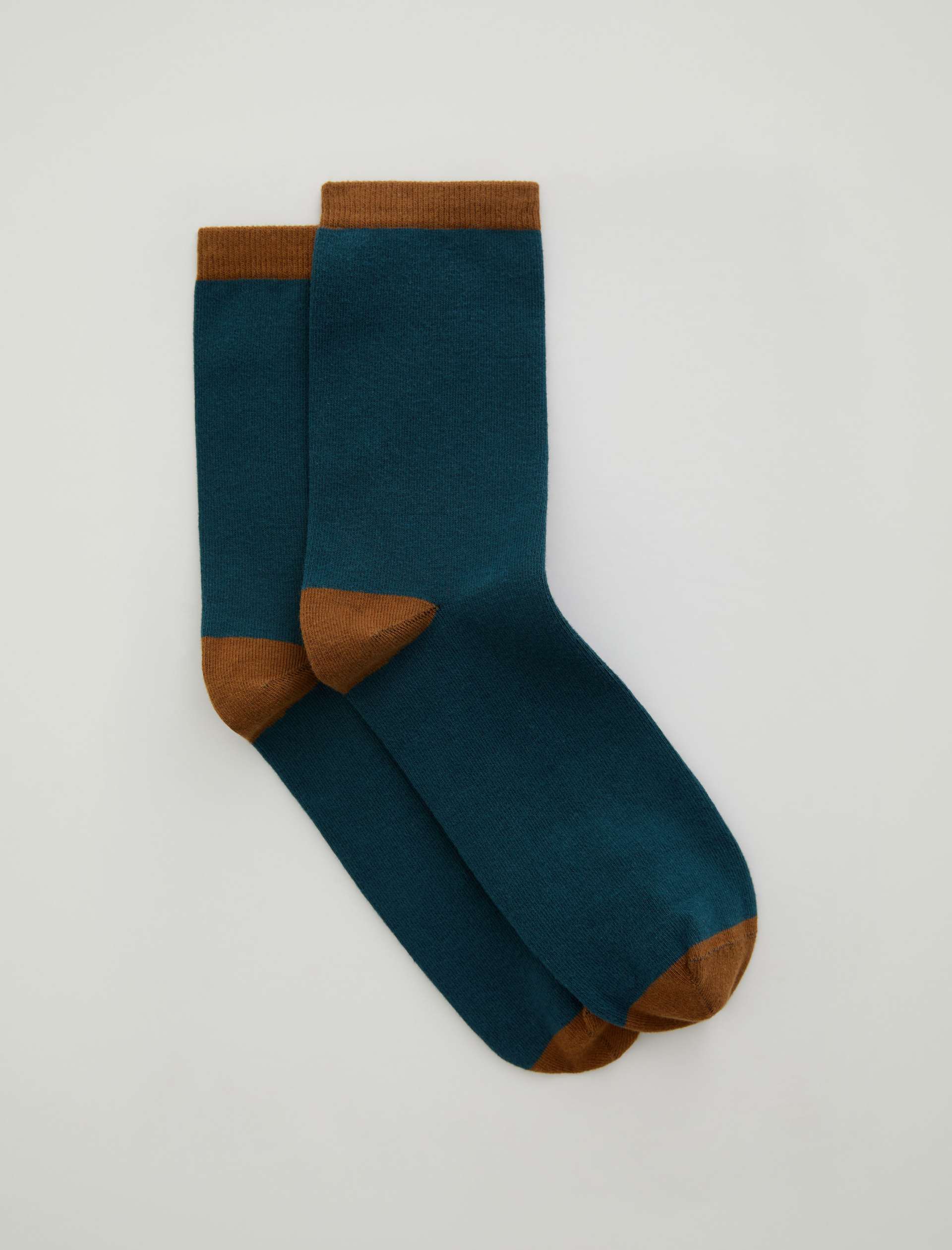 This sock is our classic crew sock. Featuring a gold and green color block, this pair has been knitted from a comfortable cotton blend and ribbed through the ankles.