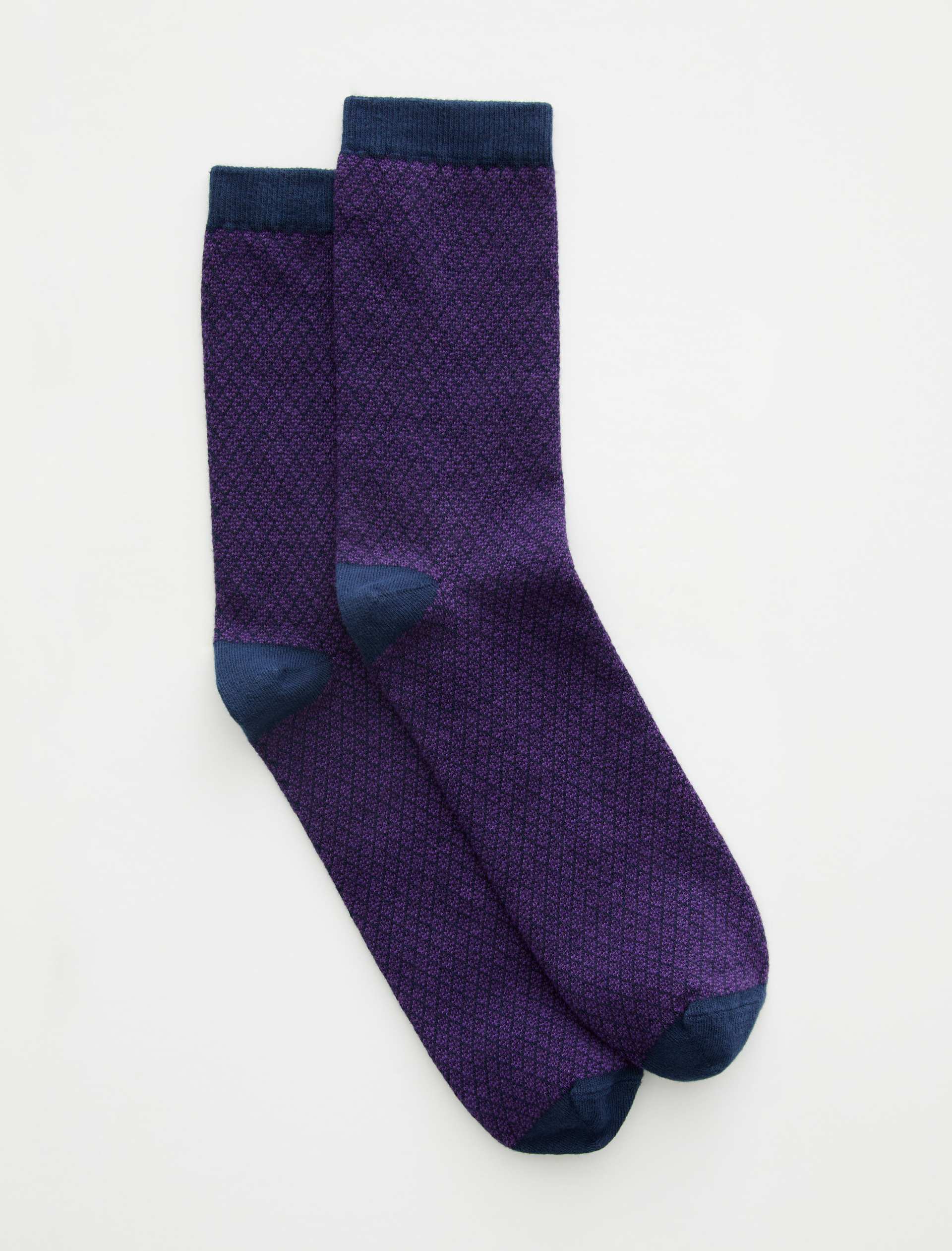 This sock is our classic crew sock. Featuring a diamond pattern, this pair has been knitted from a comfortable cotton blend and ribbed through the ankles.