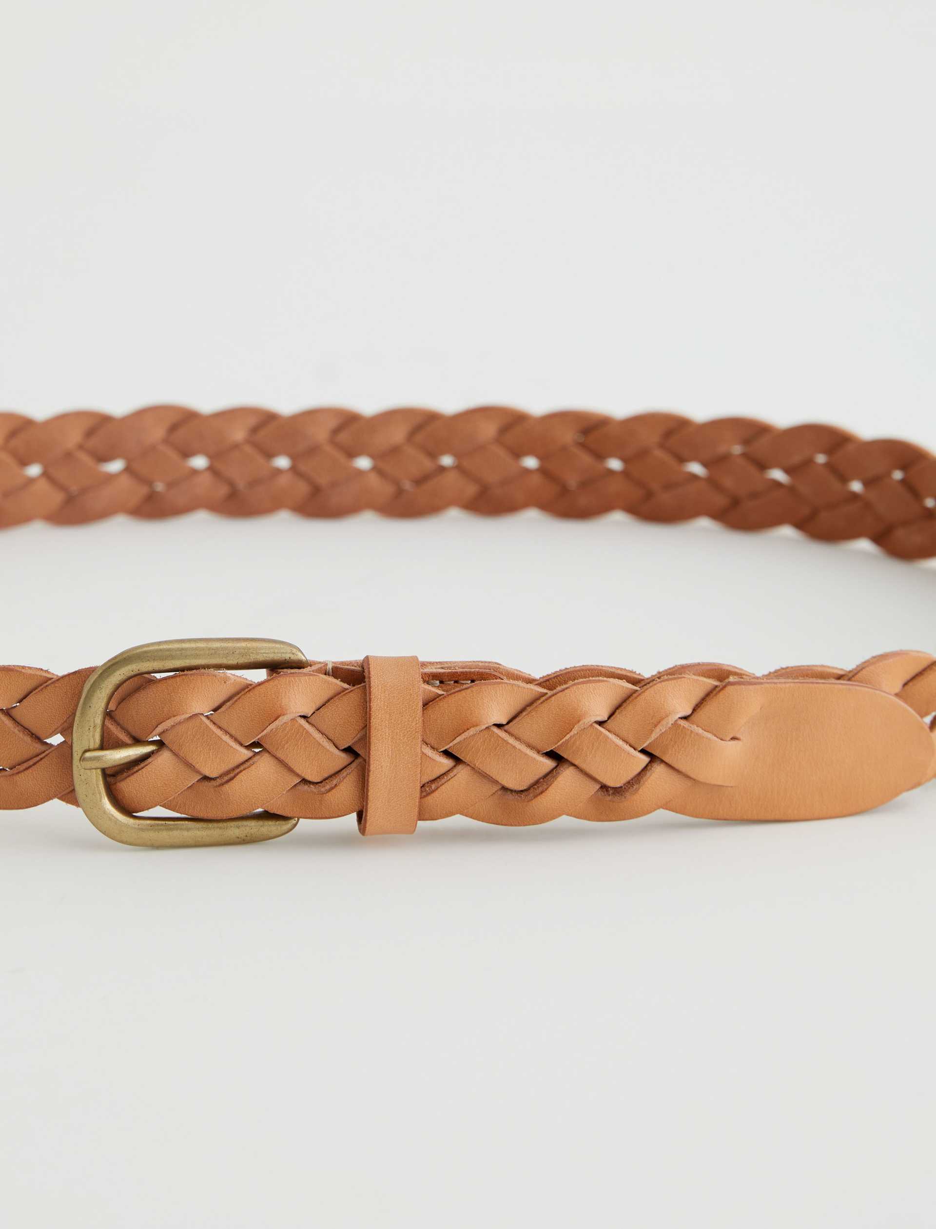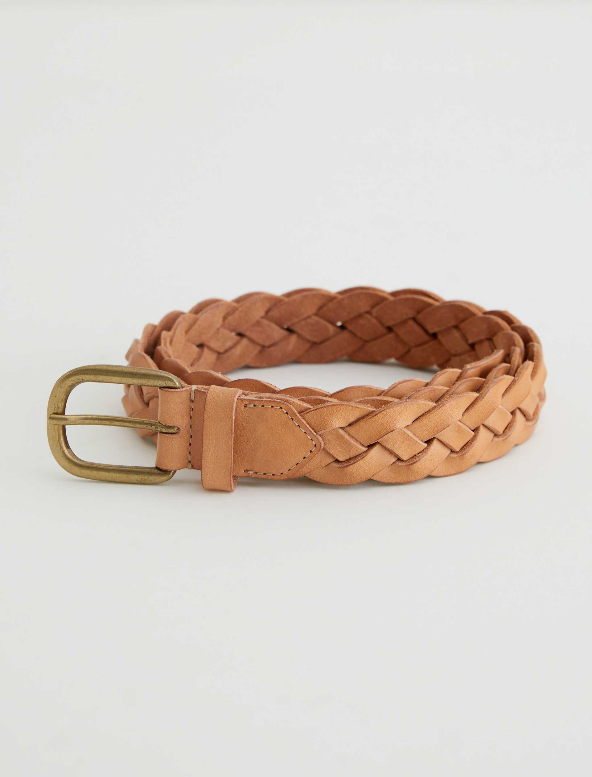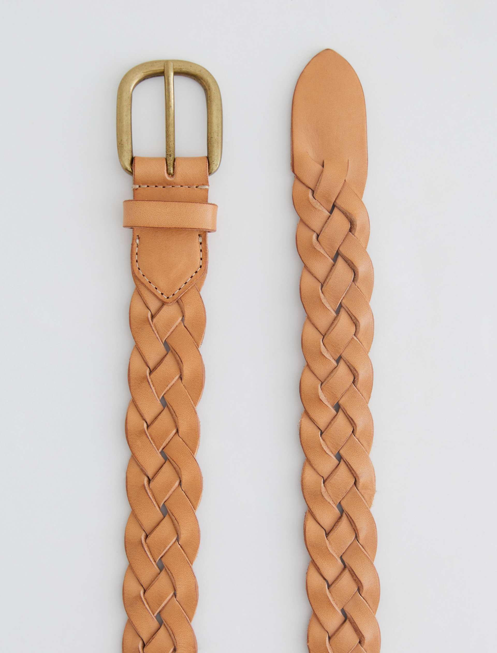 Made from smooth Italian leather, this braided men’s belt comes in a natural tan shade. It’s finished by a brass buckle with a rounded shape.