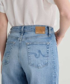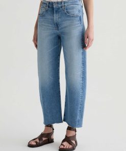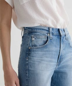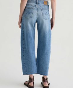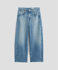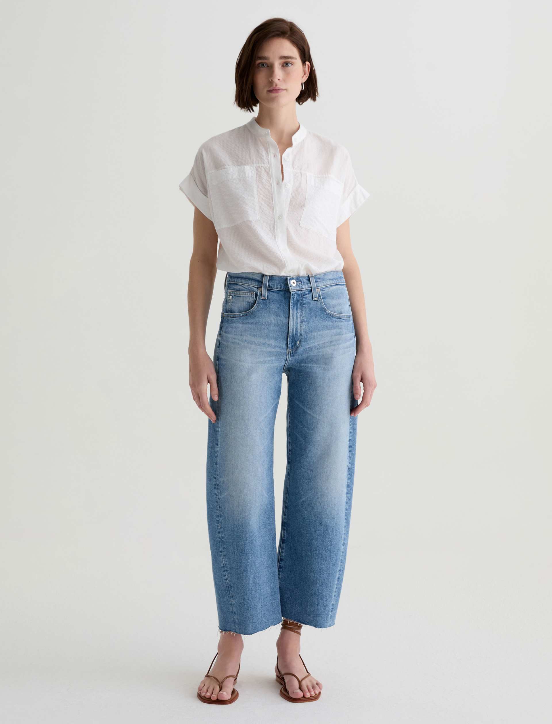 Our Hattie Crop in Helios is a high-rise barrel jean crafted from vintage comfort stretch denim. Finished in a light wash with raw hems, it blends a structured silhouette with a worn-in, laid-back feel.