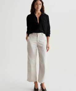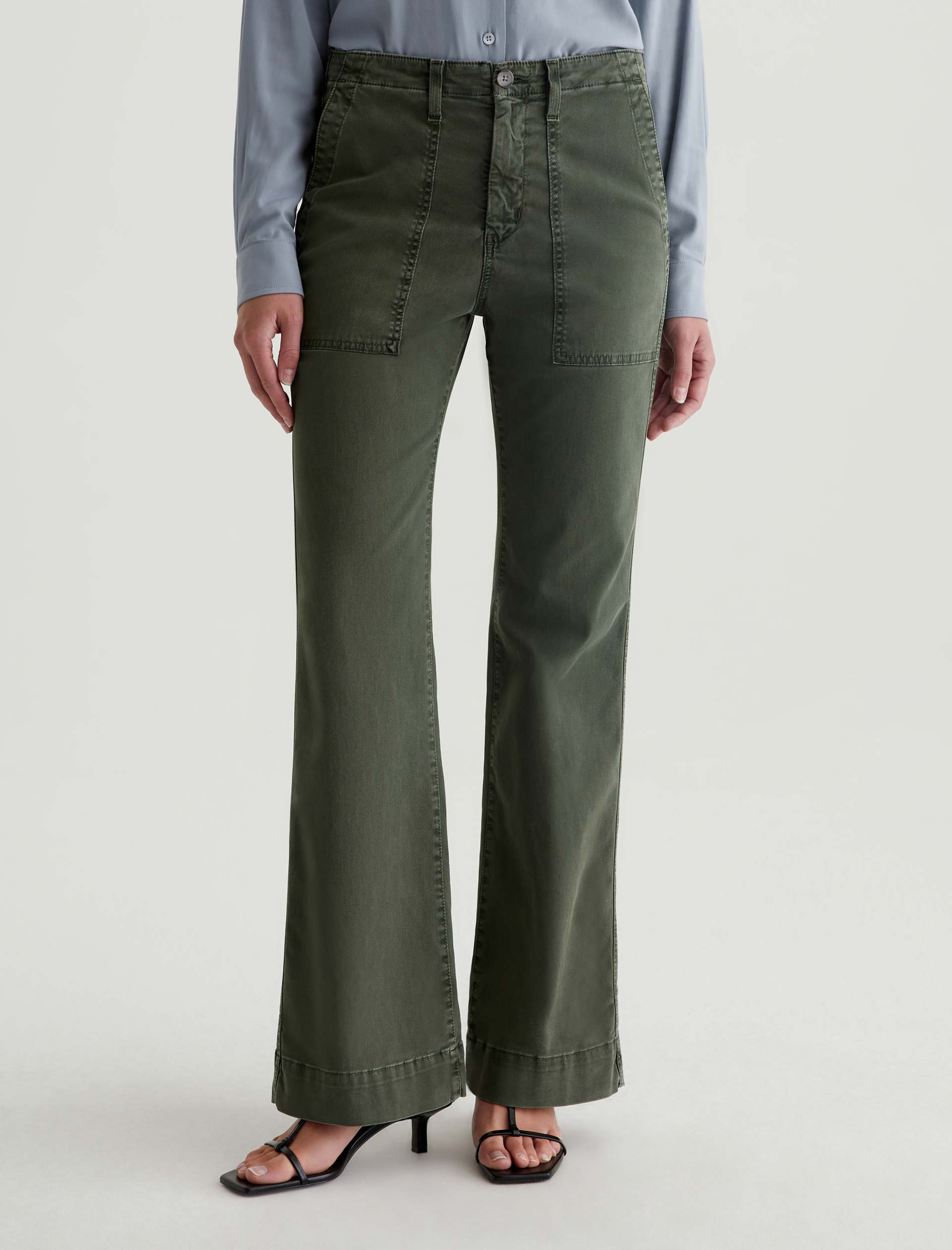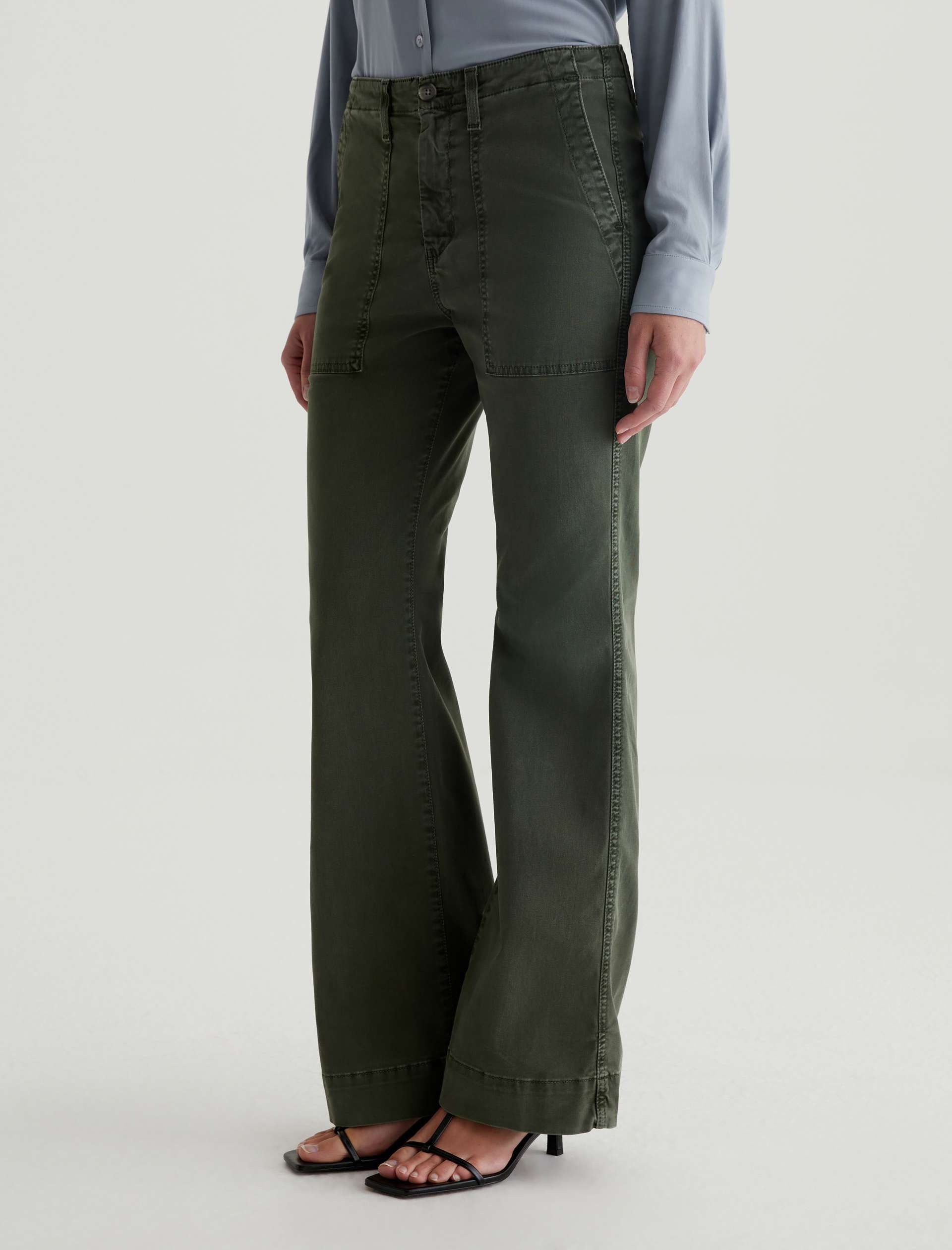 Juliet is a high-rise flare with utility-inspired pockets. Sulfur-dyed for a dark green shade, these flared pants have a soft, refined feel in 7.9 oz. Sorrento Stretch Twill from Italy.