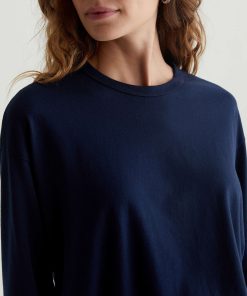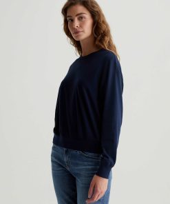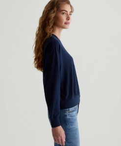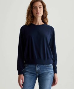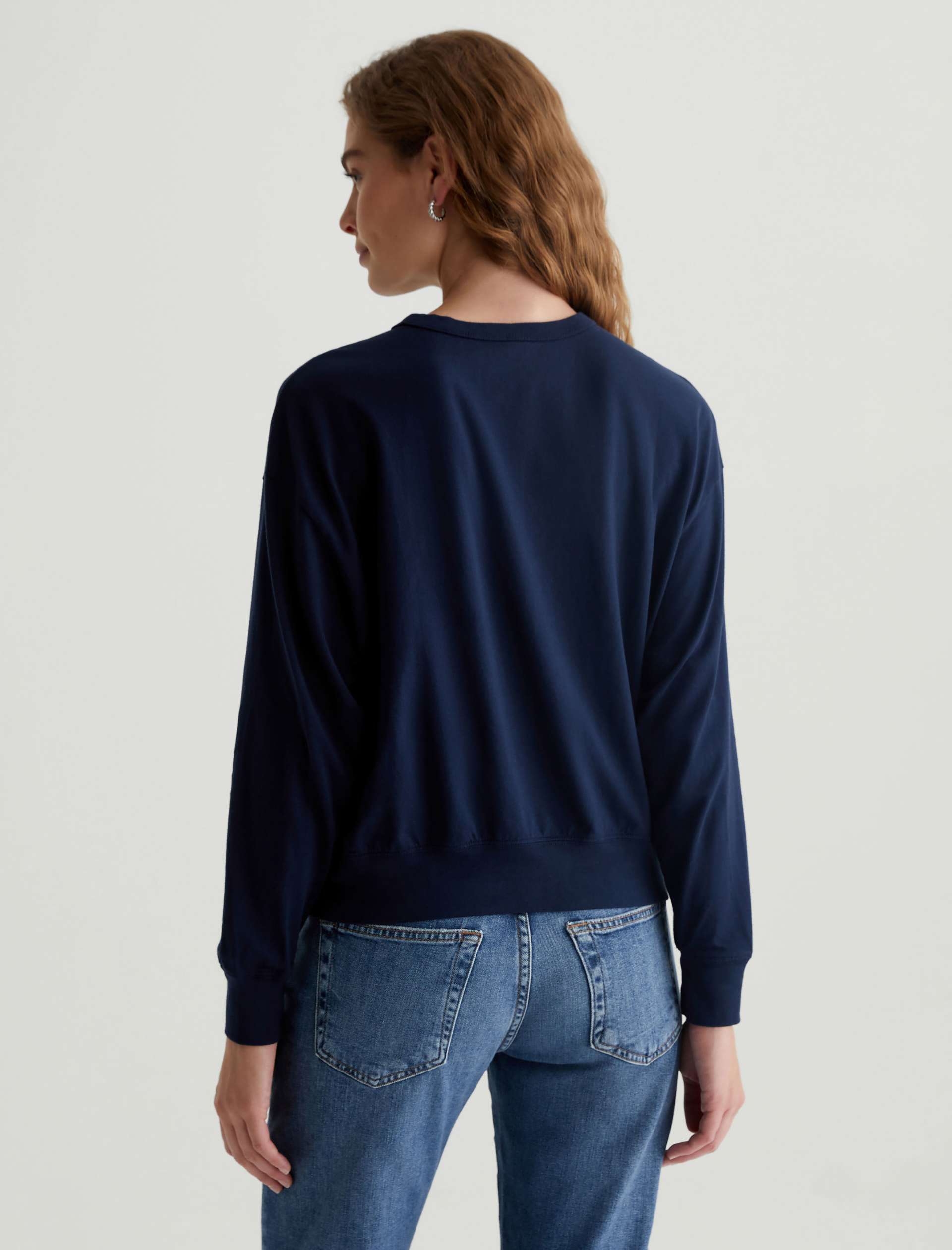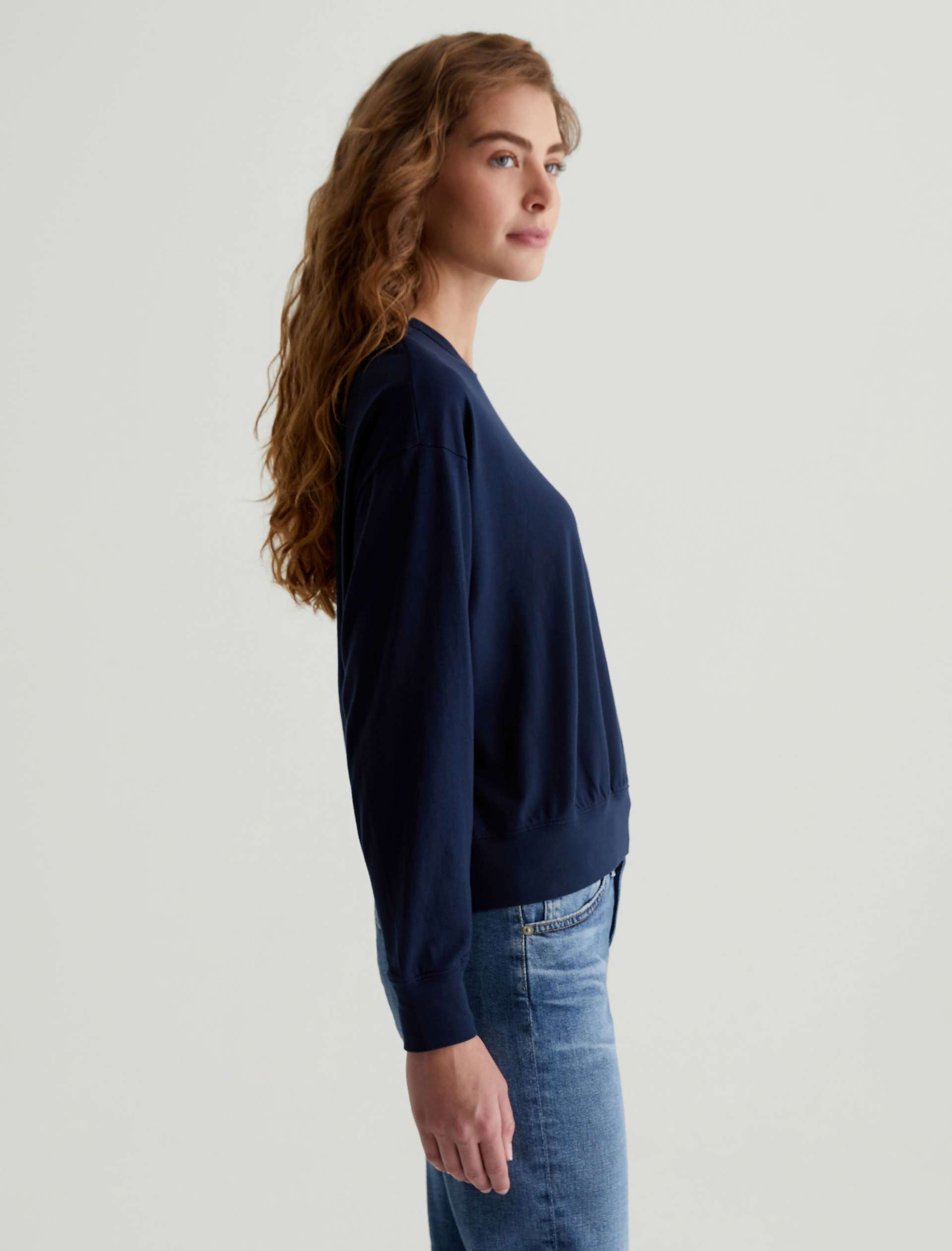 The Karter Pullover in deep navy is a new silhouette in our Basic Essentials collection. We borrowed the details of a sweatshirt including the rib binding, cuff, and bottom hem to make a great lightweight pullover. Our Jersey Knit offers a luxurious comfort that is unrivaled—knitted with both S-twist and Z-twist yarn t
