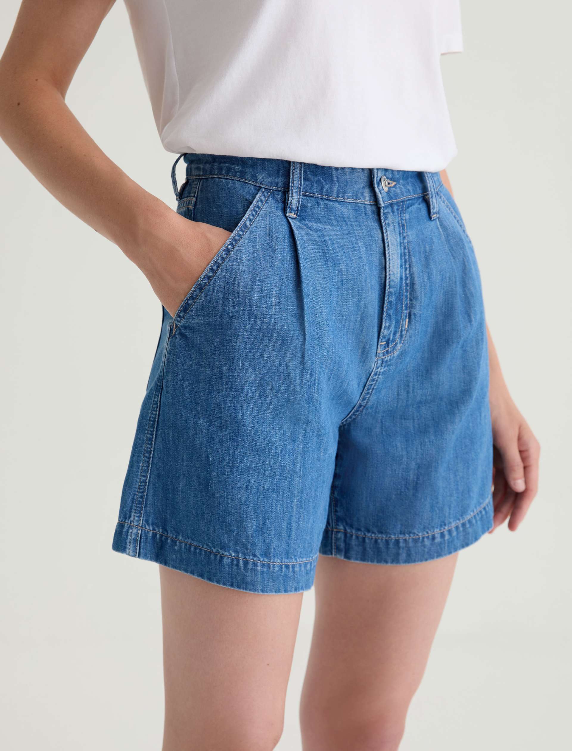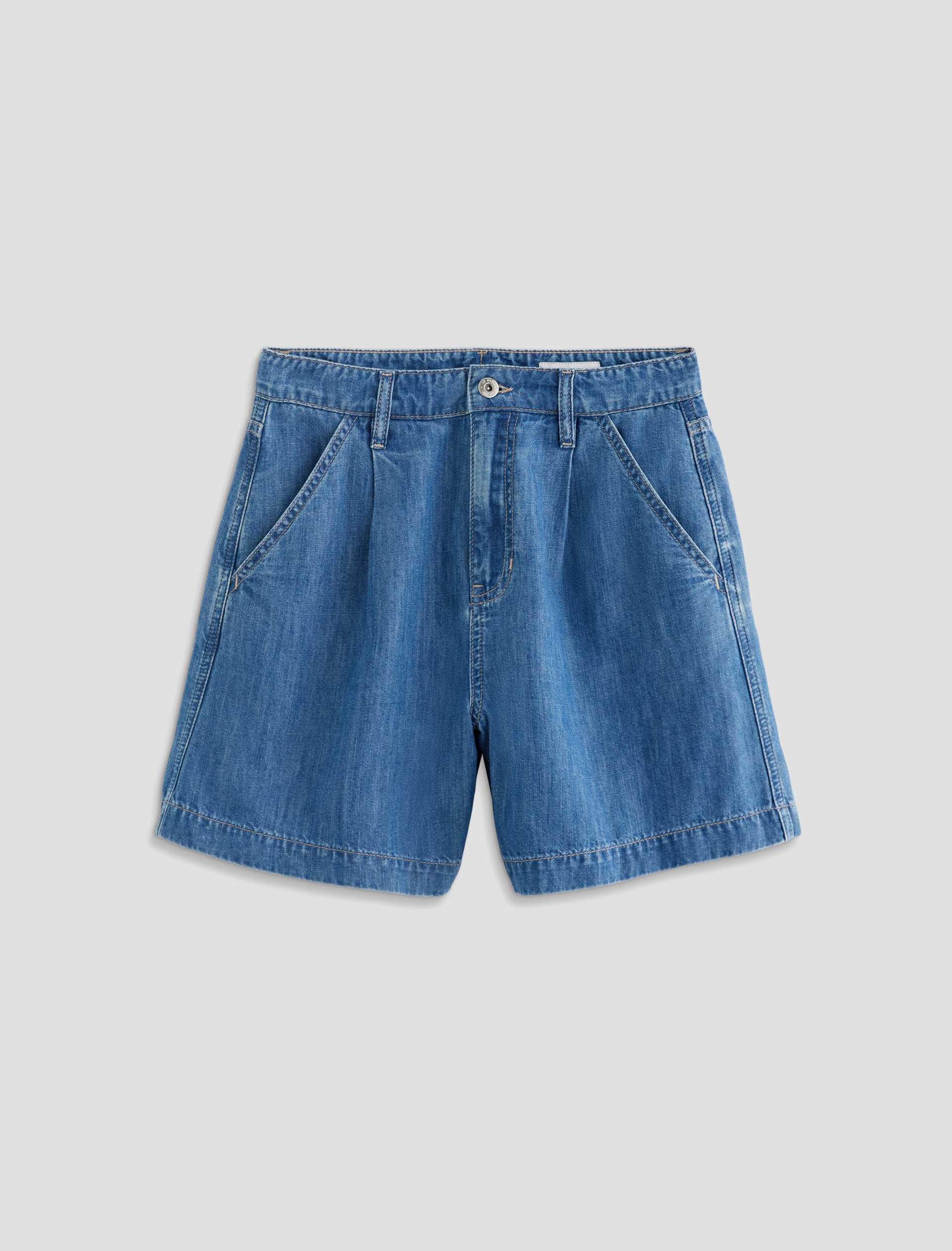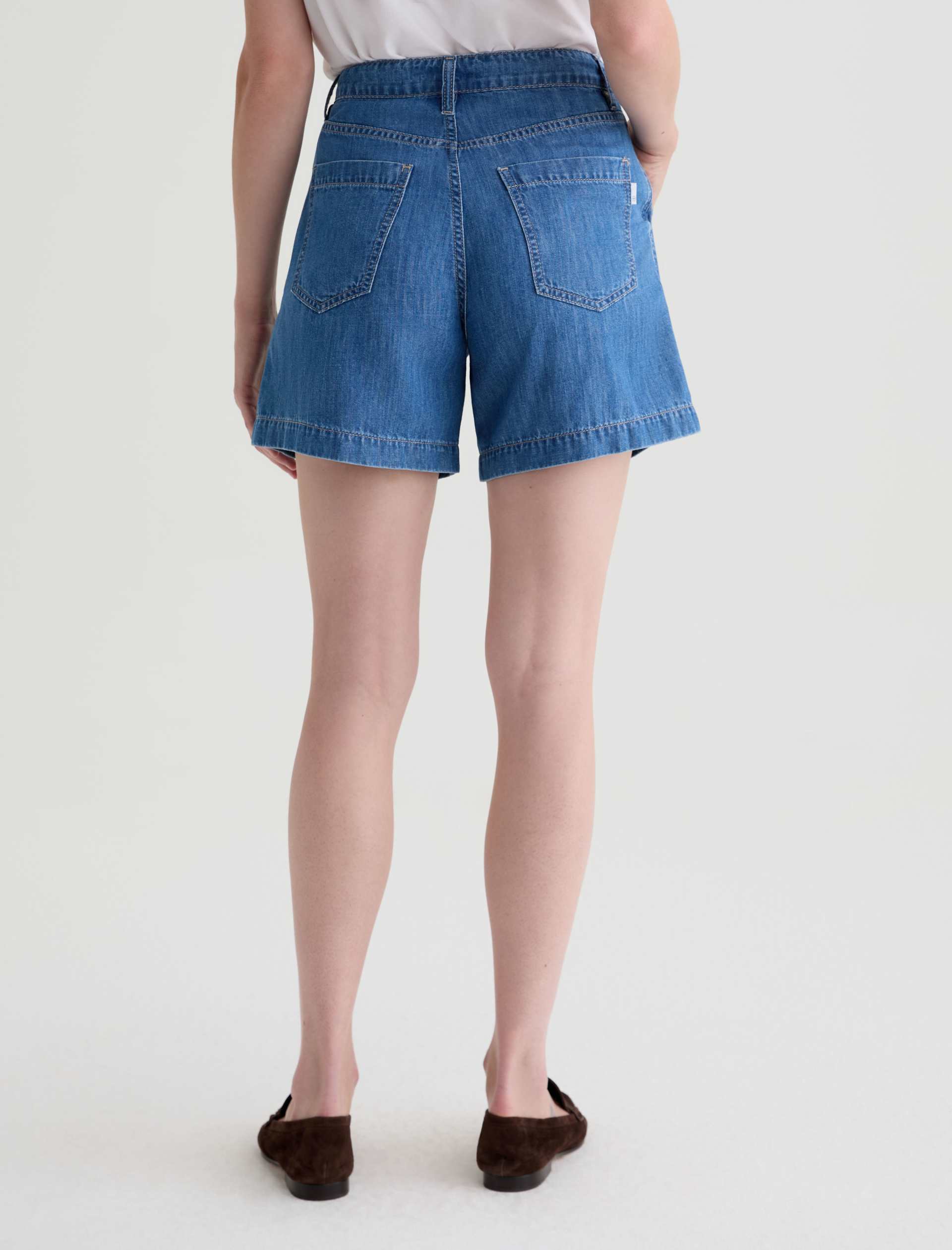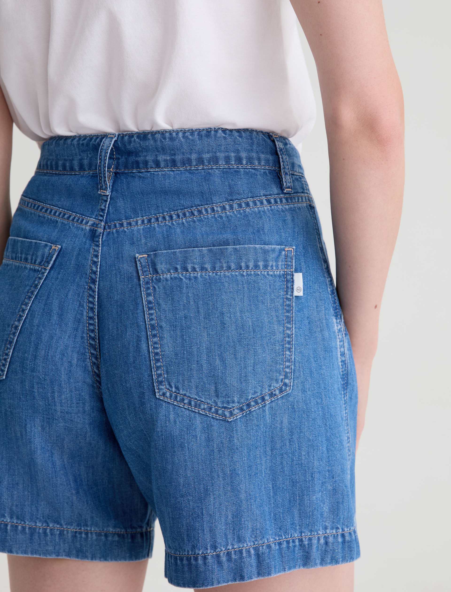 The Mandy Short is a high-rise style crafted from non-stretch Scarlett Irisblue Chambray in a medium blue wash. Designed with trouser pockets and clean stitched hems for a polished, structured look.