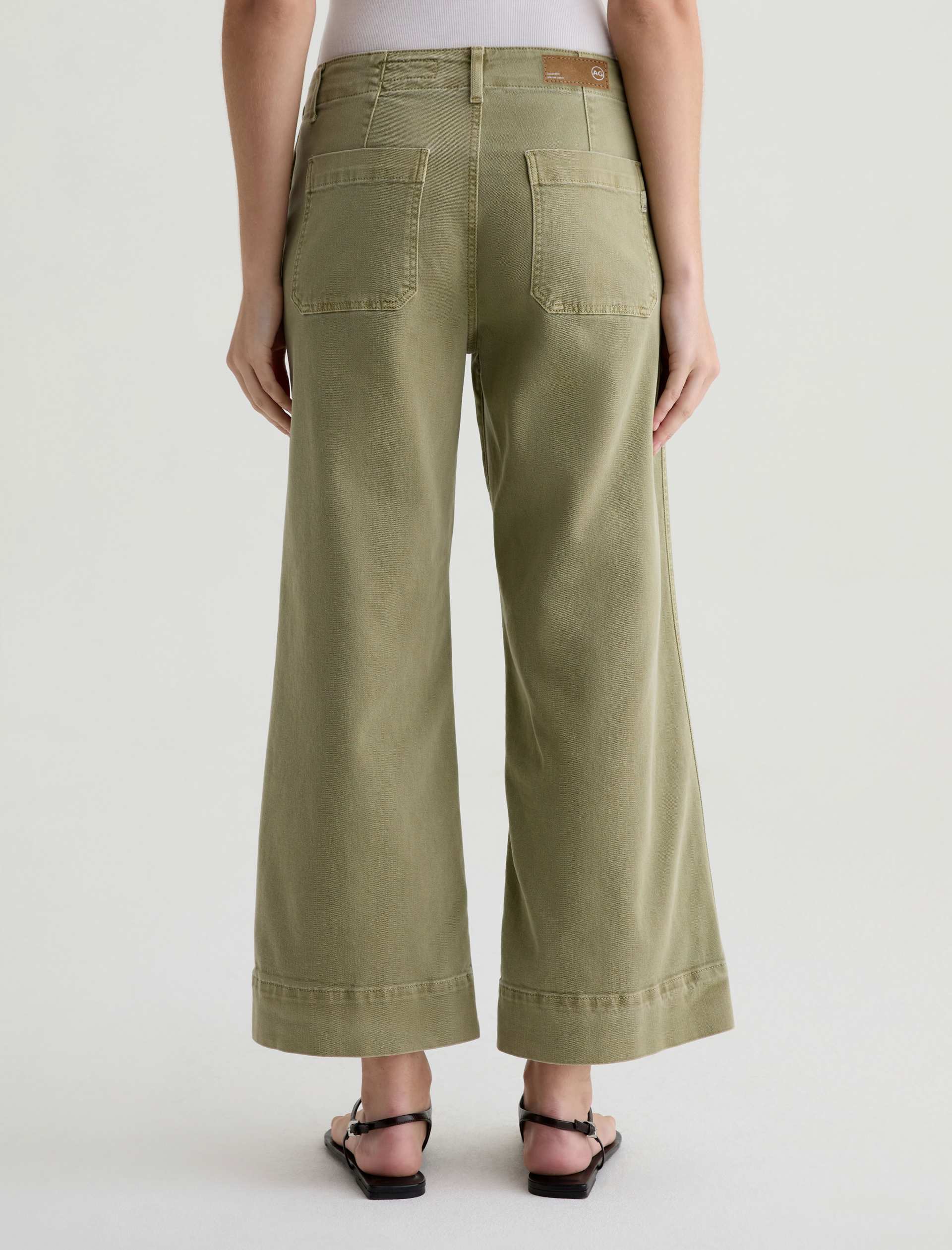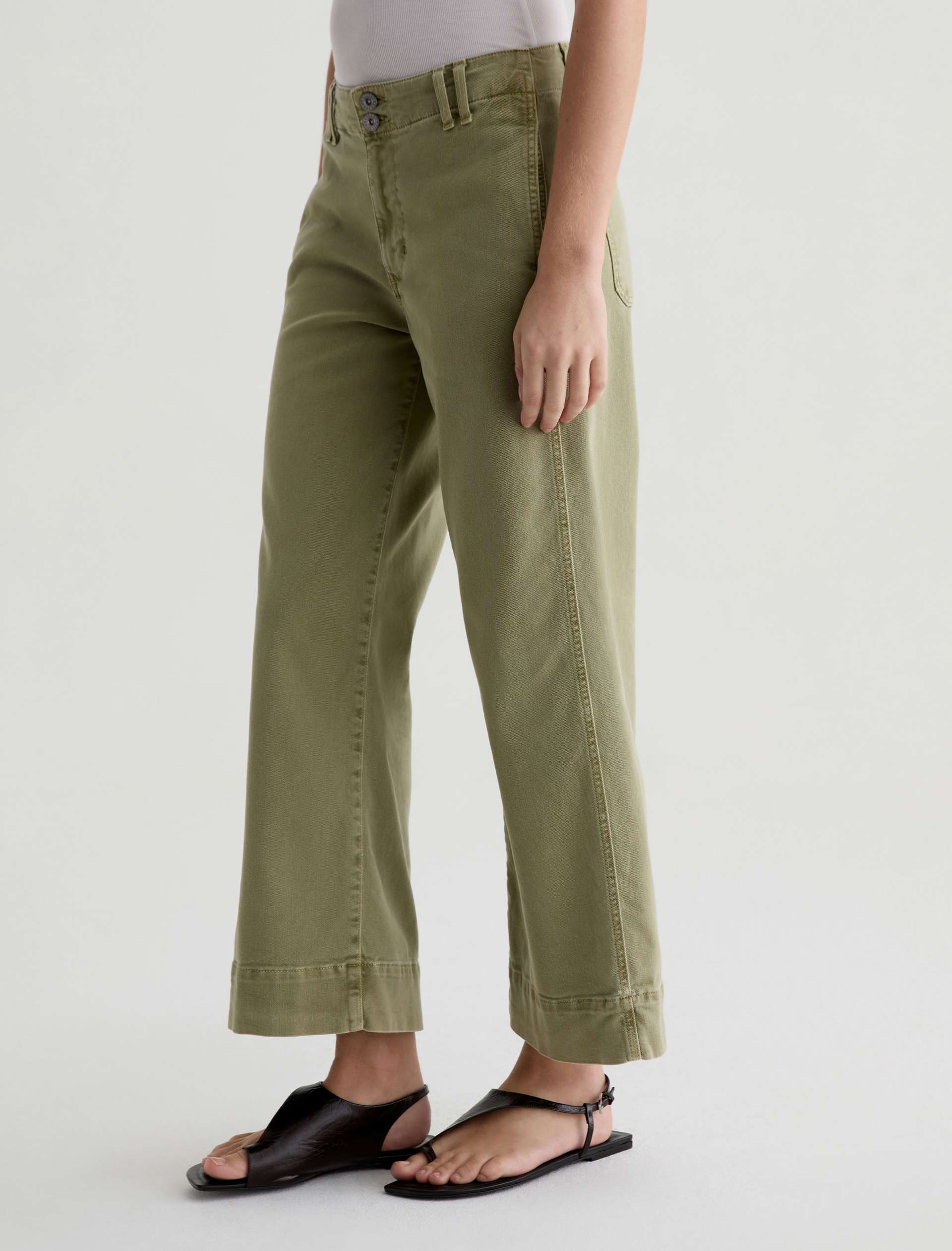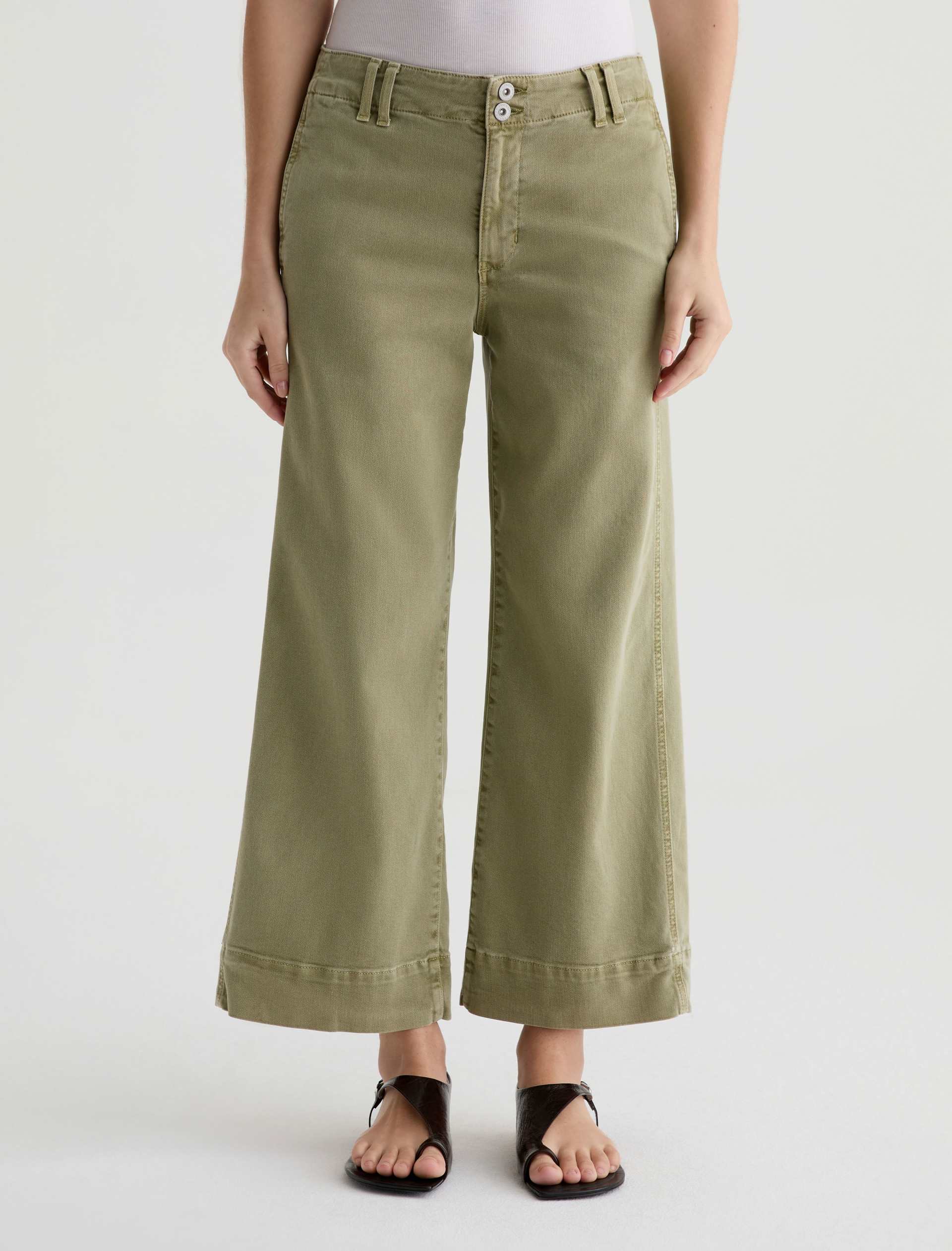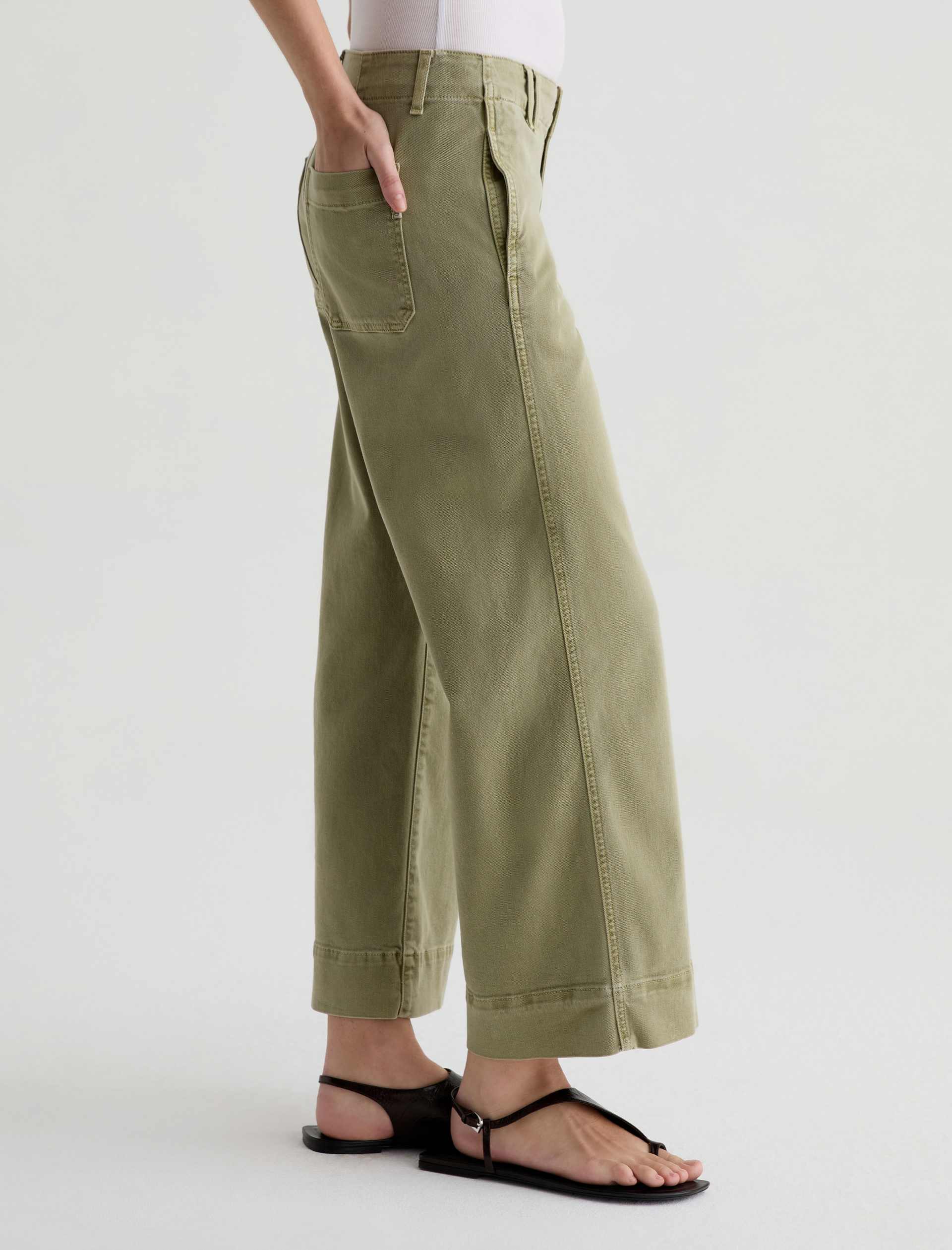 The Natasha is a mid-rise cropped wide-leg jean crafted from AG Cloud Soft Denim™ in a green comfort stretch wash. Designed with trouser pockets and double belt loops.