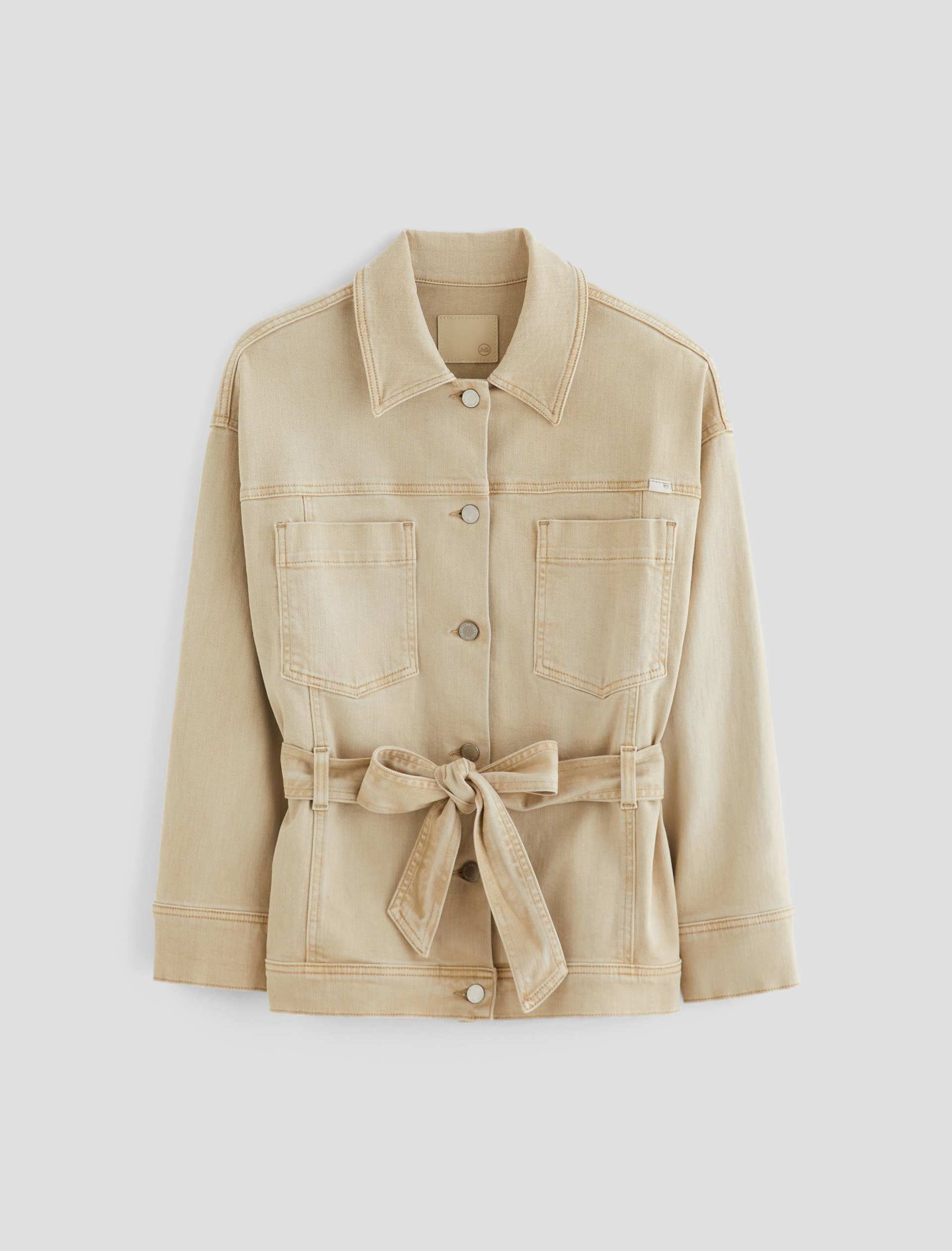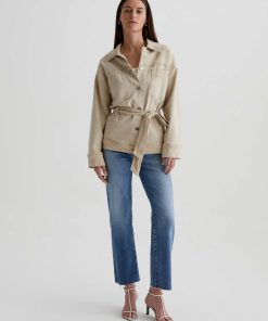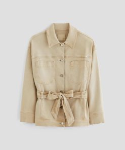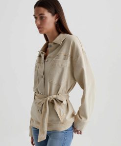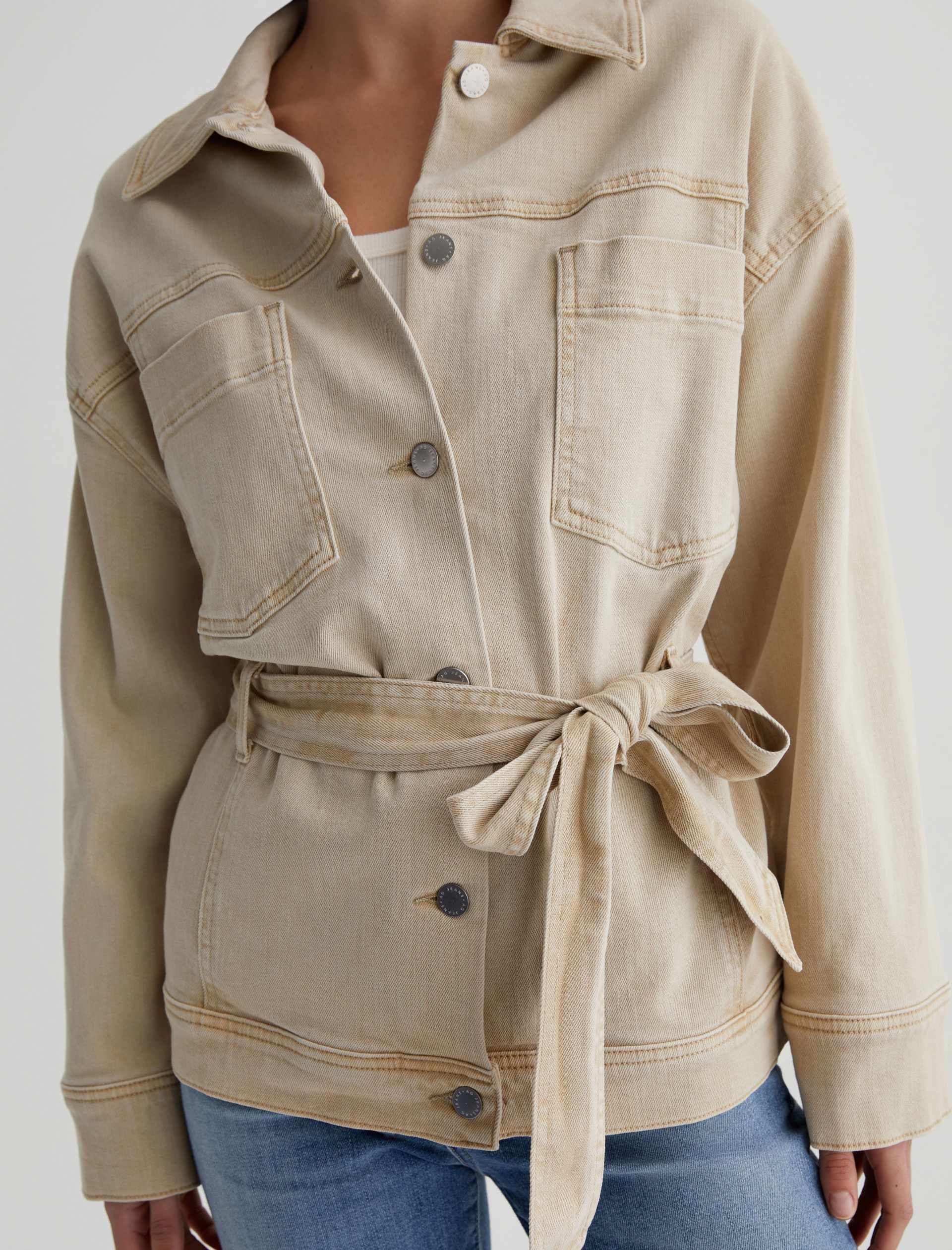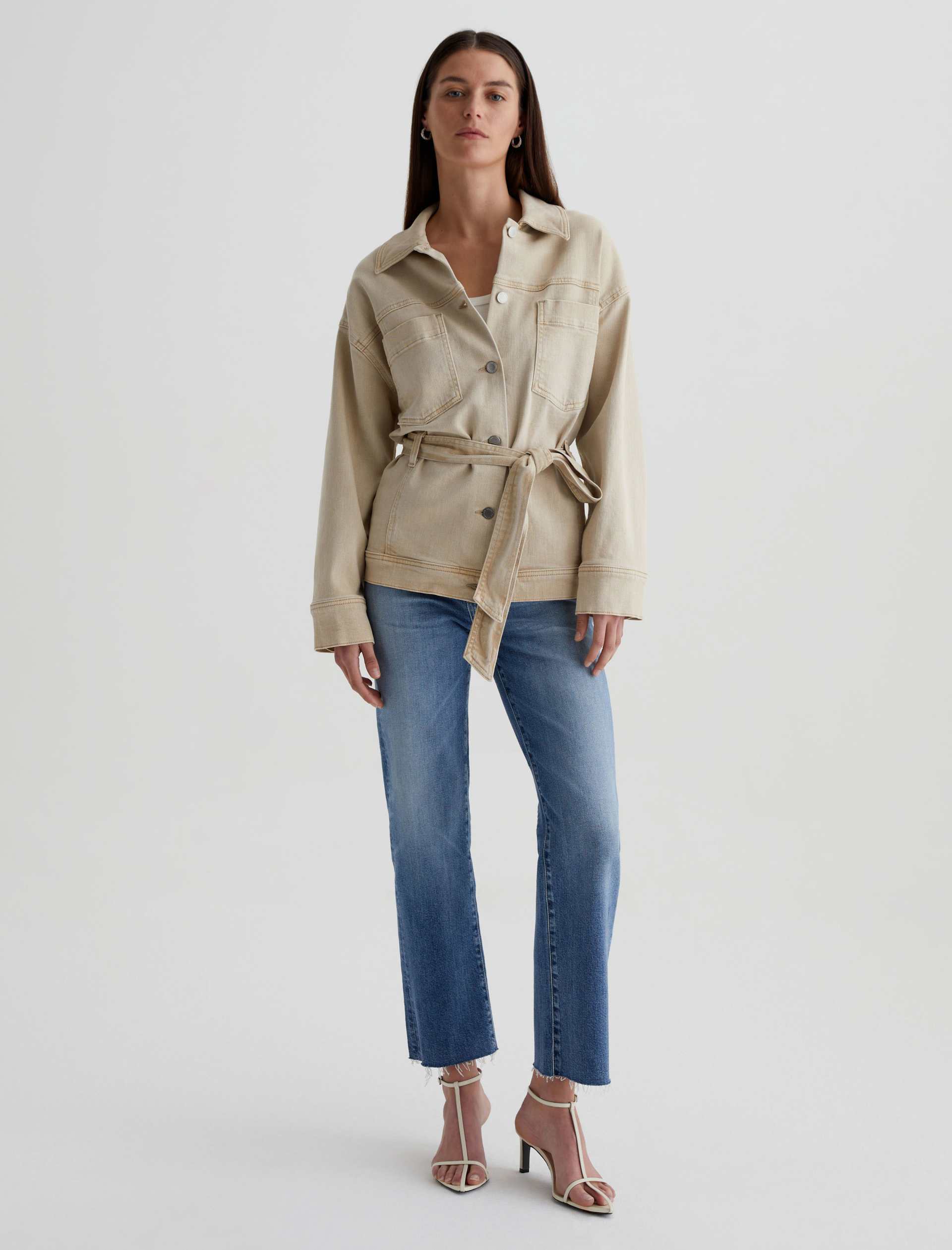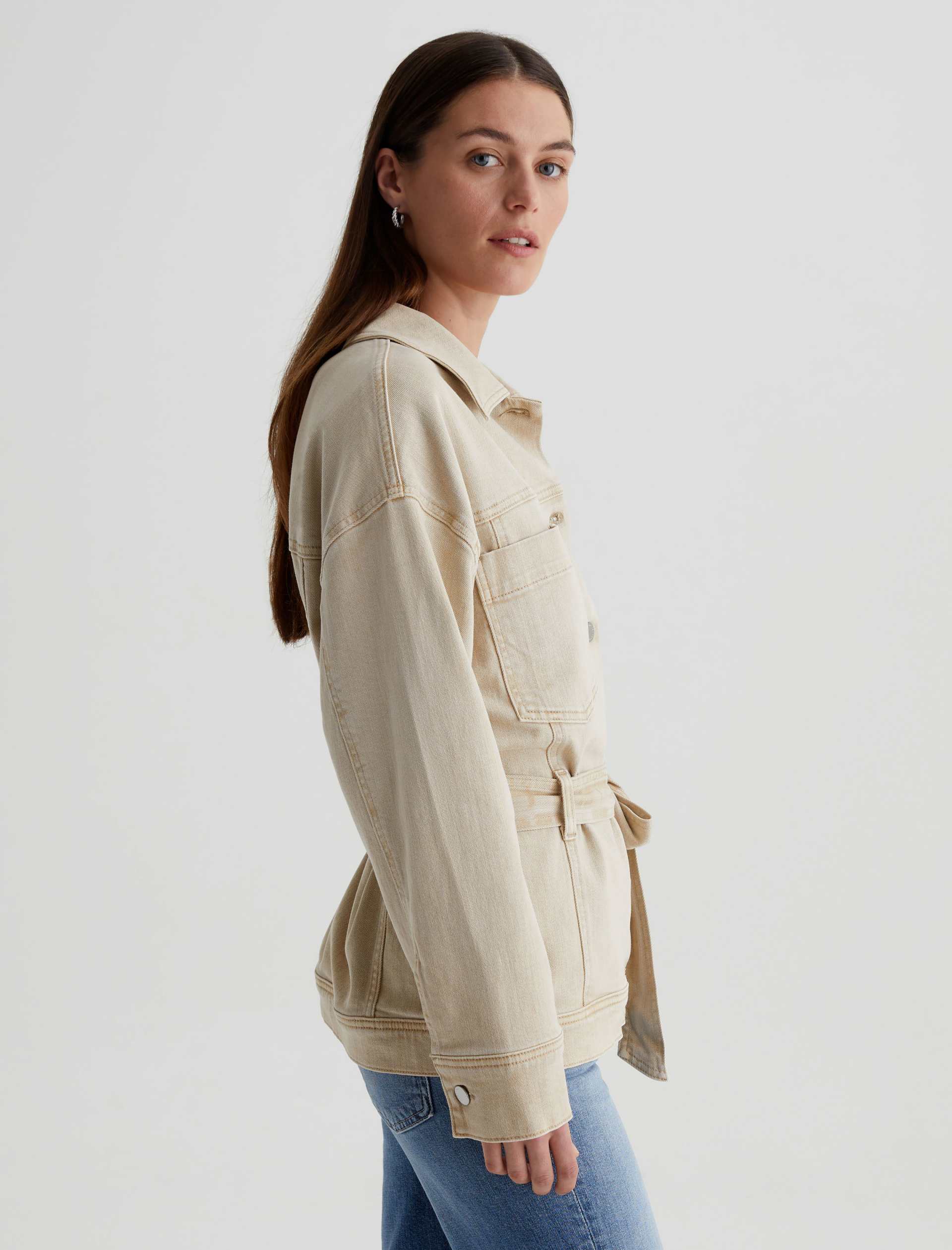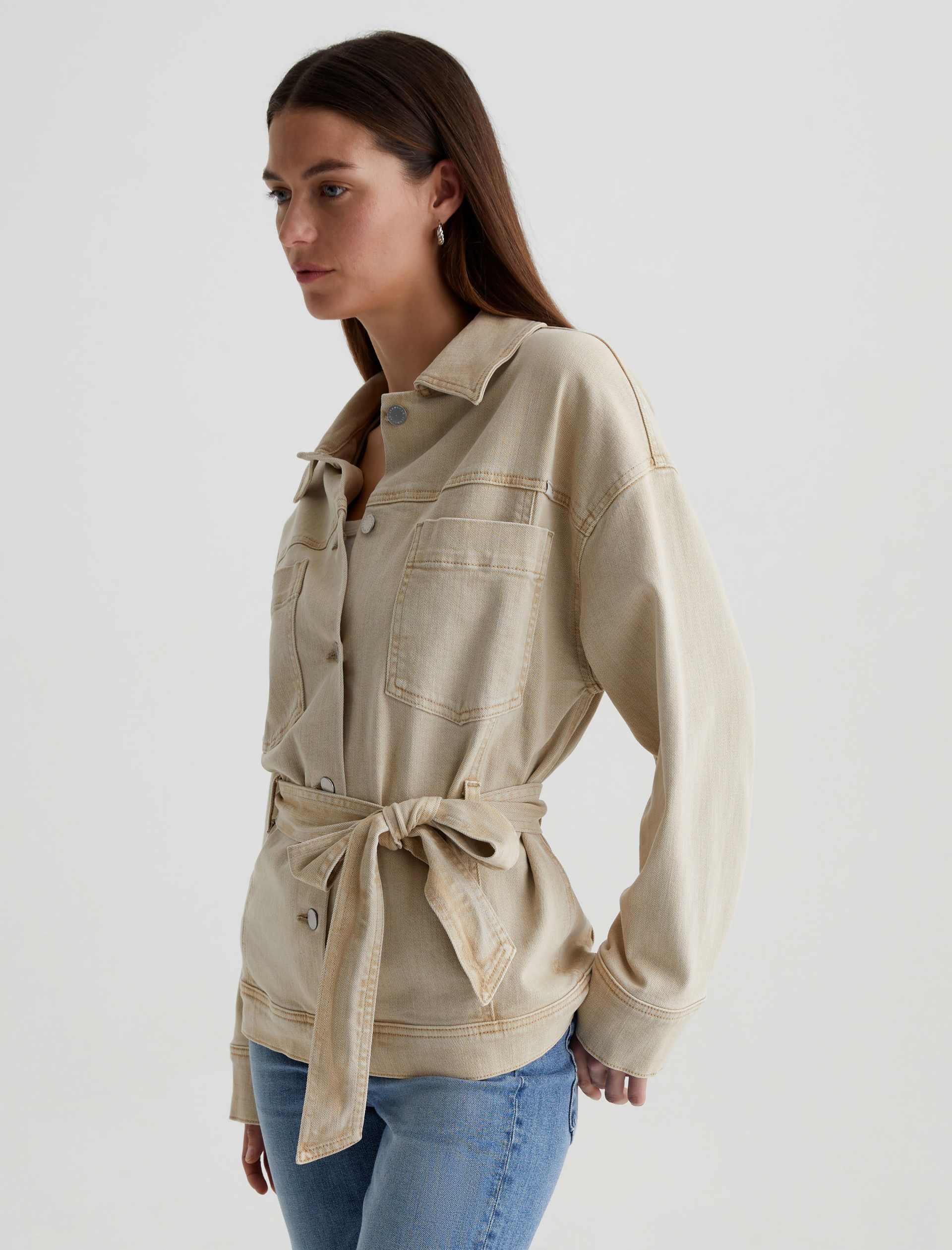 The Nora Jacket has utility-inspired patch pockets, dropped shoulders, and long sleeves with buttoned cuffs. Crafted from 10 oz. Daytripper Stretch Raw Denim, it’s sulfur-dyed for a faded natural shade and cinched by an optional tie belt at the waist.