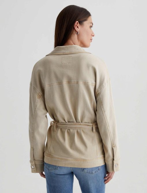 The Nora Jacket has utility-inspired patch pockets, dropped shoulders, and long sleeves with buttoned cuffs. Crafted from 10 oz. Daytripper Stretch Raw Denim, it’s sulfur-dyed for a faded natural shade and cinched by an optional tie belt at the waist.