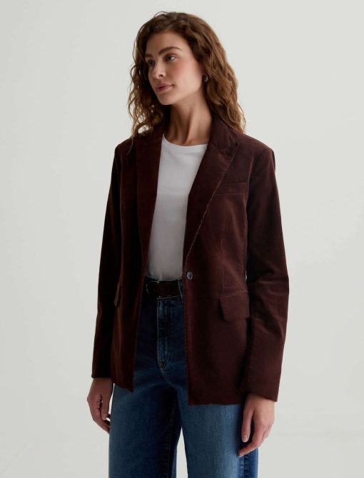 The Rue Corduroy Blazer brings a polished finish to any look. Done in a rich brown shade, it’s soft to the touch and blended with a bit of stretch. This tailored style looks sharp in a fitted silhouette with peaked lapels, flap pockets, and a single button at the front.