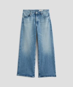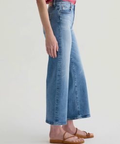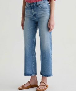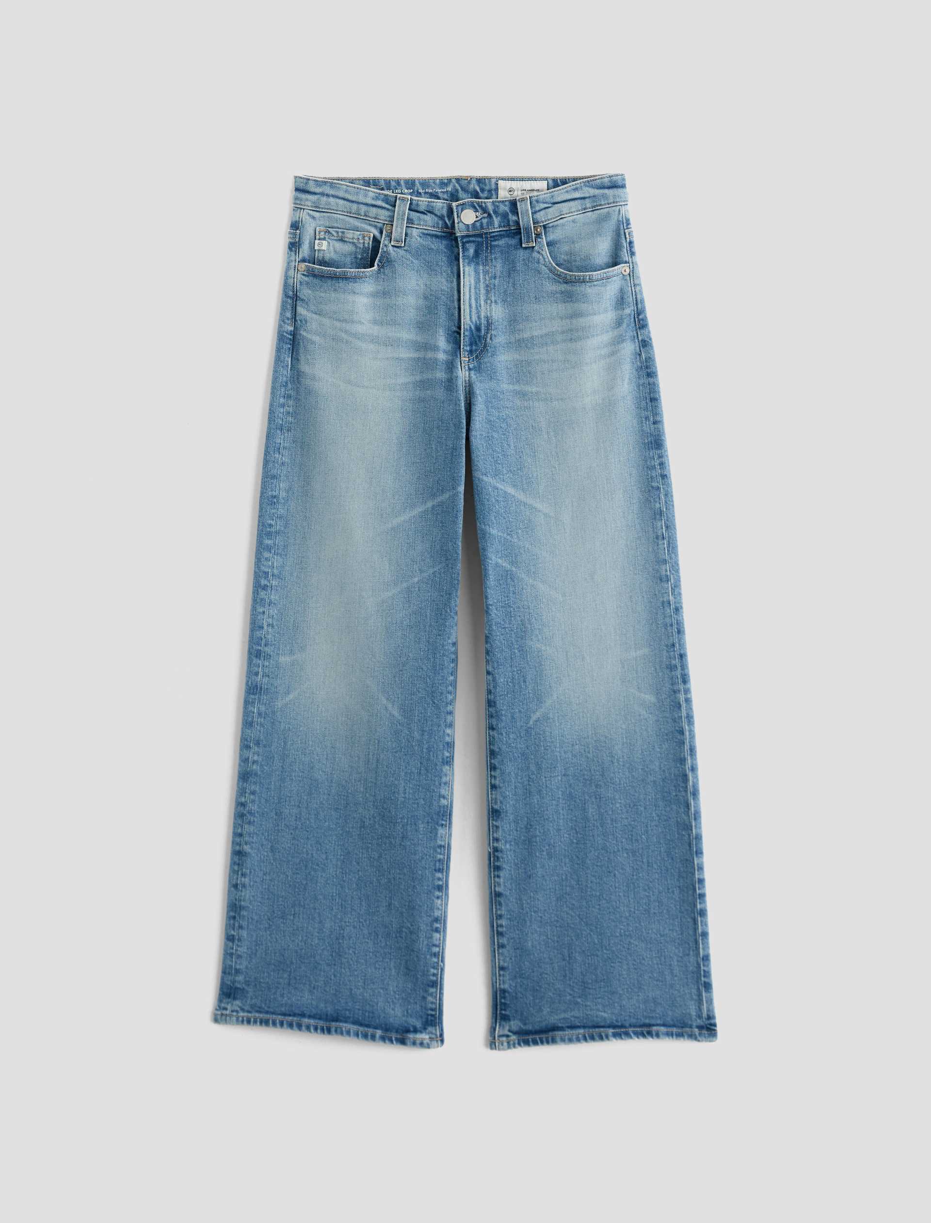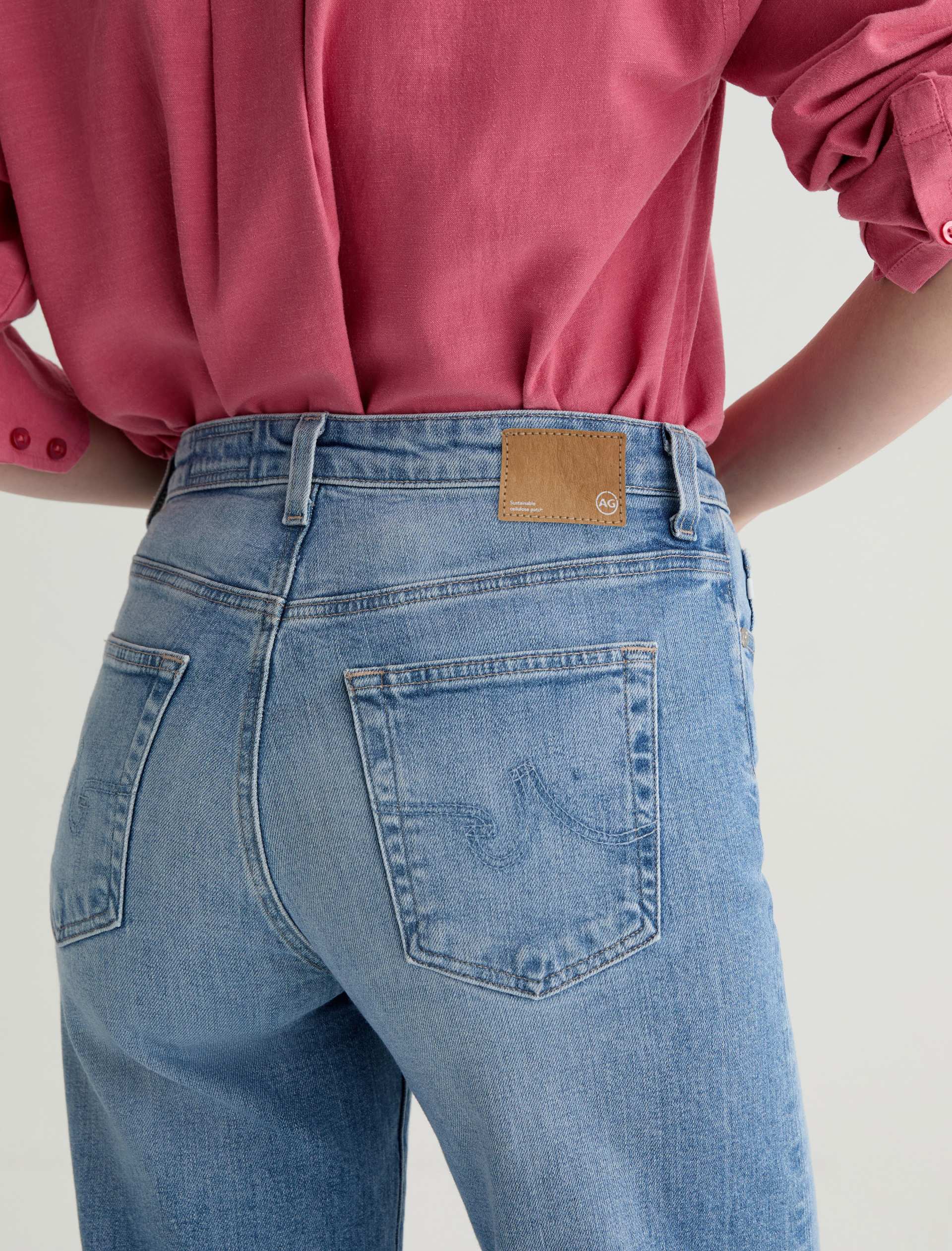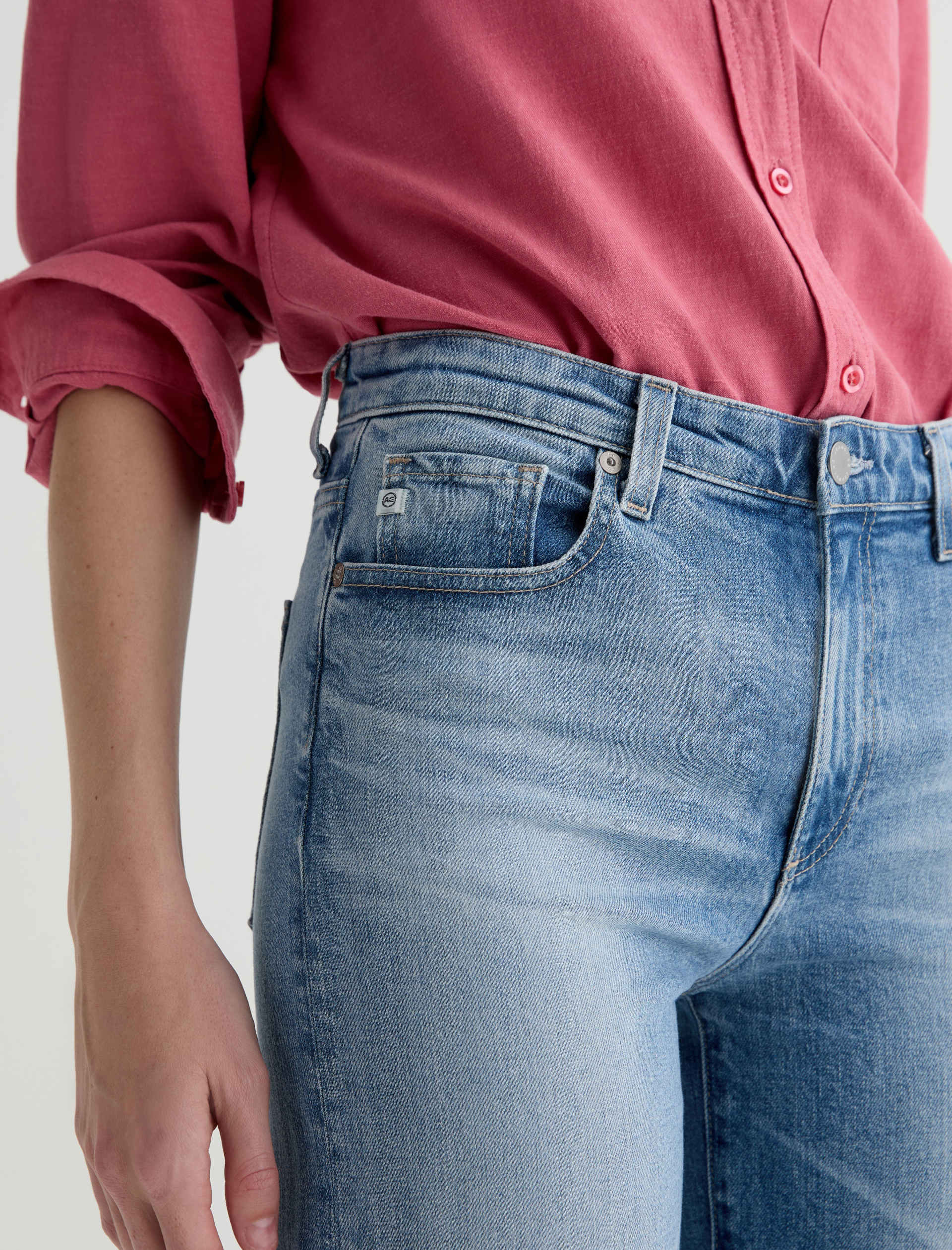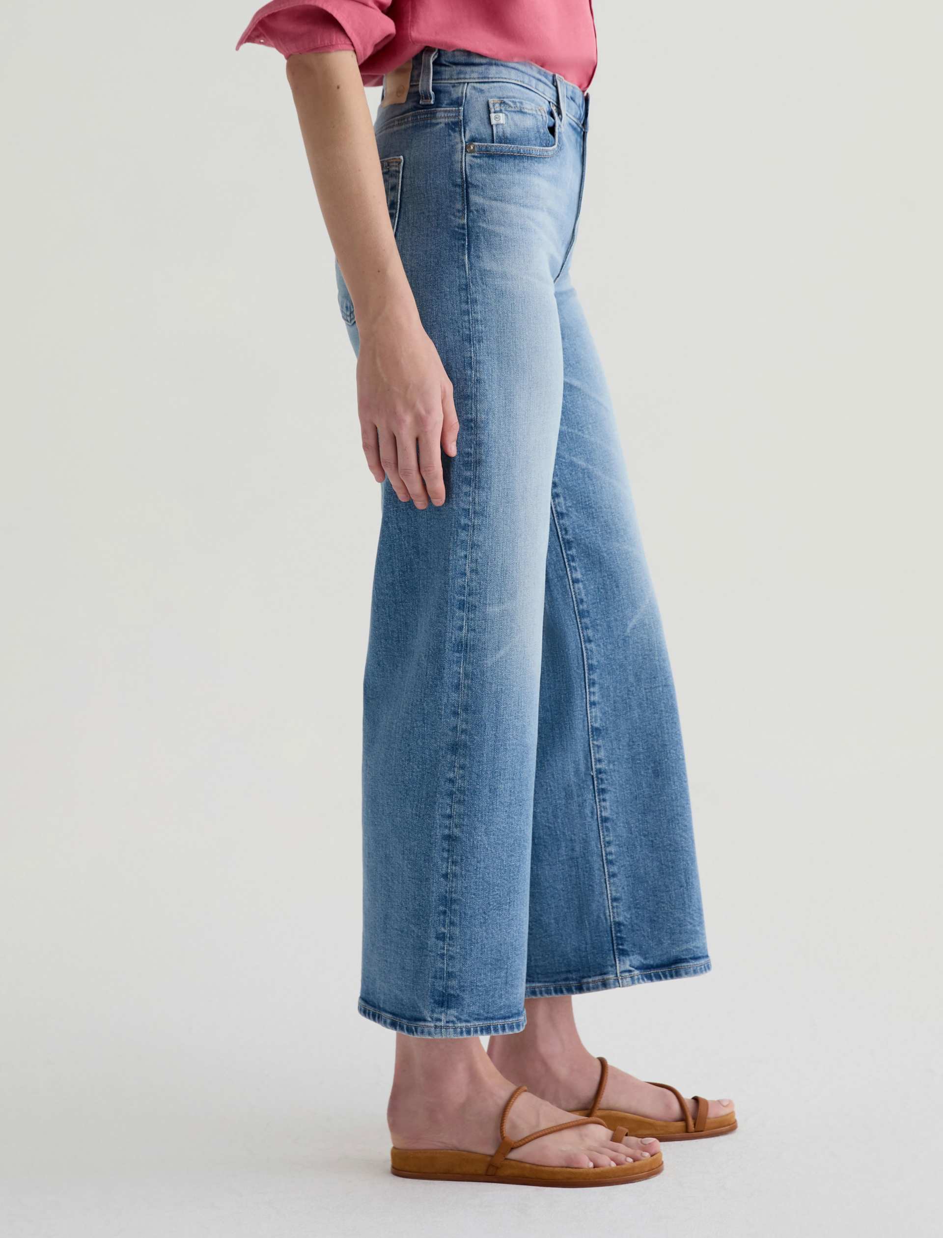 The Saige Wide-Leg crop is a high-rise jean with a wide-leg silhouette and clean hems. This five-pocket style offers a relaxed yet structured look. Crafted from 11.75 oz. Vintage Comfort Stretch Denim, the pair comes in a Helios light wash.