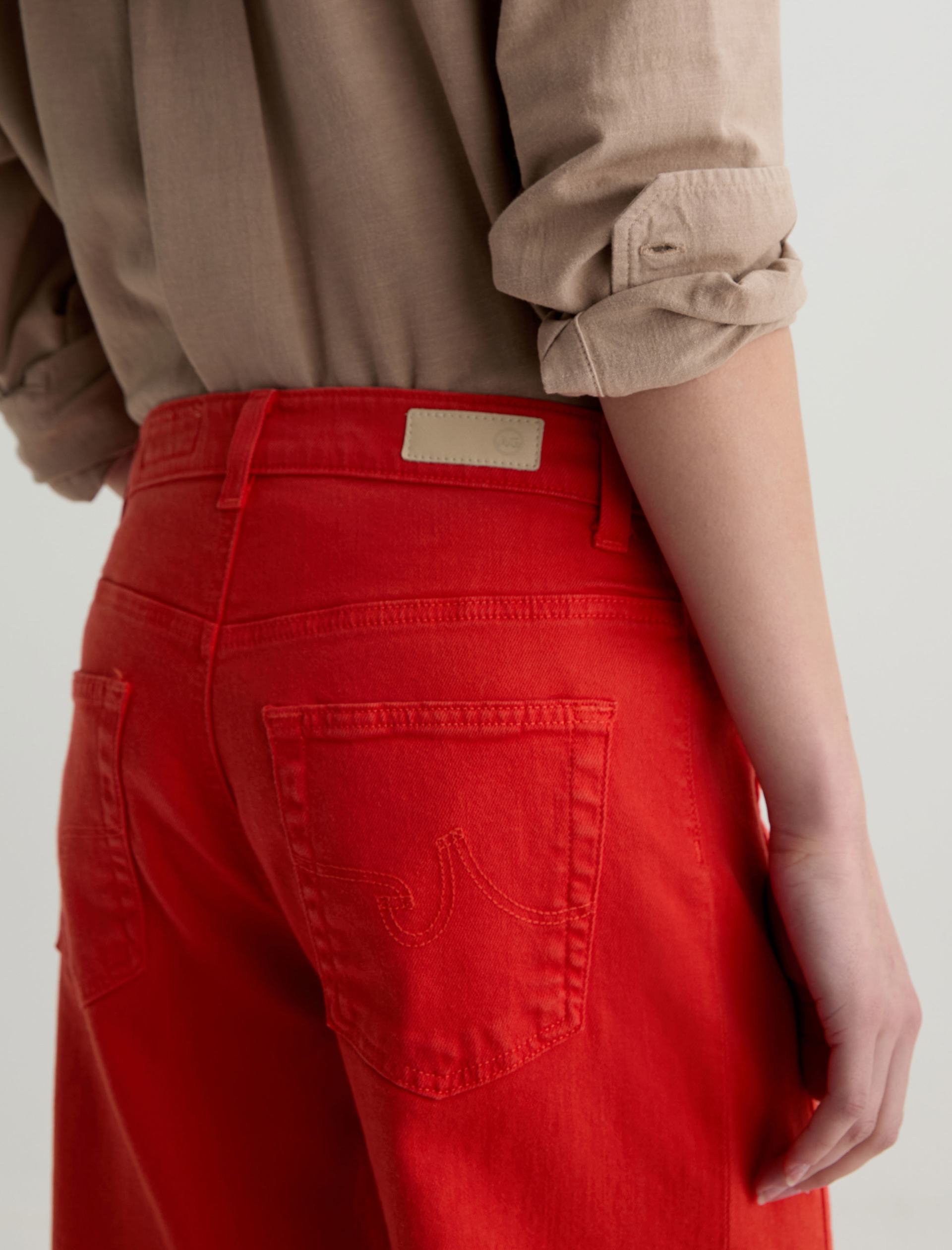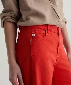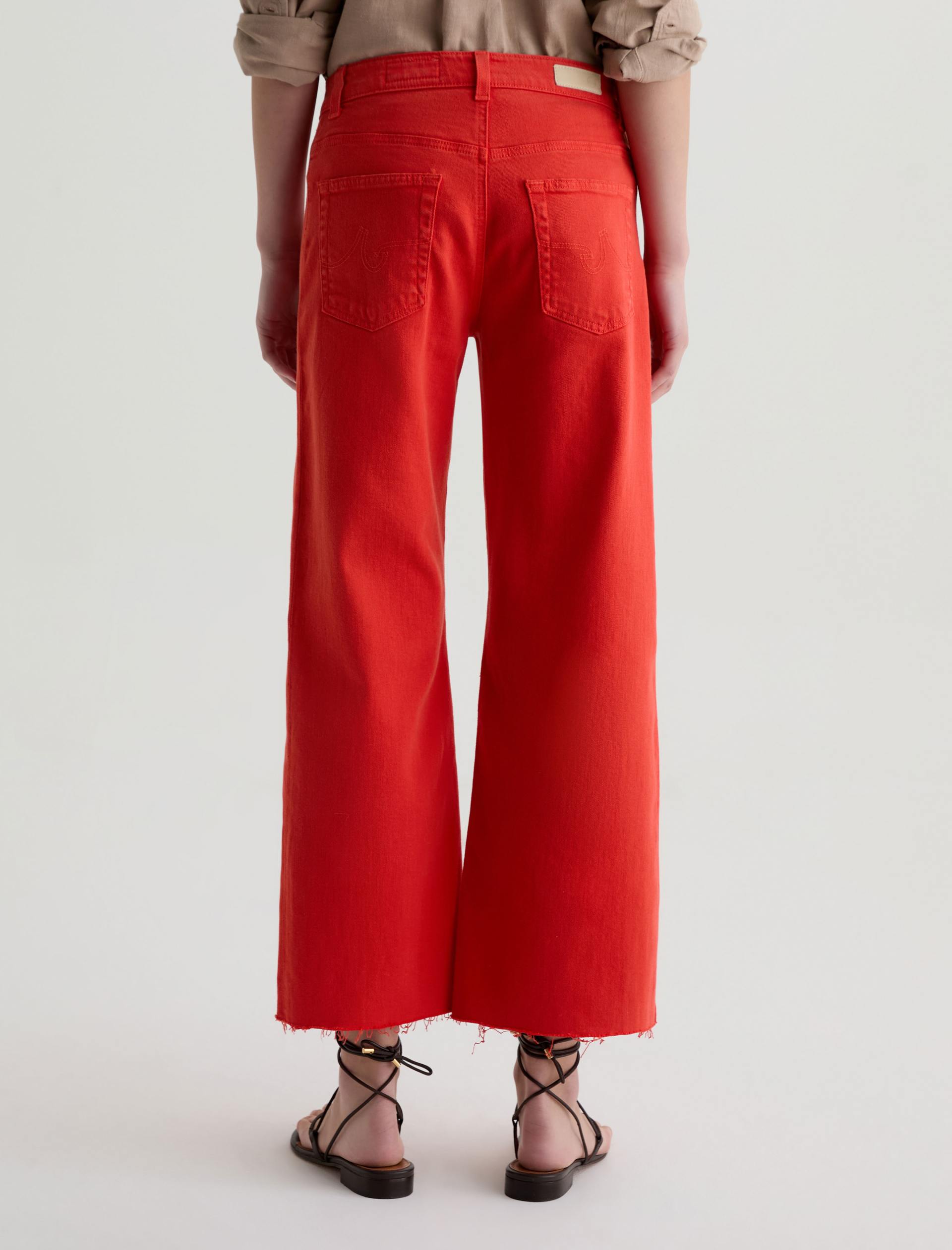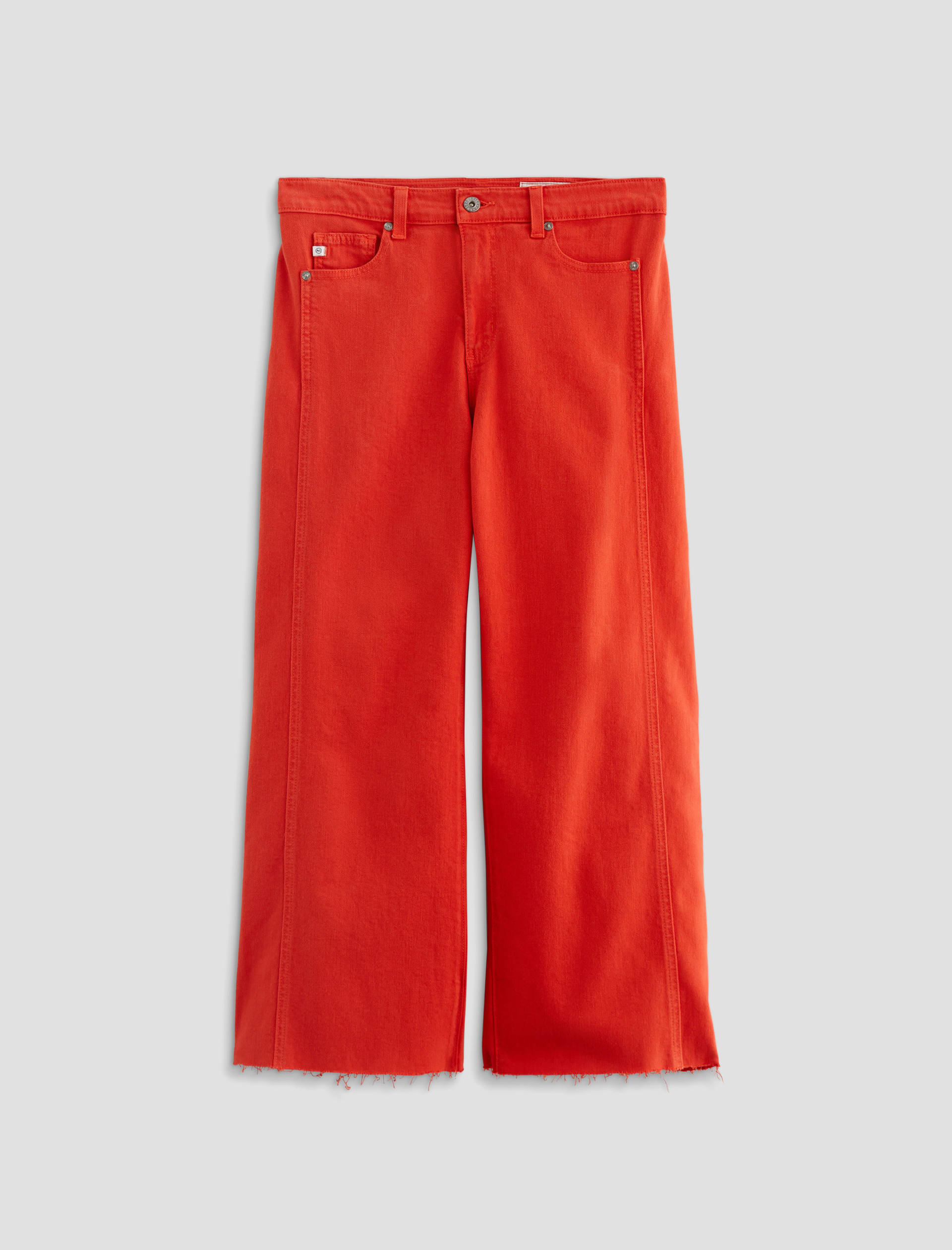 The Saige Wide-Leg Crop with Panel is a mid-rise style with a 27” inseam. Crafted from Japanese comfort stretch denim in a burnt orange hue, it features side panels that connect to the pocket scoop, giving it a more streamlined look.