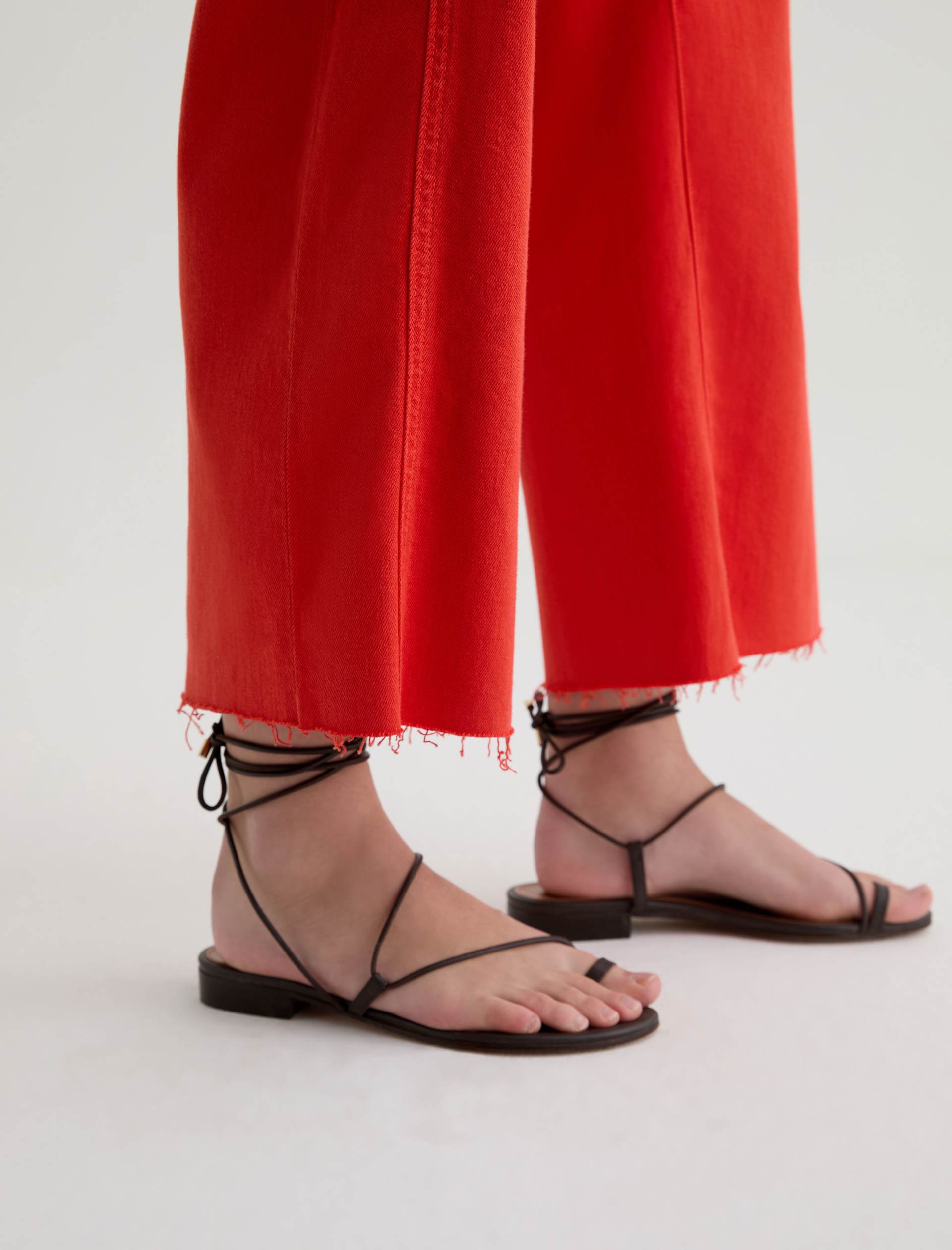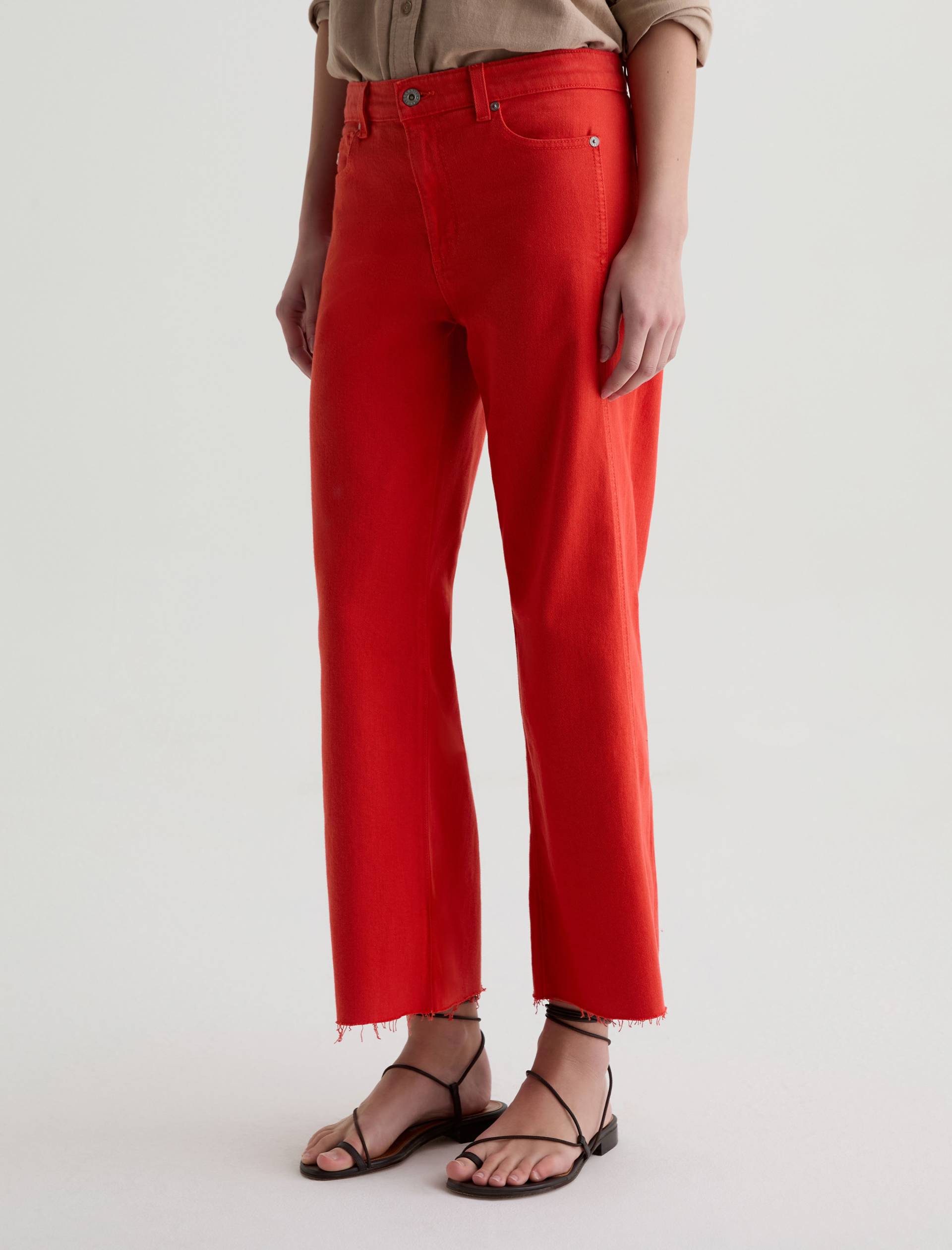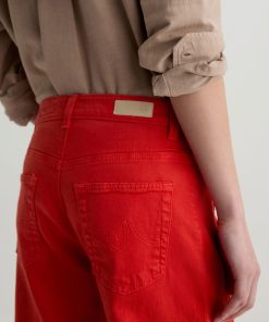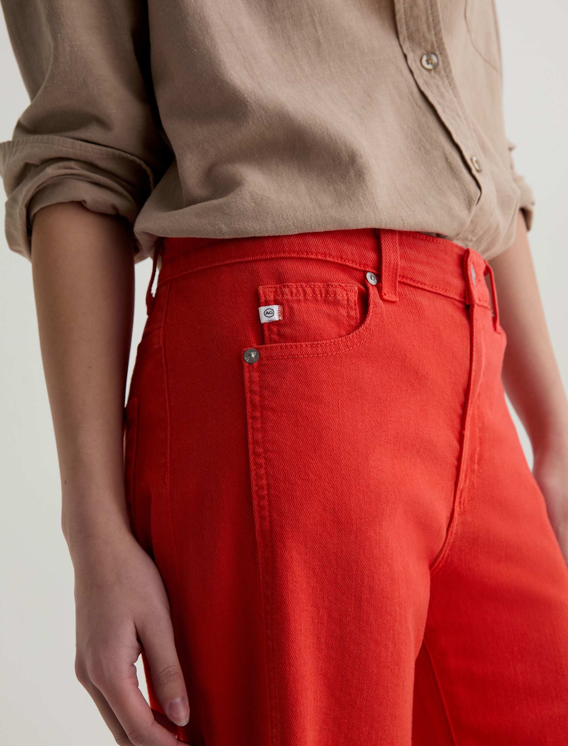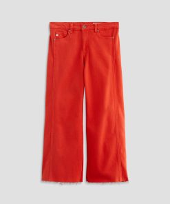 The Saige Wide-Leg Crop with Panel is a mid-rise style with a 27” inseam. Crafted from Japanese comfort stretch denim in a burnt orange hue, it features side panels that connect to the pocket scoop, giving it a more streamlined look.
