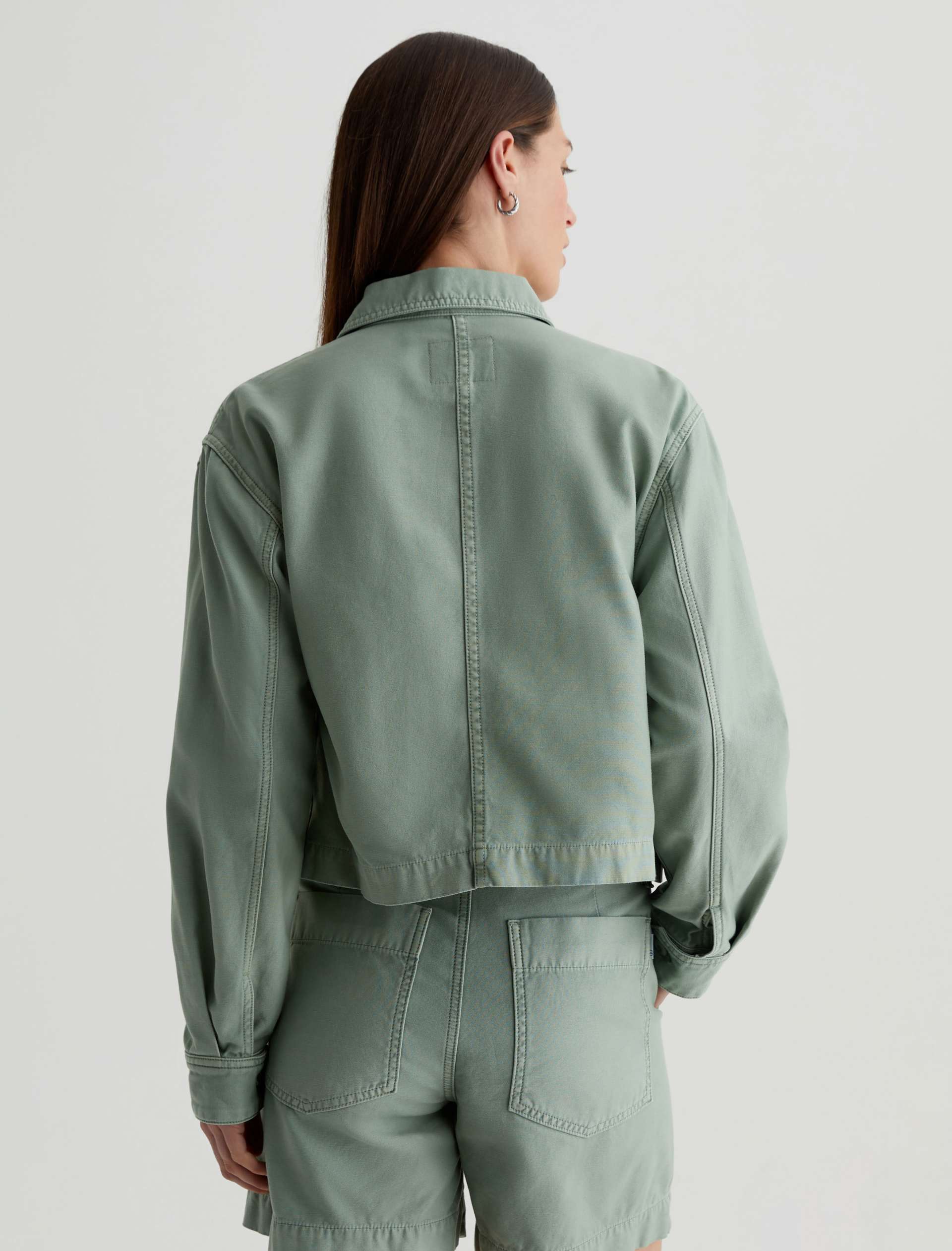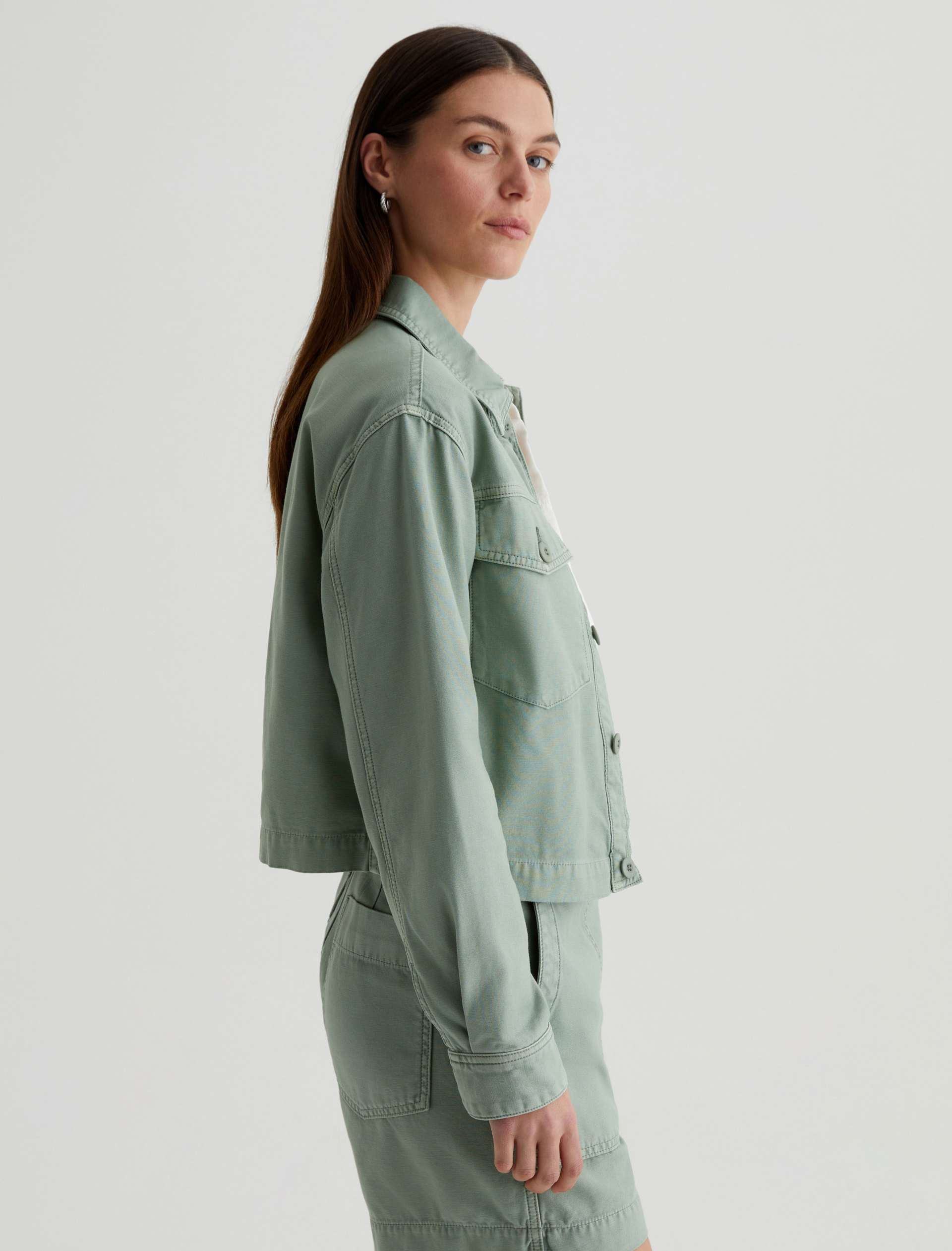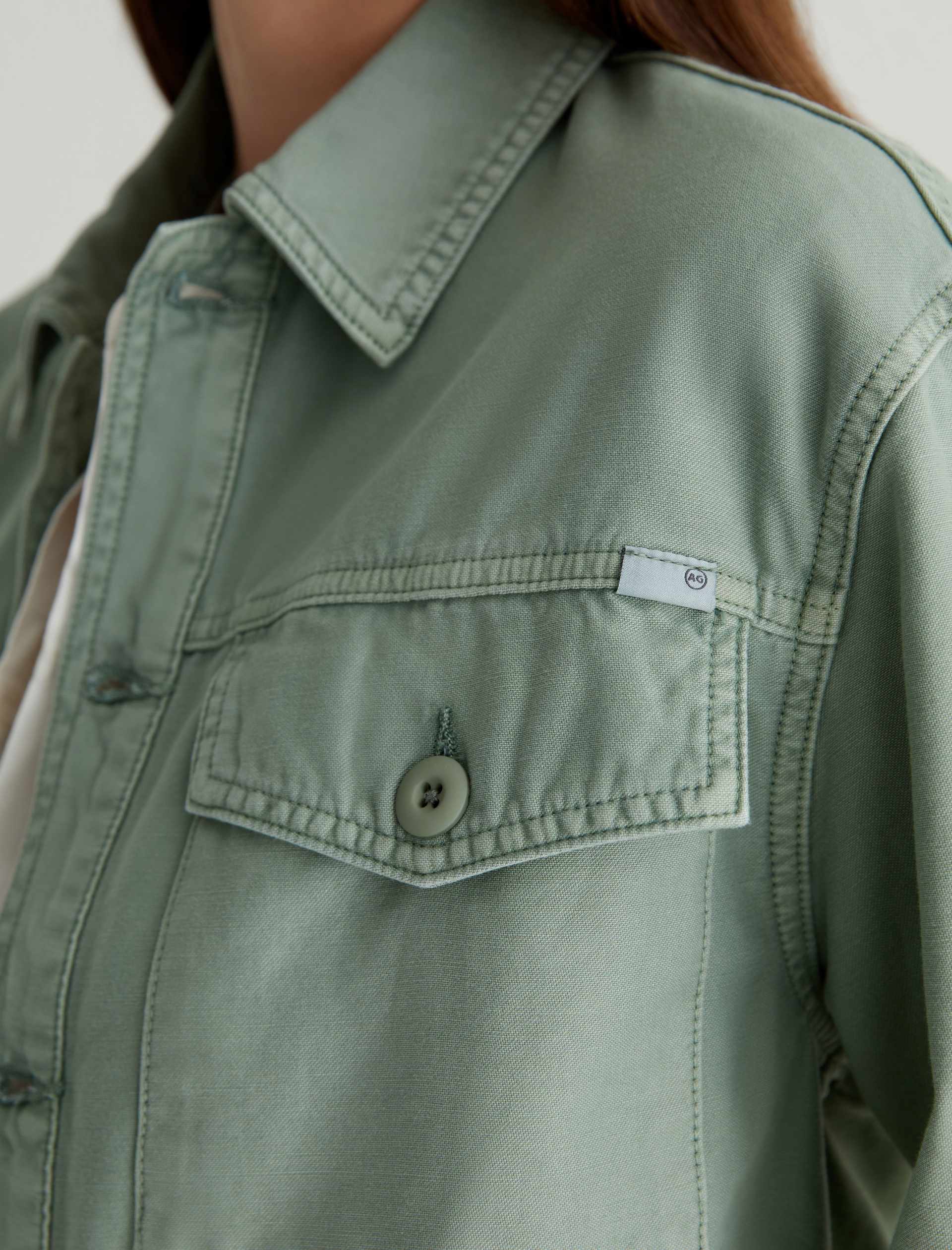 A cropped version of the classic utility shirt jacket, the Valleta layers with ease but also wears well on its own. This long-sleeve style comes in pale-green Sternway Reverse Sateen and features button-through flap pockets at the front.
