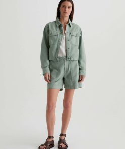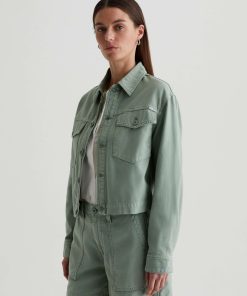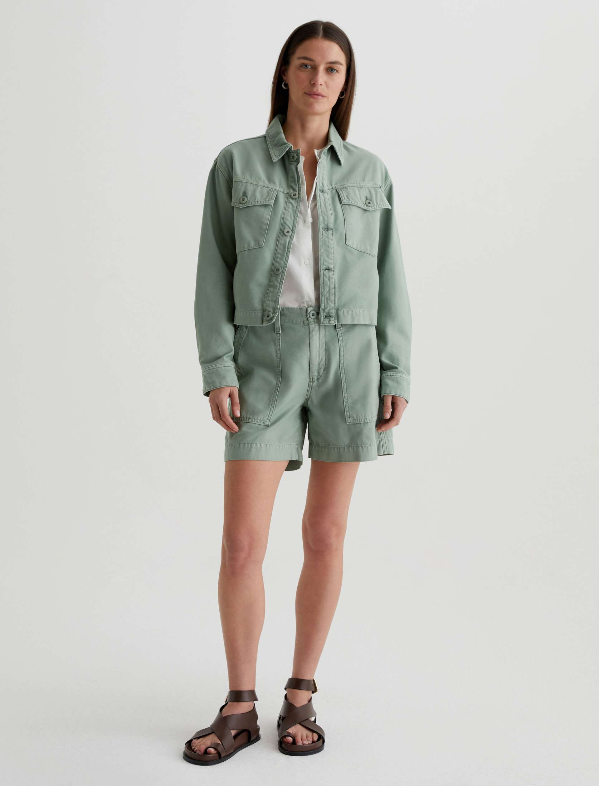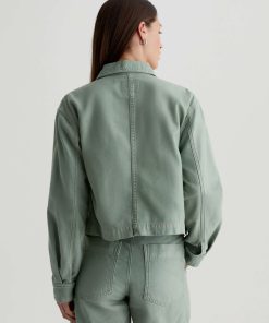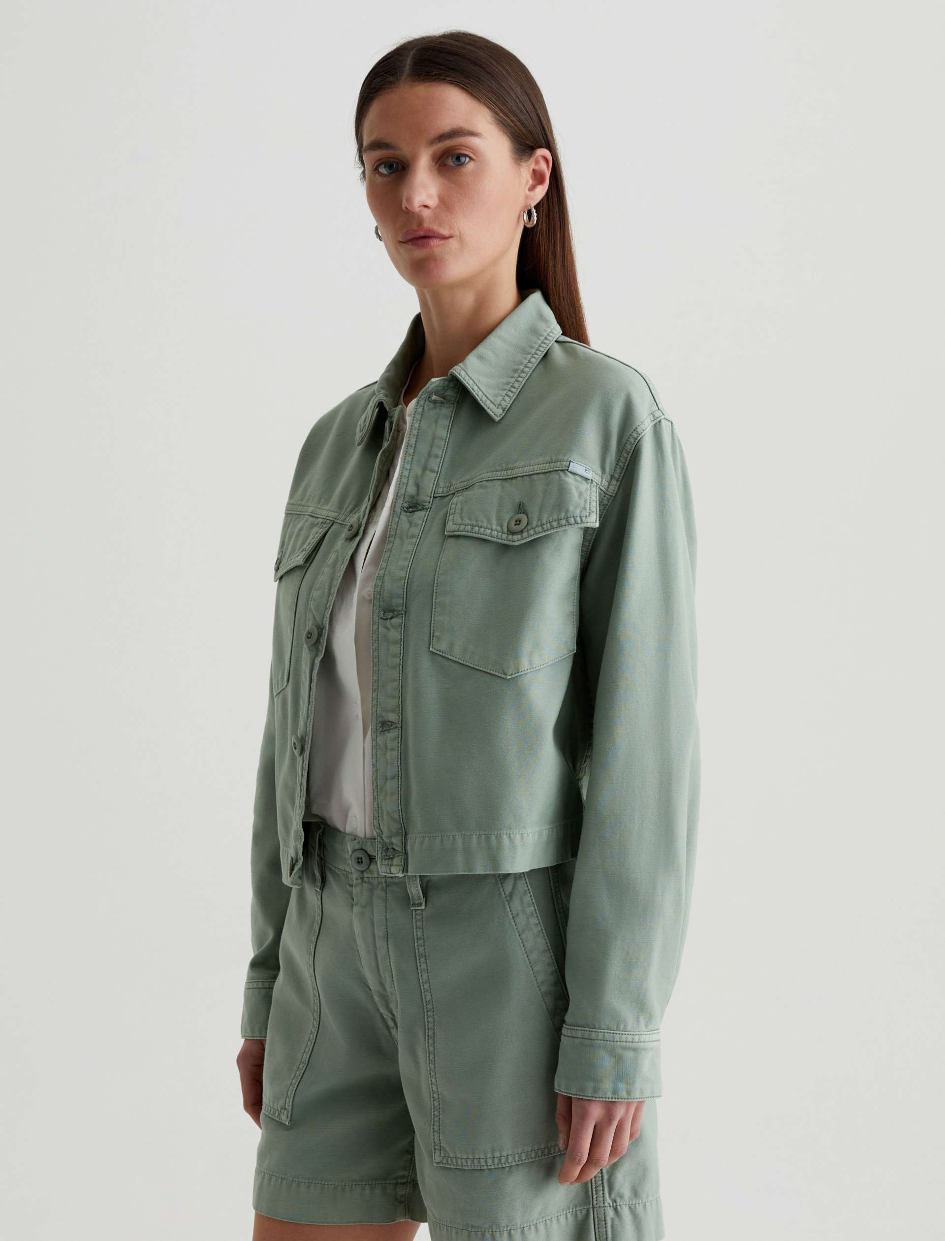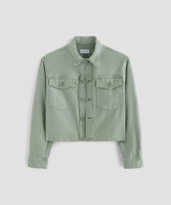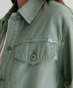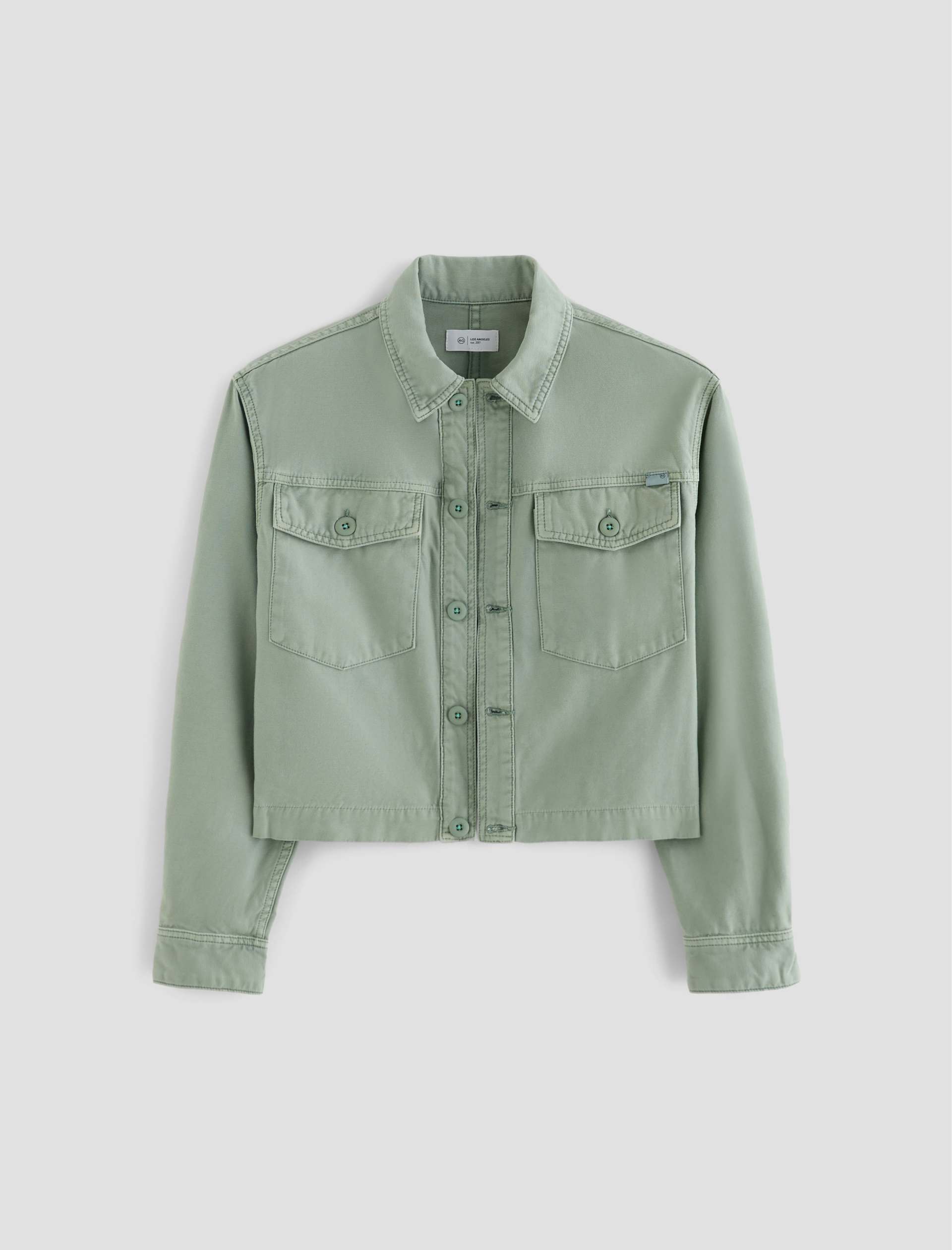 A cropped version of the classic utility shirt jacket, the Valleta layers with ease but also wears well on its own. This long-sleeve style comes in pale-green Sternway Reverse Sateen and features button-through flap pockets at the front.